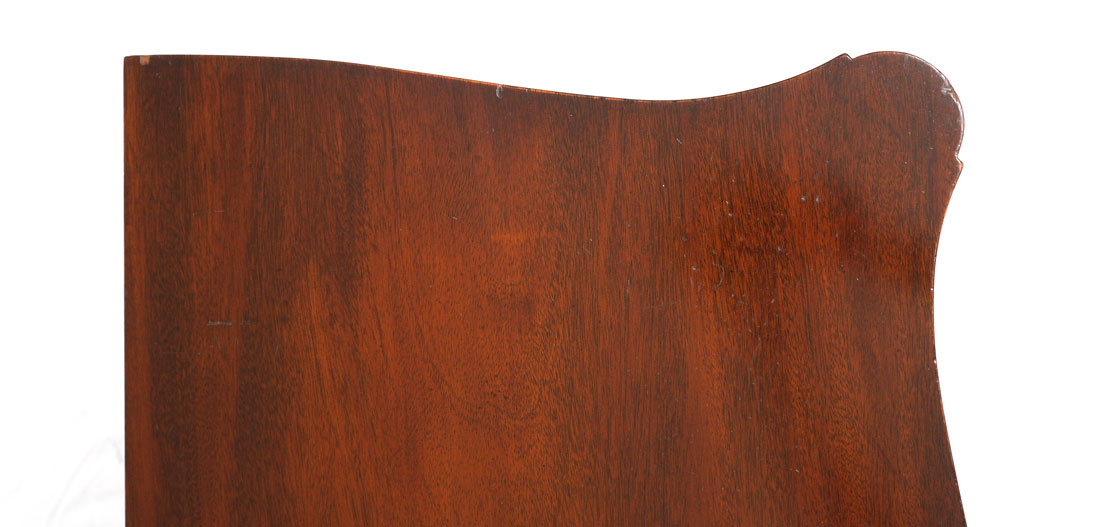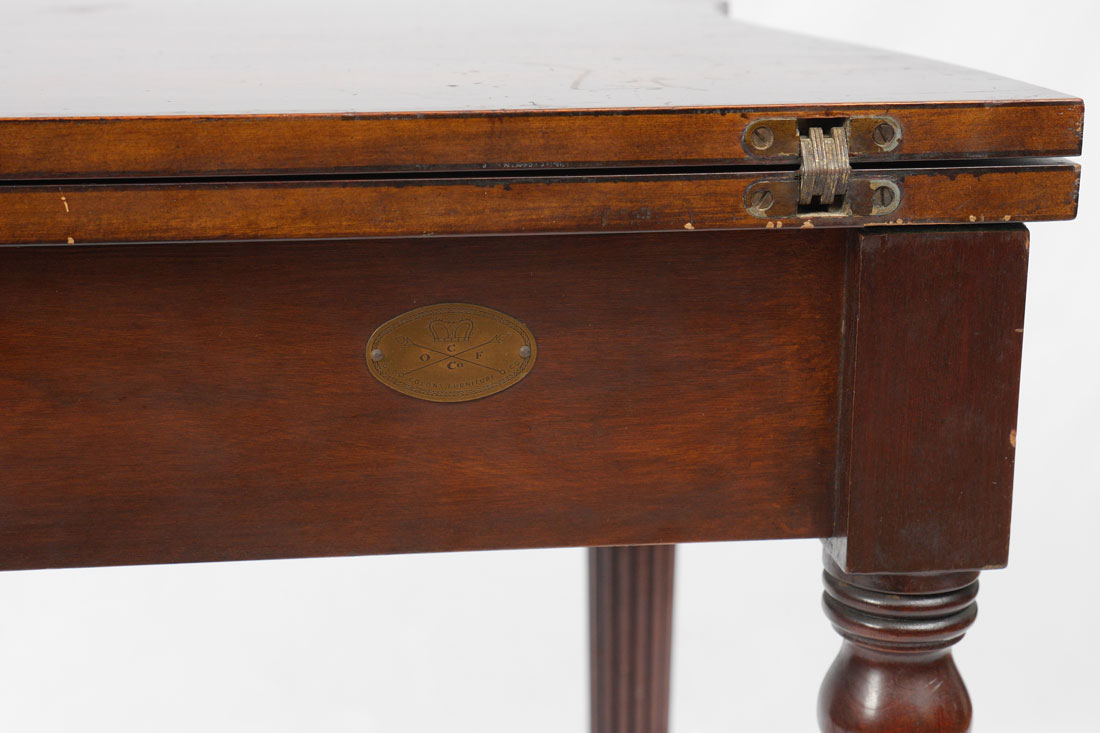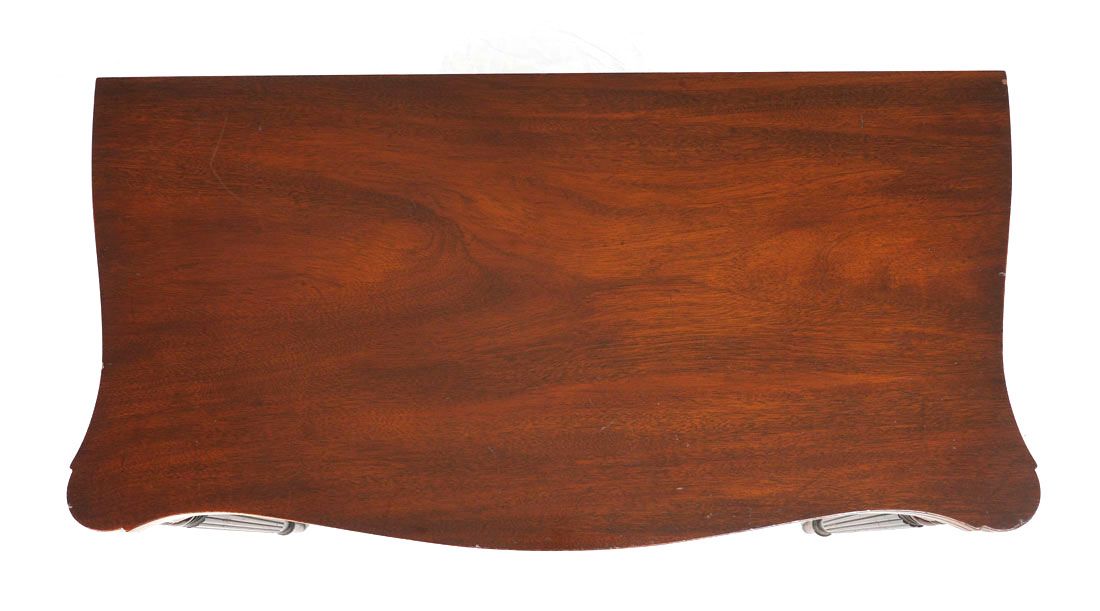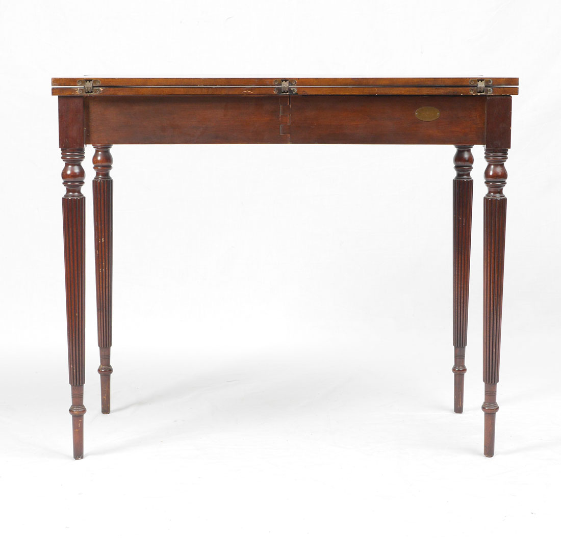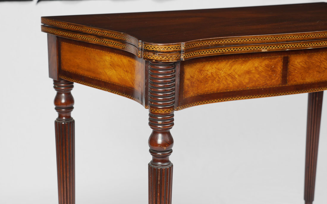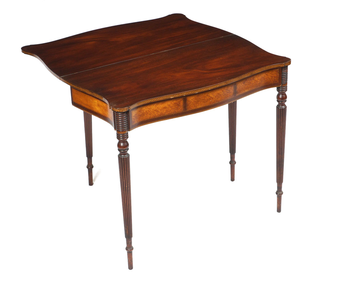SHERATON MAHOGANY INLAID GAME TABLE: Serpentine flip top with parquetry inlaid trim, skirt with burl veneer accent panels, fluted and tapered legs. Overall measures 29 3/4'' h. x 35'' x 17 1/4''.