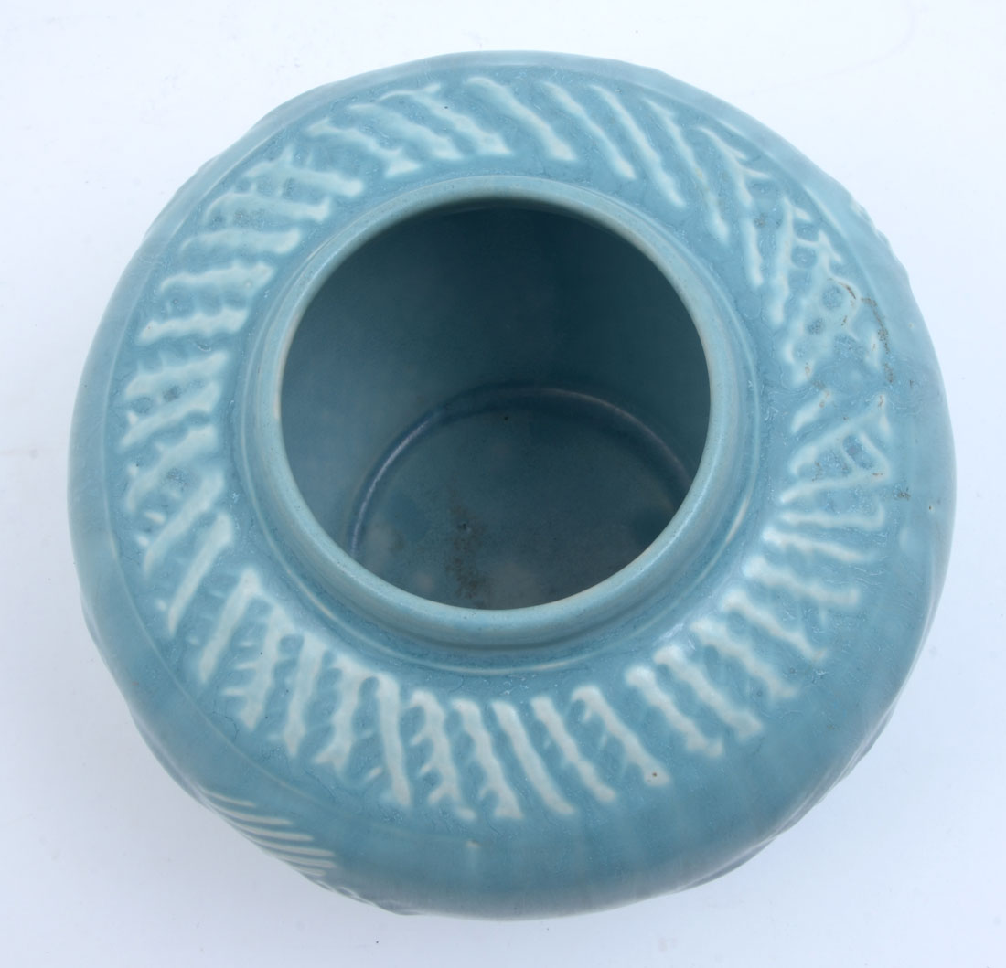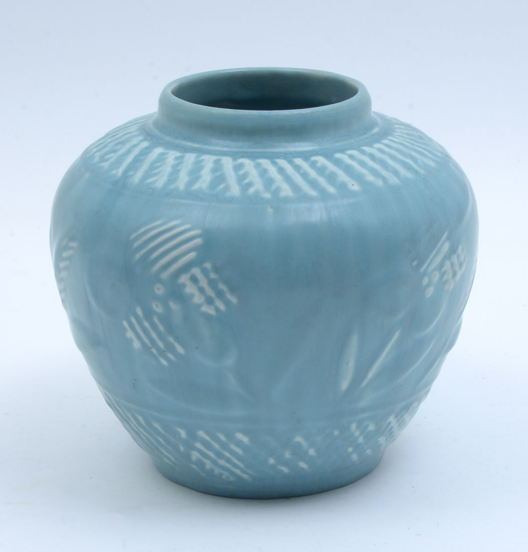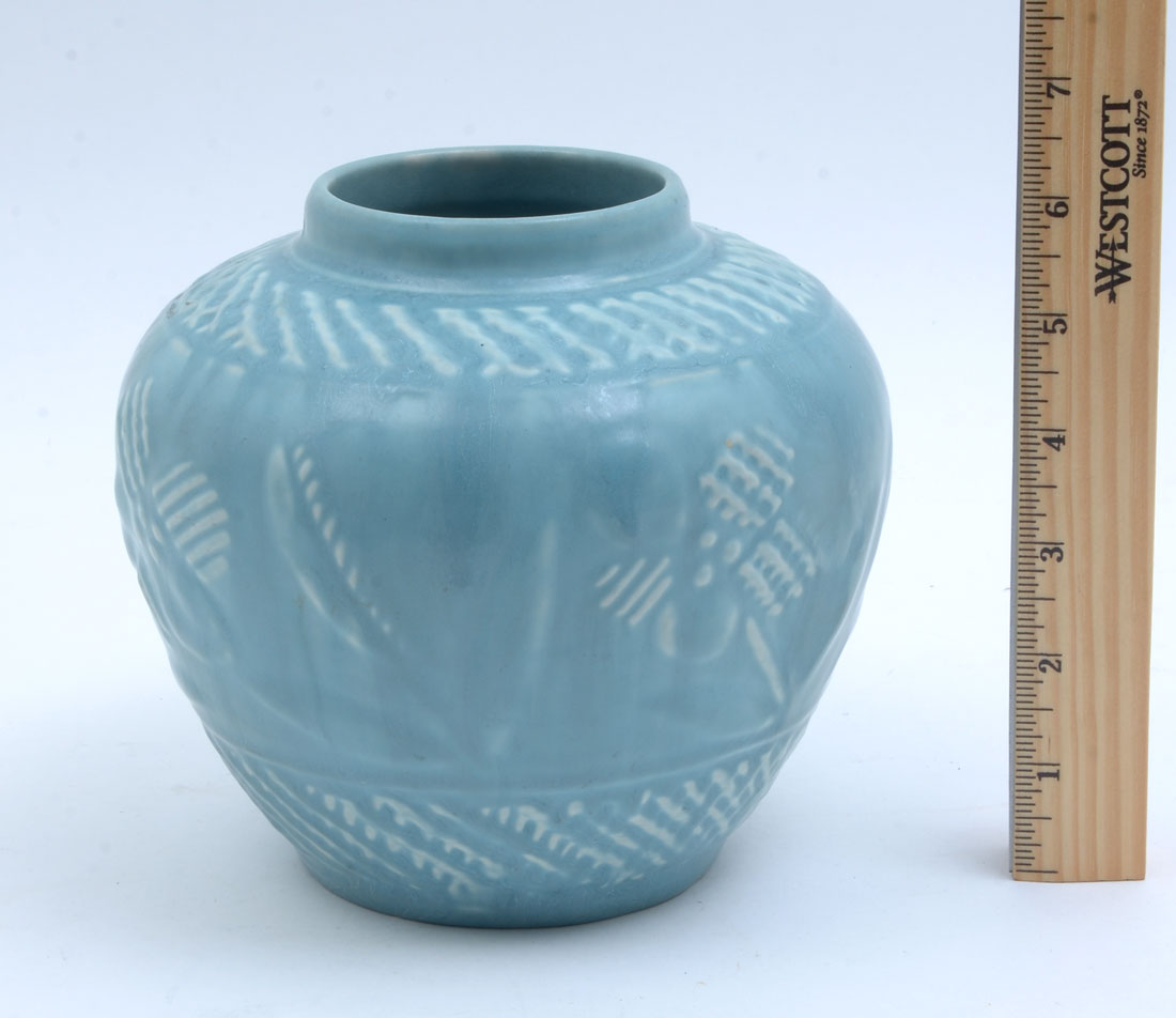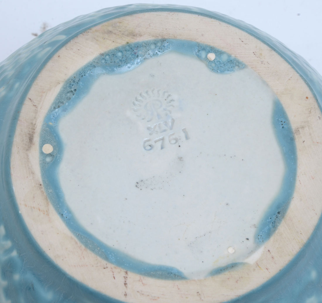 1945 ROOKWOOD POTTERY VASE 6761: Raised floral decoration, blue and white glaze, bulbous form, impressed Rookwood 1945 stamp with 6761. Measures 6'' h. x 7''.