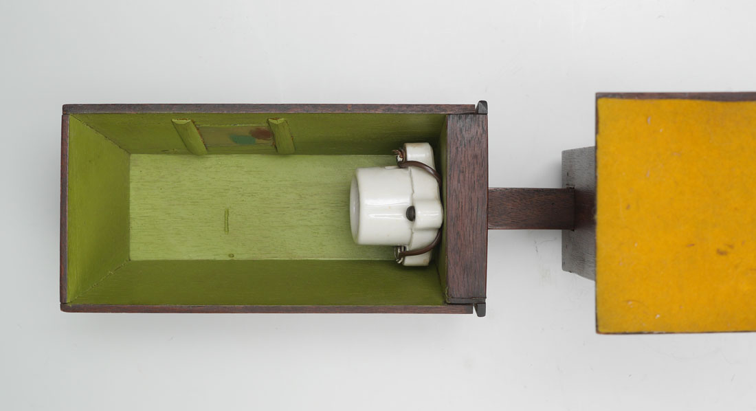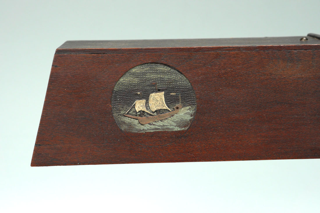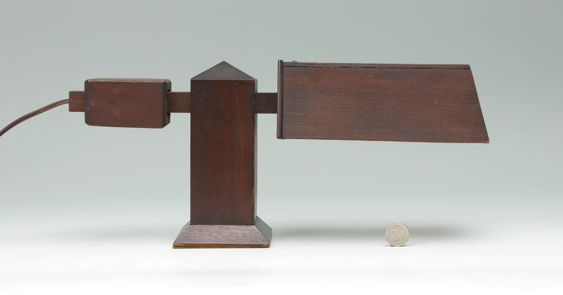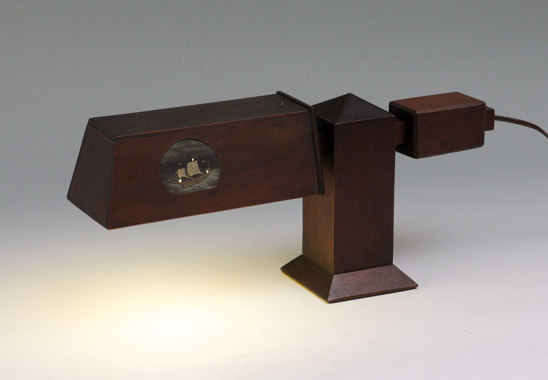 OAK ARTS & CRAFTS PIANO LAMP: Oak base support with pyramid top, adjustable arm, oak shade with carved ship in medallion on one side, no visible markings, 7'' h. x 15 3/4'' x 4''.