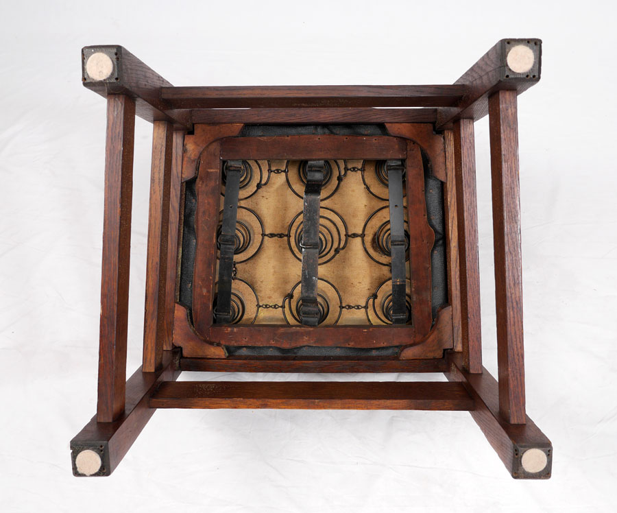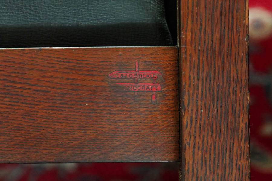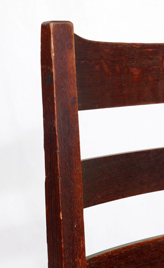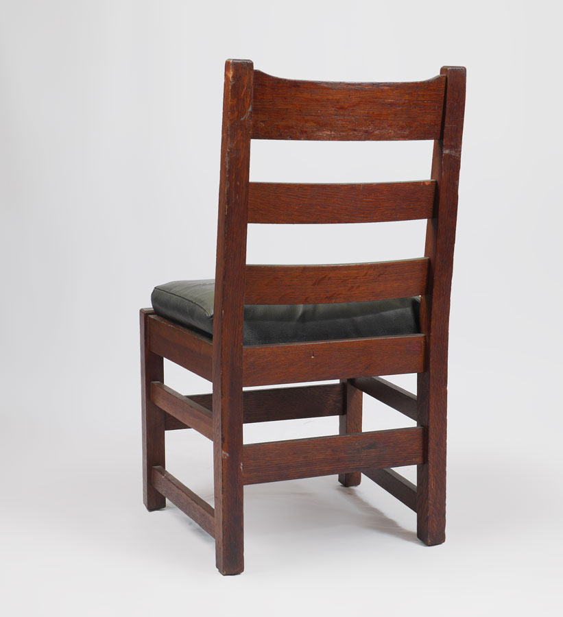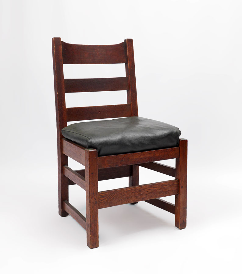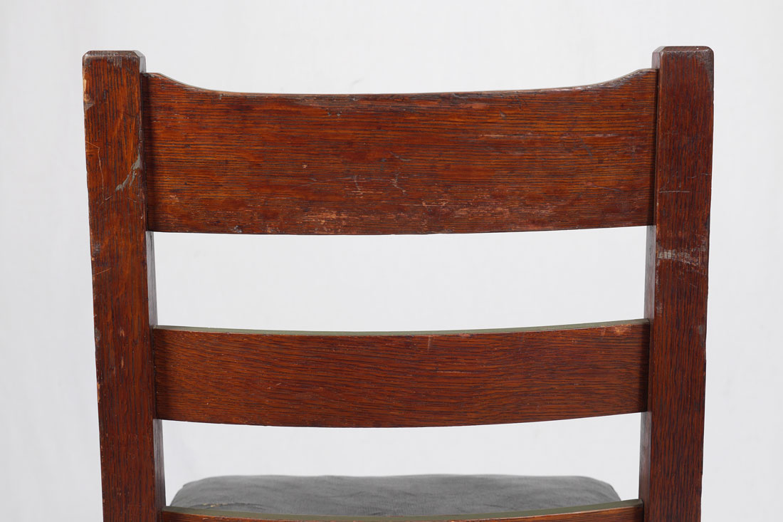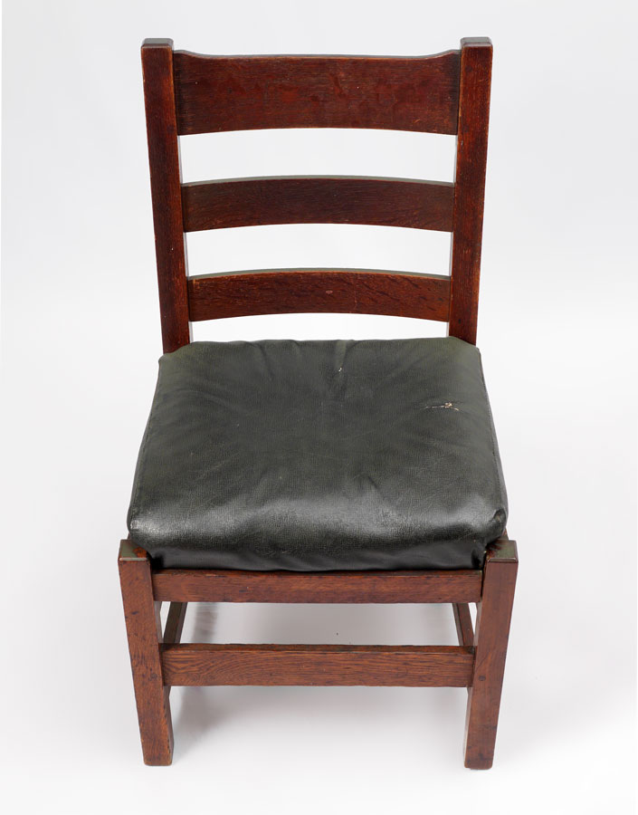 SIGNED L. & J.G. STICKLEY LADDERBACK SIDE CHAIR: 3 slat ladder back, original leather cushion with springs, partial label on back, measures 35 1/4'' h. x 19 3/4'' x 18 3/4''.