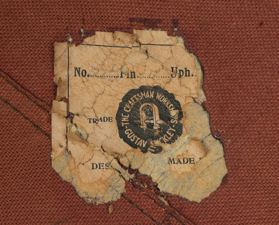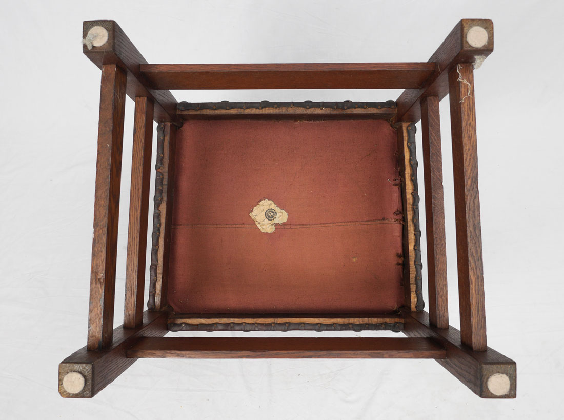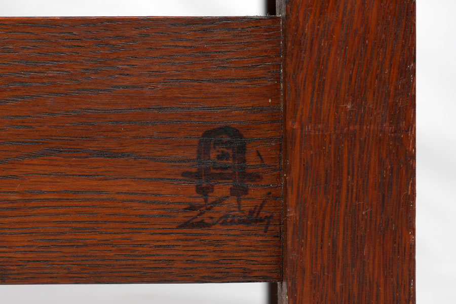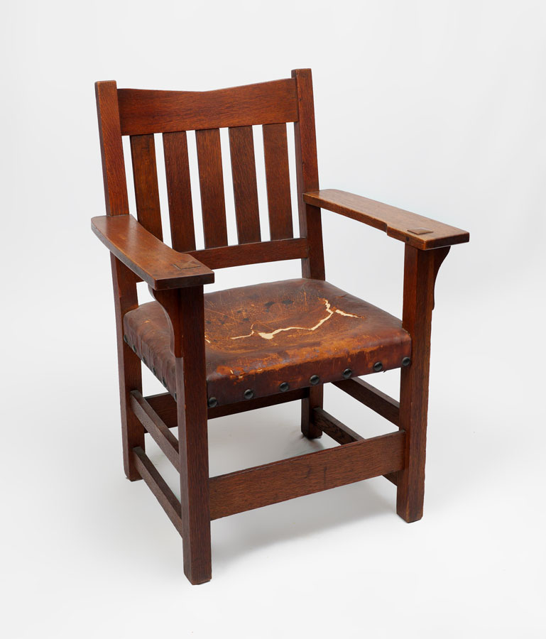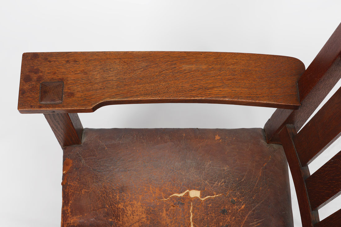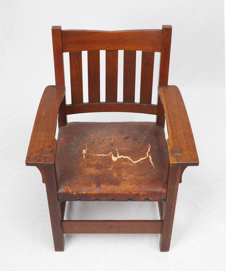 SIGNED GUSTAV STICKLEY OAK ARM CHAIR 354 1/2: ''V'' top rail with 5 vertical slats, shaped arms with shaped corbel supports, tacked leather seat, overall 36'' h. x 26'' x 22''.