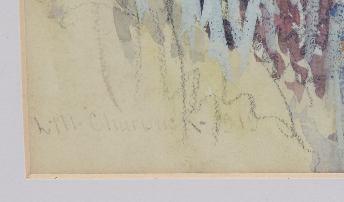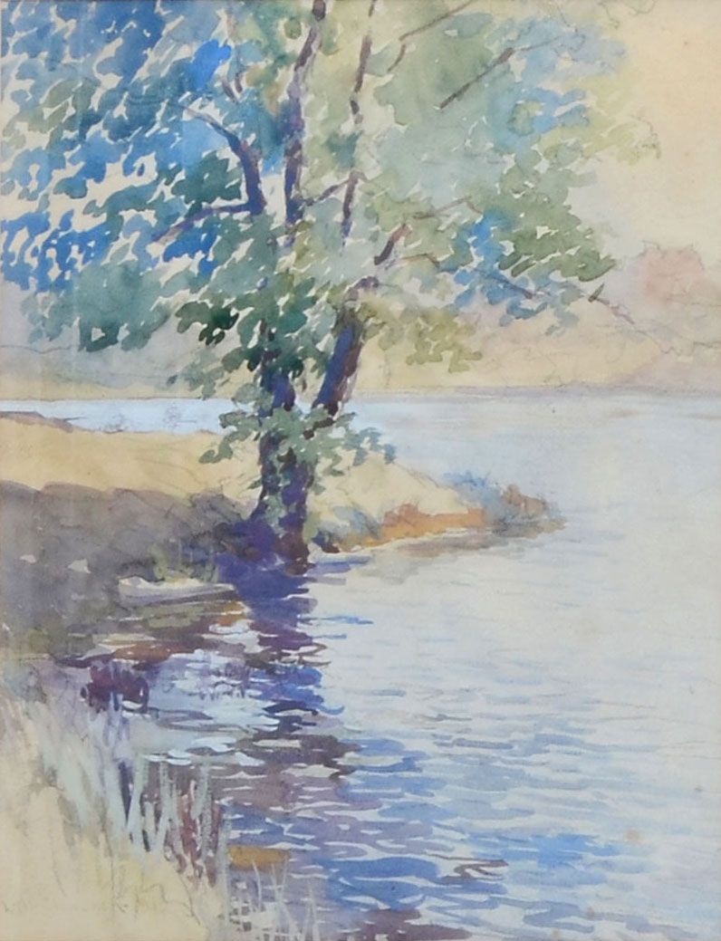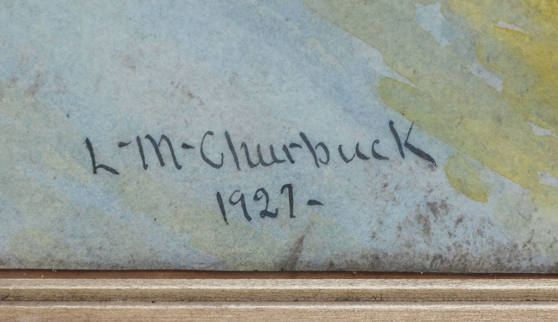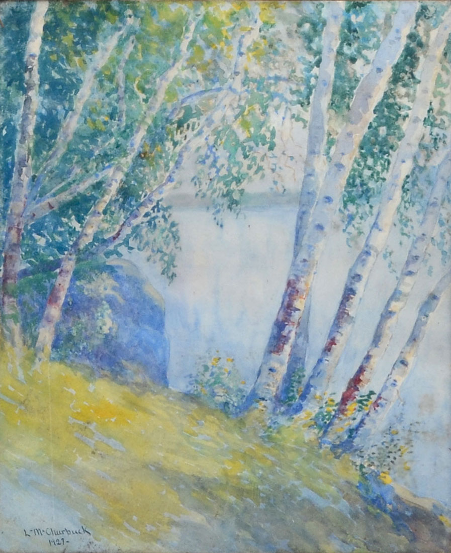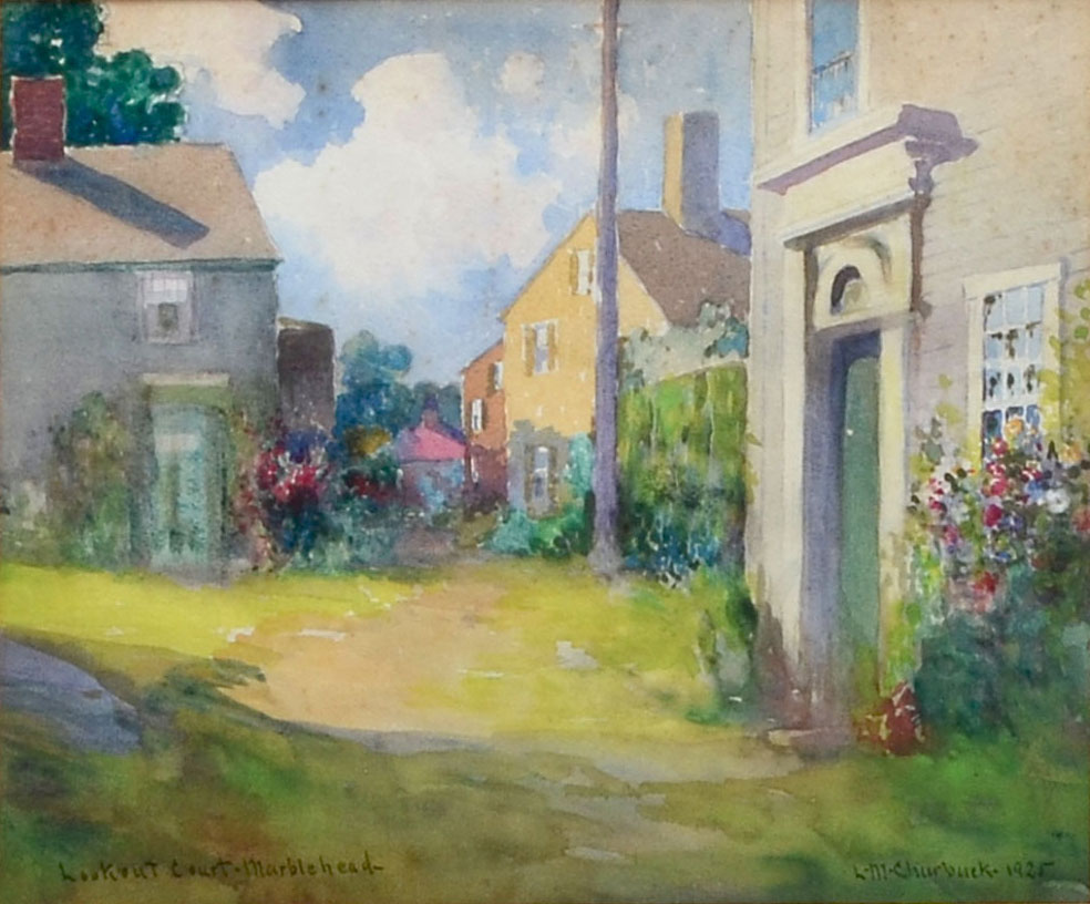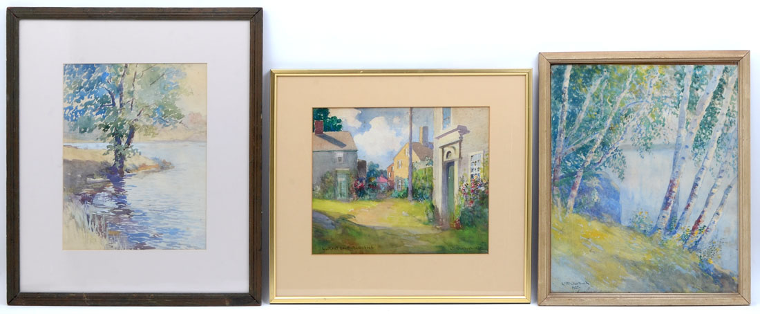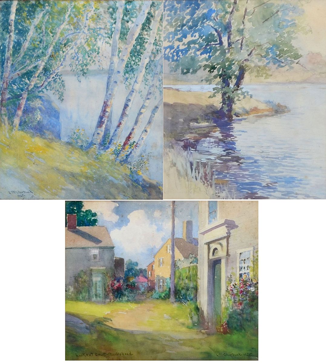 CHURBUCK, Leander M., (American, 1861-1940): 1) ''Lookout Court- Marblehead'', Watercolor, sight size is 10'' x 12'', signed lower right and dated 1925, titled lower left and framed 16'' x 18''. 2) ''Riverside Landscape with Birches'', Watercolor, sight size is 15.50'' 12.50'', signed lower left and dated 1927, framed 17.50'' x 14''. 3) ''River Scene'', Watercolor, sight size is 12.50'' x 9.50'', signed lower left, framed 20.50'' x 17.50''.