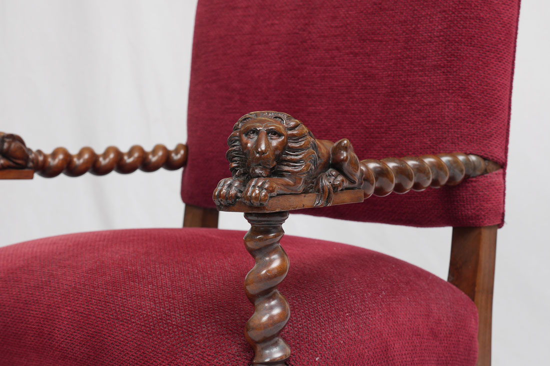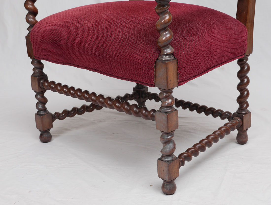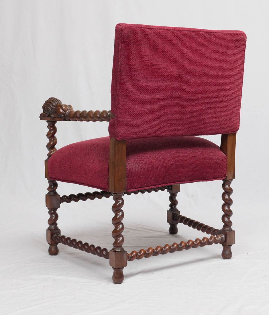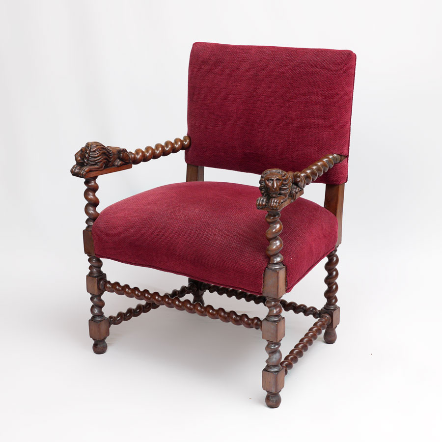 CHARLES II STYLE CARVED OPEN ARM CHAIR: Barley twist arms with carved figural recumbent lion hand holds, turned legs barley twist stretchers. Burgundy cloth upholstery, overall 38'' h. x 28 3/4'' x 24''.