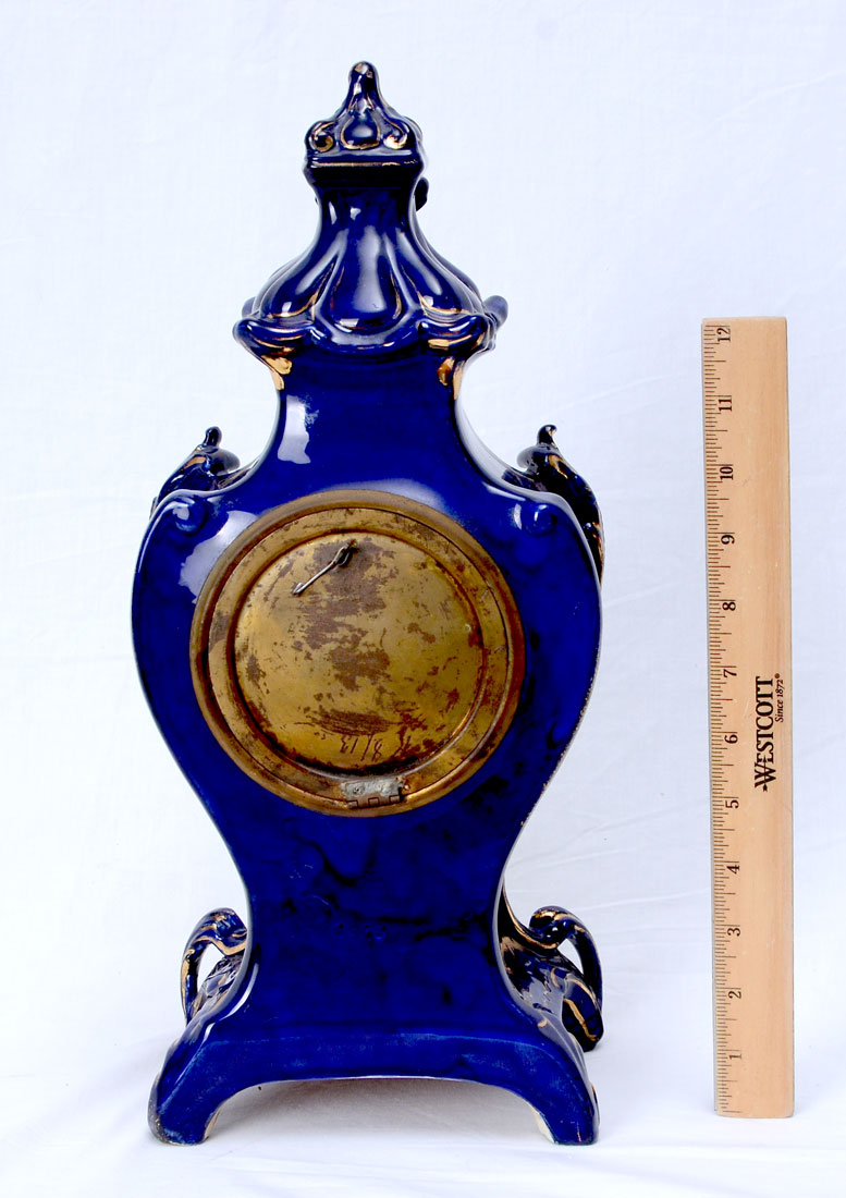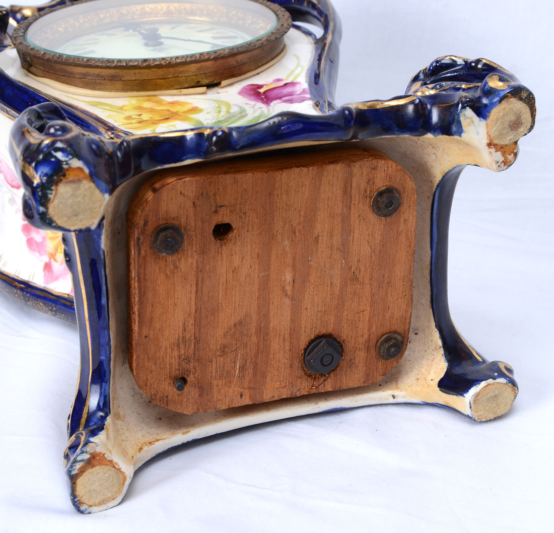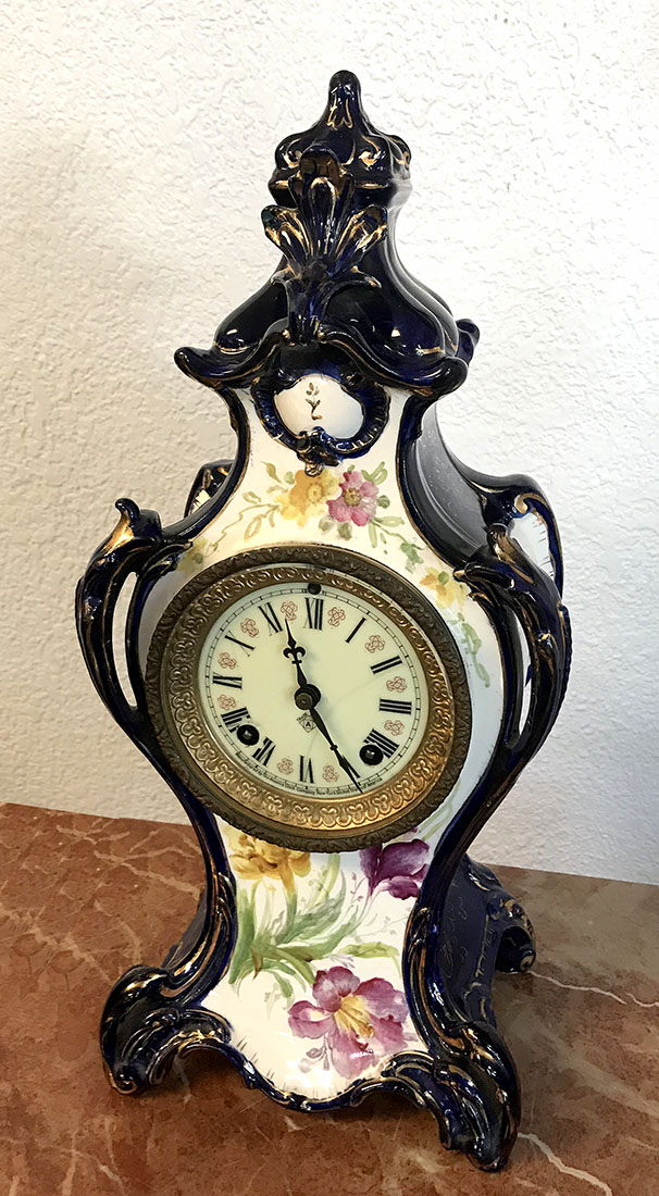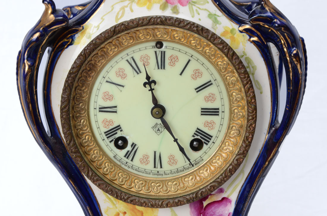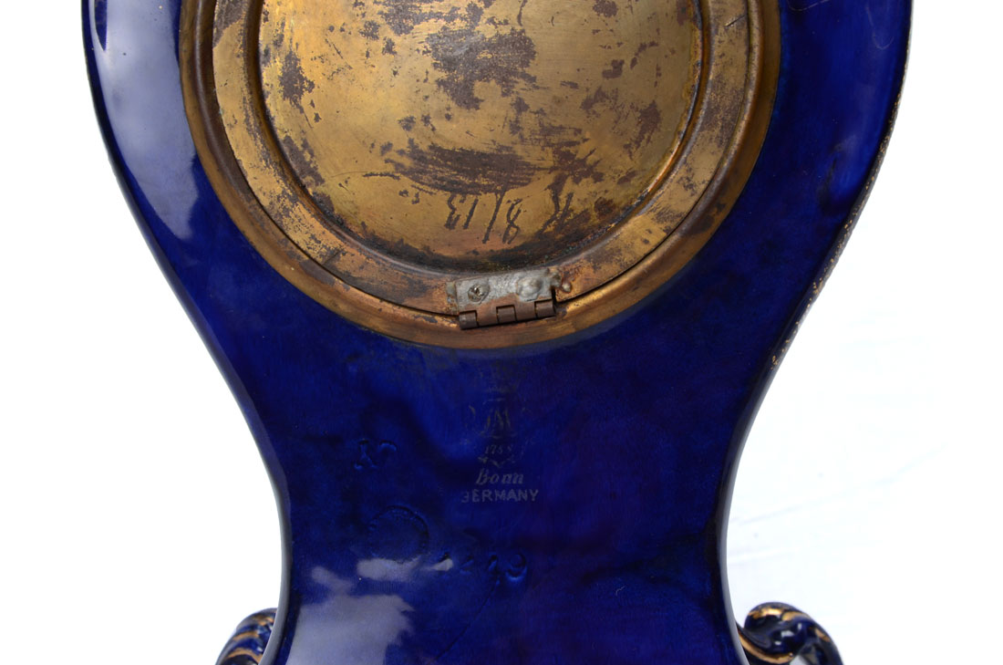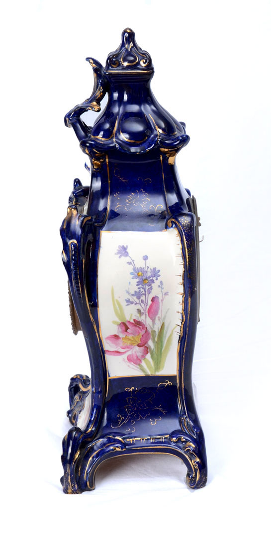 ANSONIA ROYAL BONN PORCELAIN MANTEL CLOCK: Cobalt case with openwork handles and floral decor. Works marked Ansonia. Cased marked Royal Bonn. 16'' h. x 7 1/4'' x 5 1/4''.