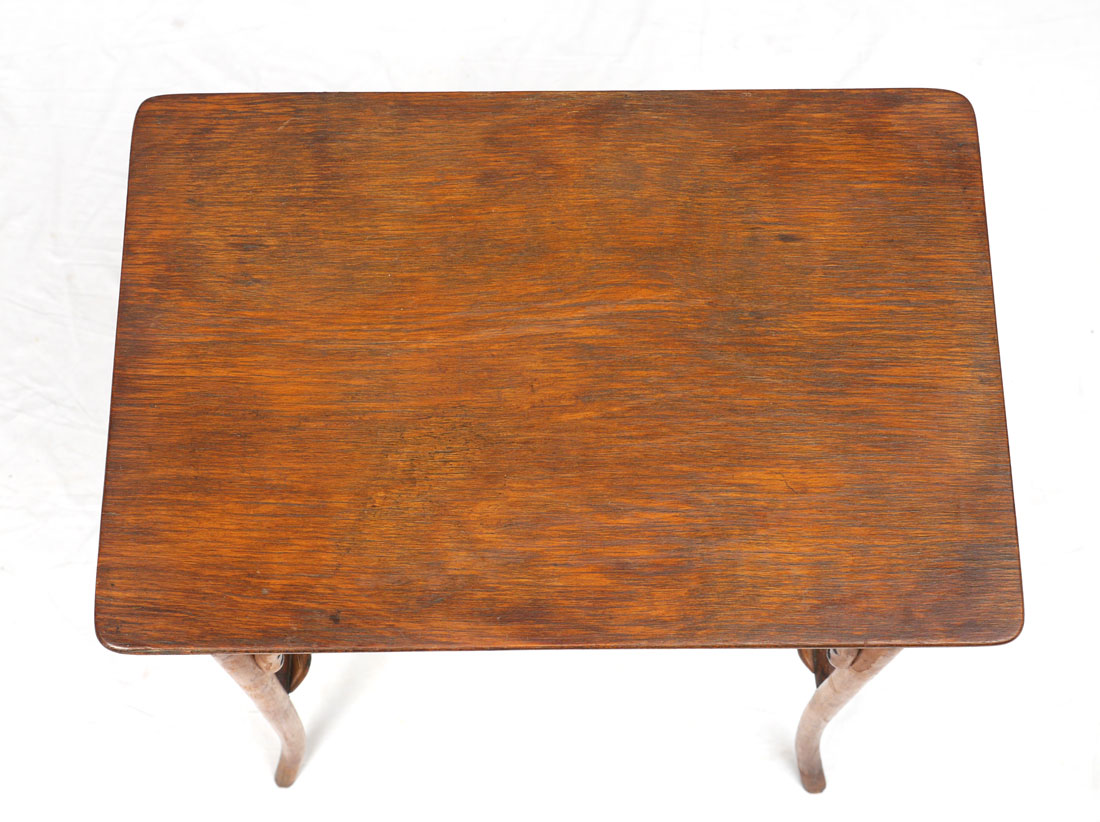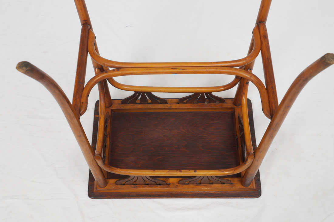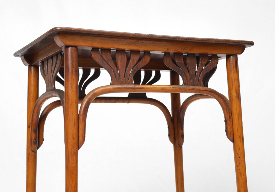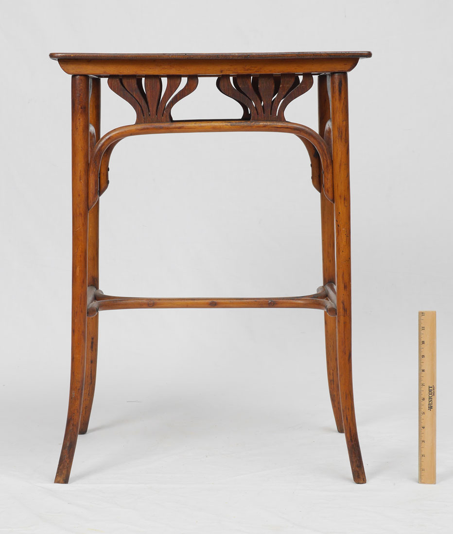 JACOB & JOSEPH KOHN BENTWOOD SIDE TABLE: Rectangular top, stylized floral openwork skirt over beech bent wood legs and stretcher. J & J. Kohn burn mark under top. Overall 30'' h. x 22'' x 14 3/4''.
