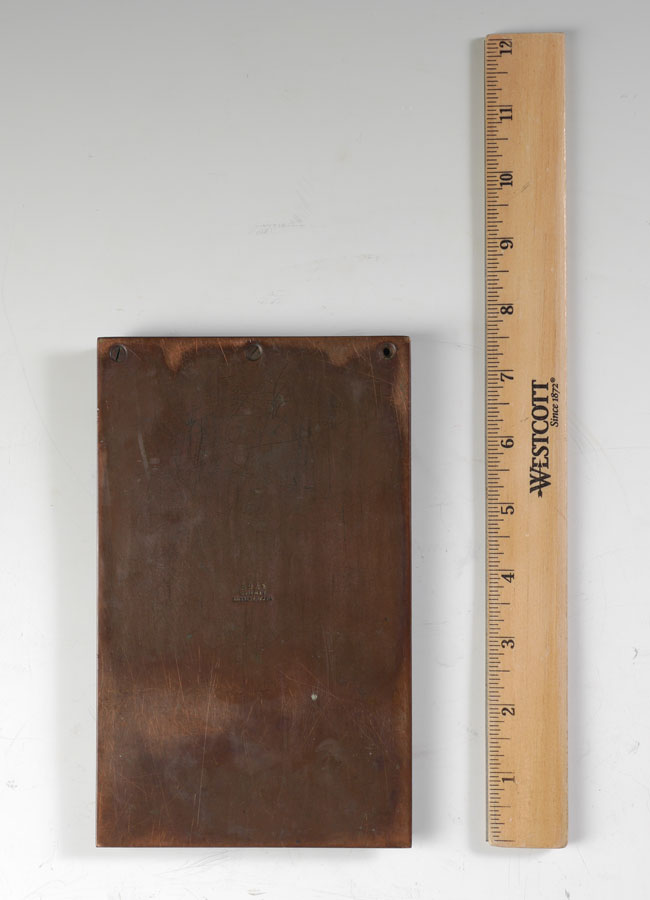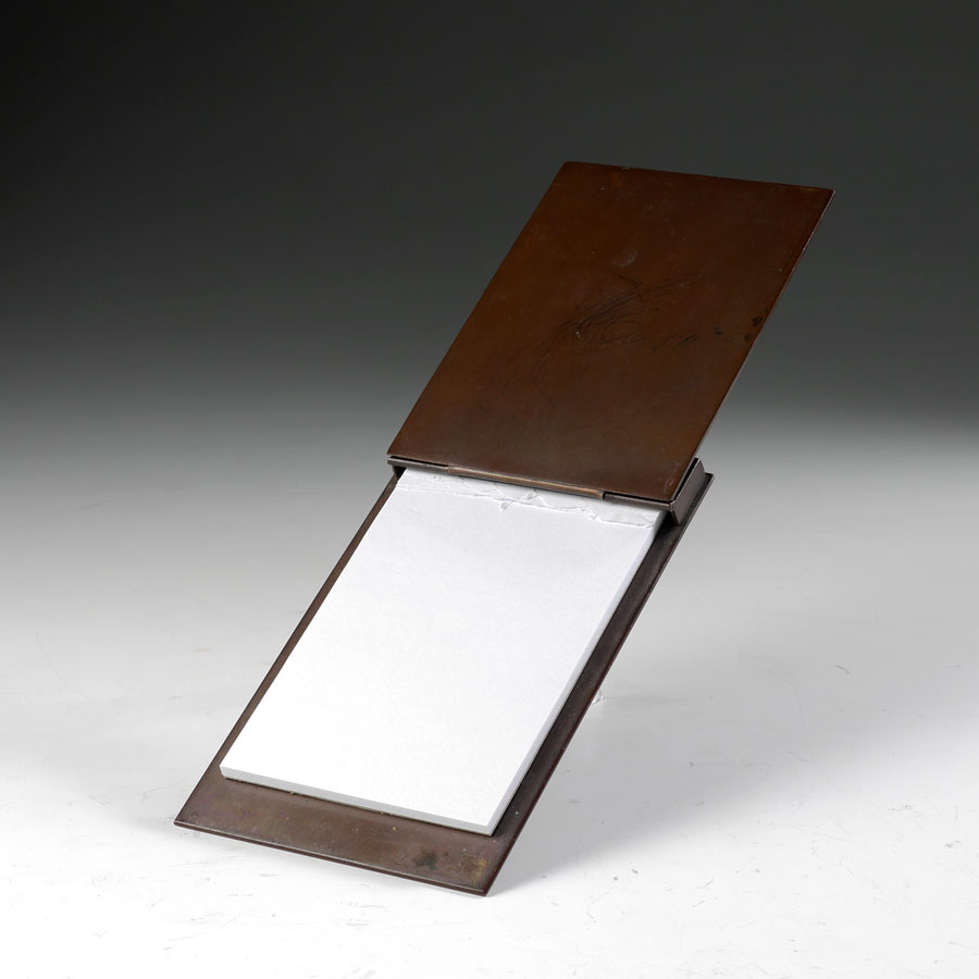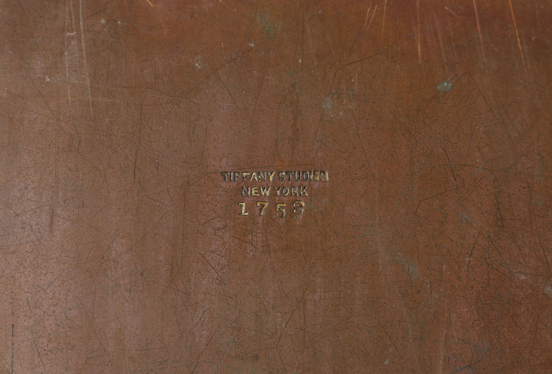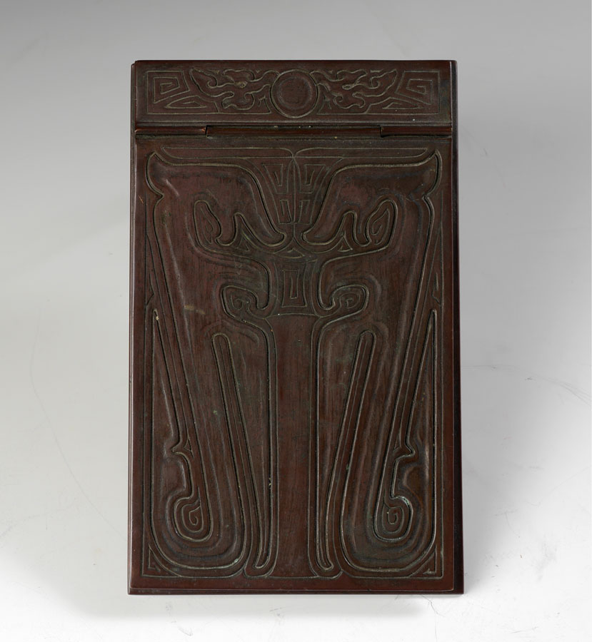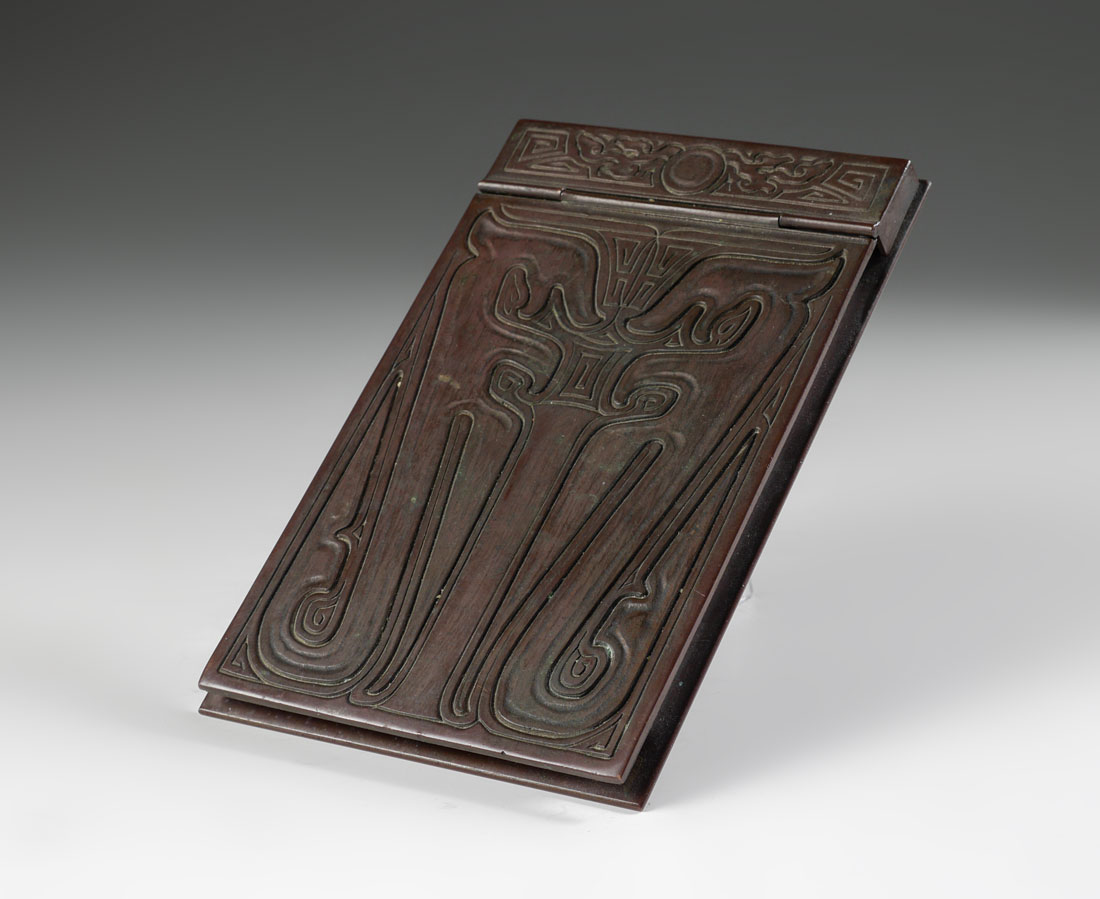 TIFFANY STUDIOS CHINESE PATTERN BRONZE NOTEPAD: Bronze notepad in the ''Chinese'' pattern, well marked ''Tiffany Studios, New York, 1758''. Hinged lid, 7 1/2'' x 4 3/4''