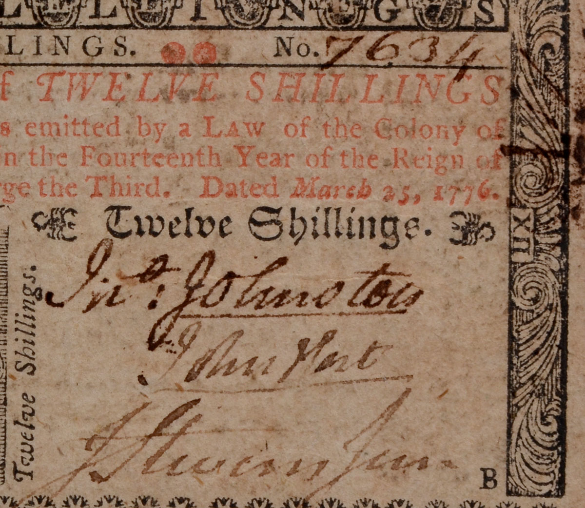 RARE 12 SHILLING COLONIAL CURRENCY NOTE JOHN HART SIGNED: An excellent example of a rare New Jersey 12 Shilling Colonial Currency Note #7634, March 25, 1776. Signers include JOHN HART (1708-1779). signer of The Declaration of Independence, public official and politician in Colonial New Jersey who served as a Delegate to the Continental Congress, Johnathan Johnston, and John Stevens junior. Mica flakes show clearly on this fine example.
