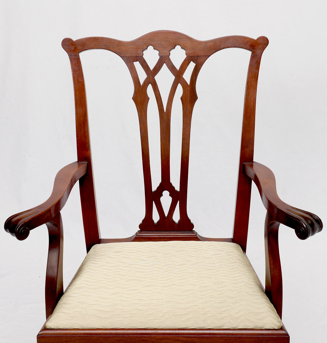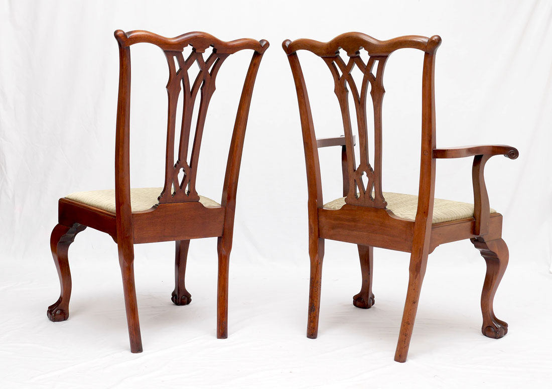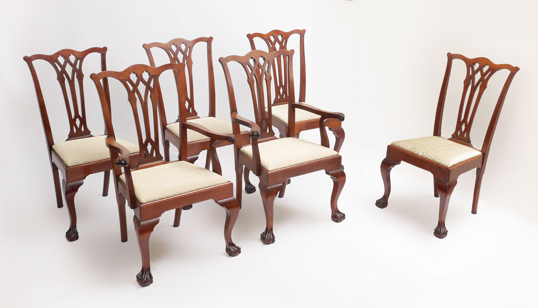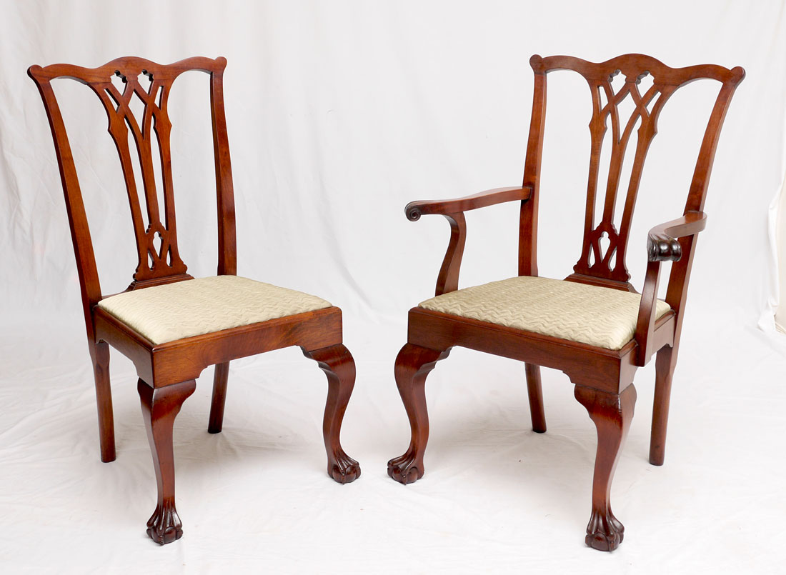 6 CHIPPENDALE STYLE DINING CHAIRS: 6 chairs with carve and shaped backs, front cabriolet legs ending in ball and claw feet, patterned white upholstered seat cushions. The 2 arm chairs with carved hand holds measure 40'' h. x 28'' x 24''.