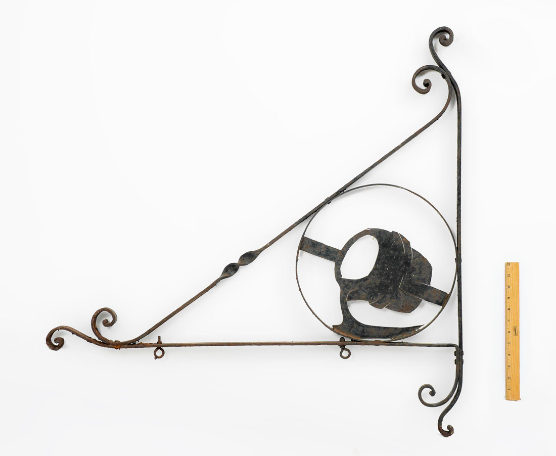 IRON BLACKSMITH SMELTING POT SIGN BRACKET: Unique wrought iron outdoor sign bracket featuring a smelting pot pouring iron, most likely for use from a blacksmith or bladesmith shop. Overall measures 35 1/2'' h. x 36'' x 1 1/2''.