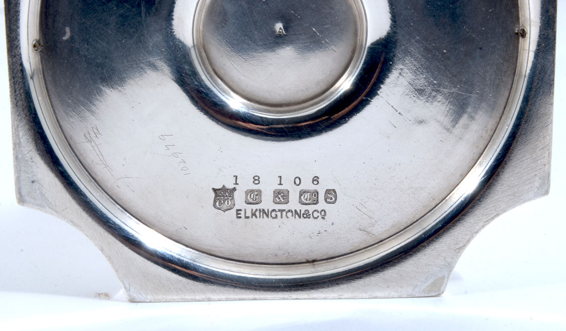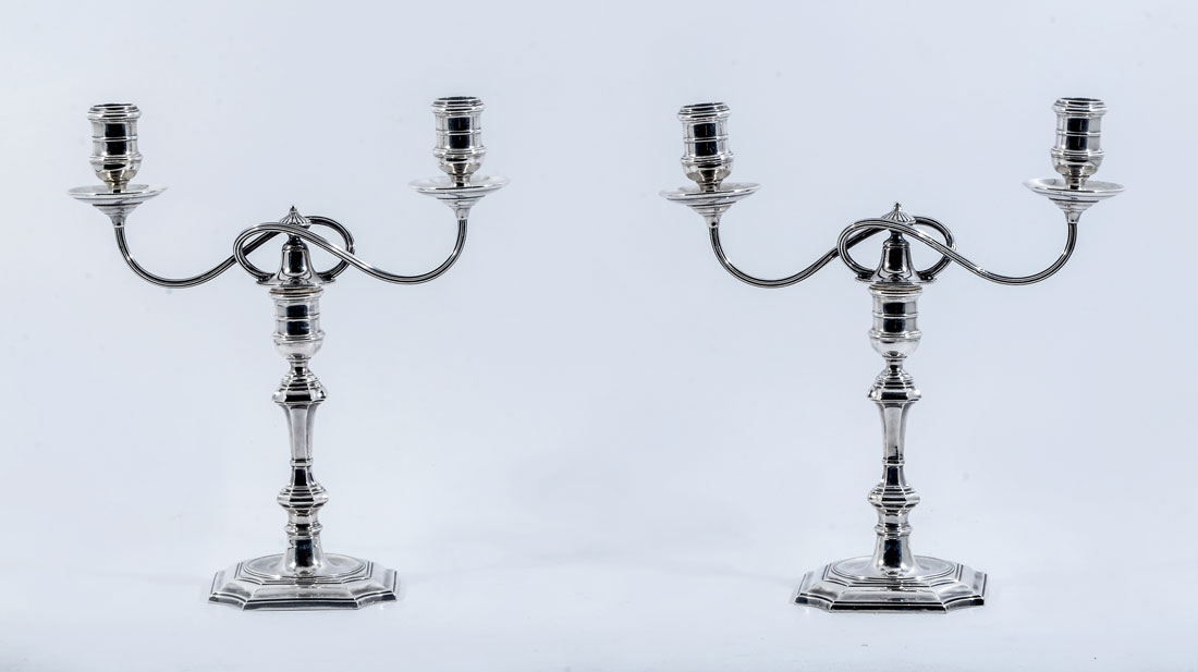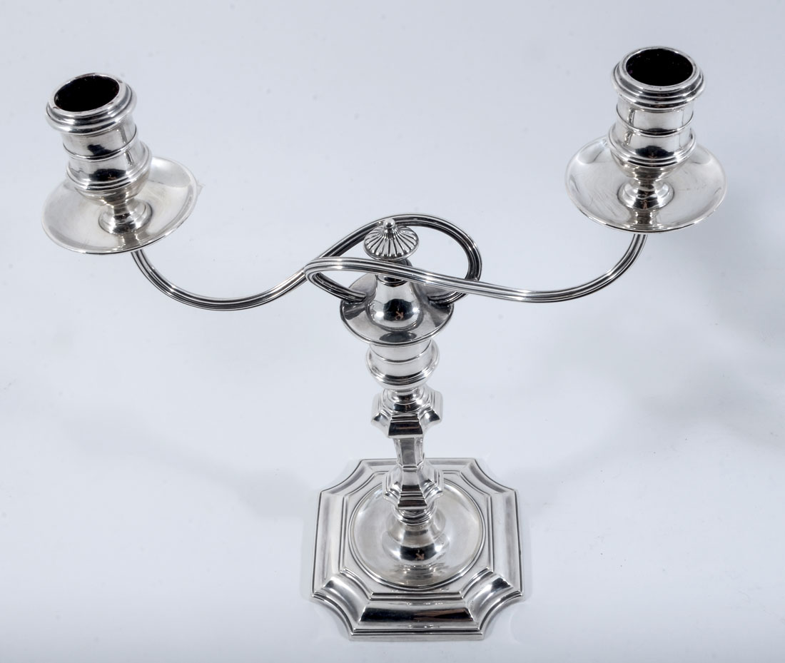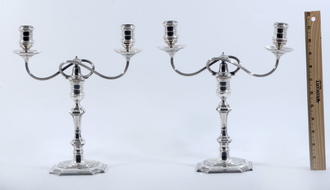 PAIR OF ELKINGTON & CO. SILVERPLATE CANDELABRA: Each with 2 scroll arms, shaped shaft, base well marked with Elkington & Co. marks and 18106. 10 1/2'' h. x 10 1/2''.