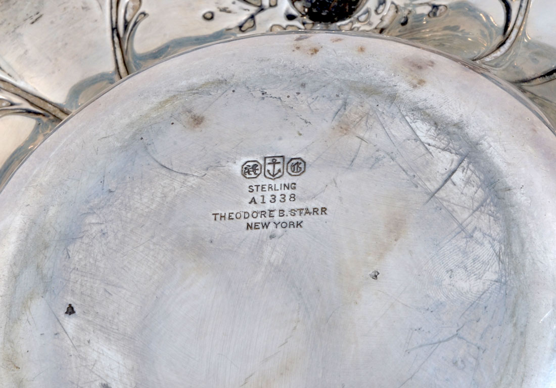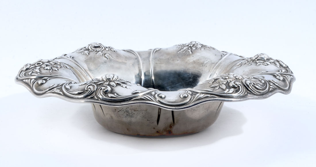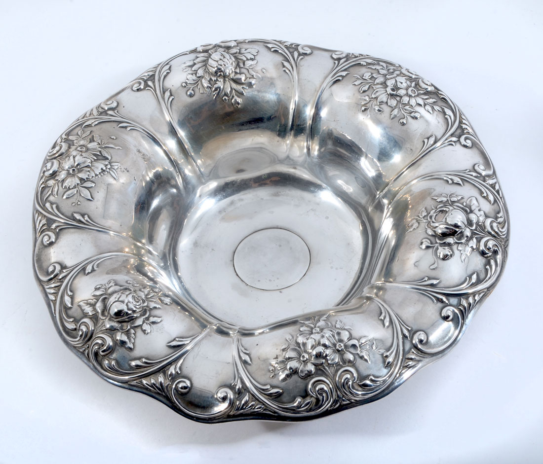 GORHAM EMBOSSED FLORAL MOTIF BOWL: Center bowl with embossed floral motif shaped rim, well marked with Gorham hallmarks, Sterling, A1338, Theodore B. Starr, New York. Overall 2 1/2'' x 10'' dia., approx. 11 troy oz.