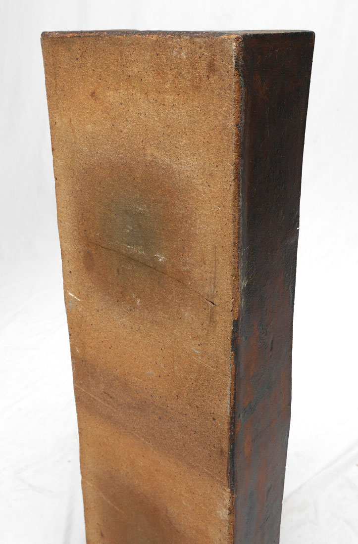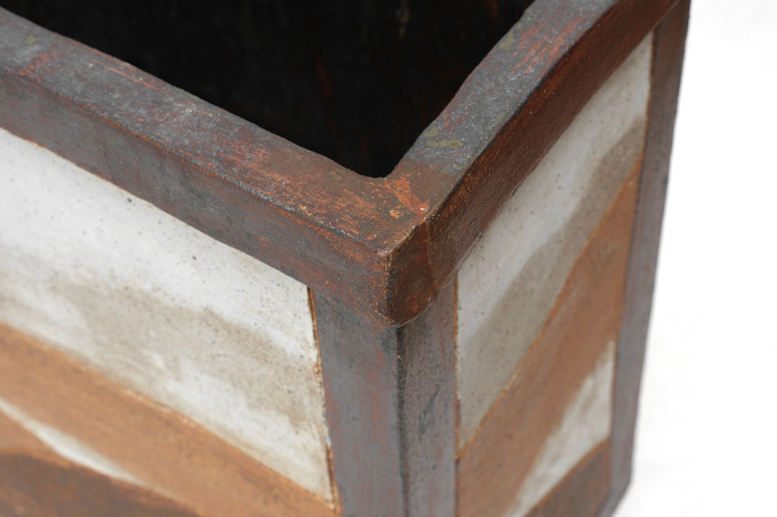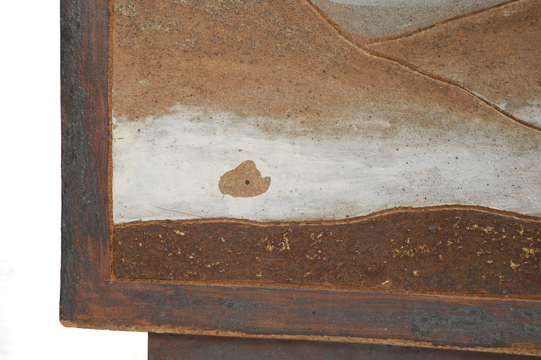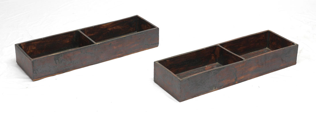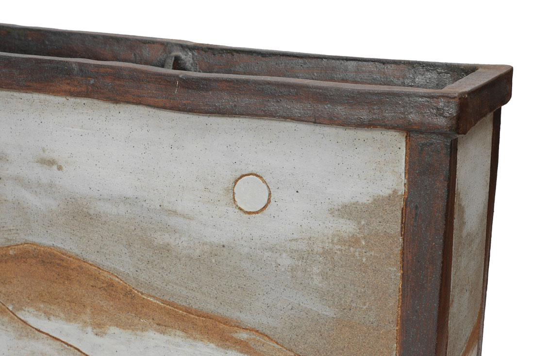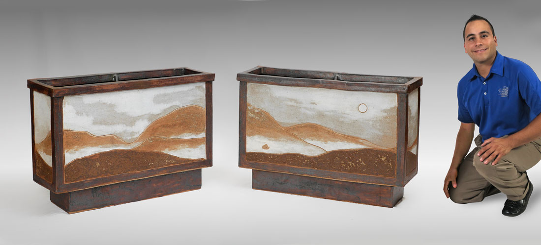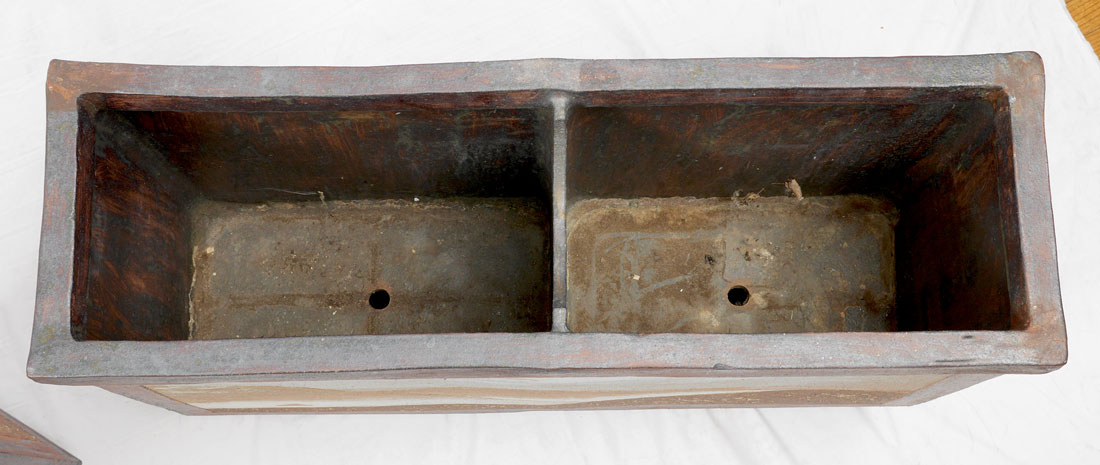 PAIR OF LARGE JAPANESE STONEWARE PLANTERS: Each with stylized mountain landscape motifs, interior divided into 2 sections, no visible signature. 26 1/4'' h. x 39'' x 12 1/4''.