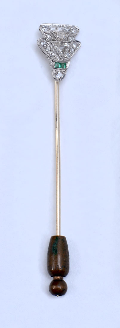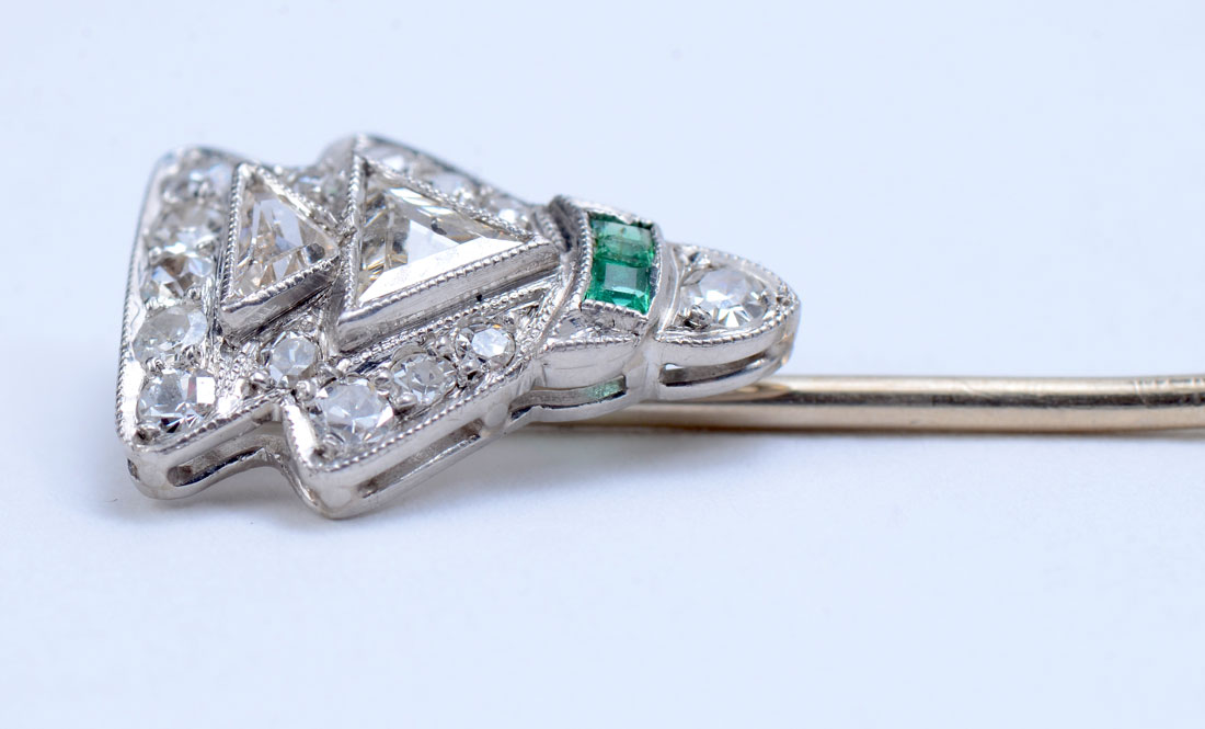 DISTINCTIVE PLATINUM DIAMOND AND EMERALD STICK PIN: Square natural emeralds with round and fancy cut diamonds. Approx .50 - .60CTW.