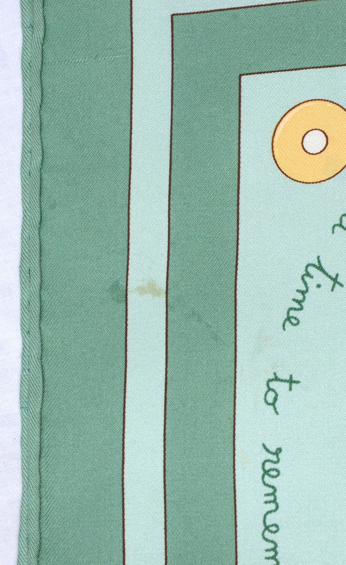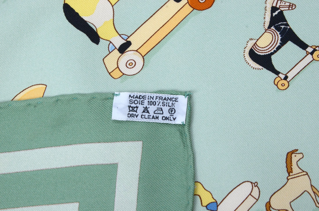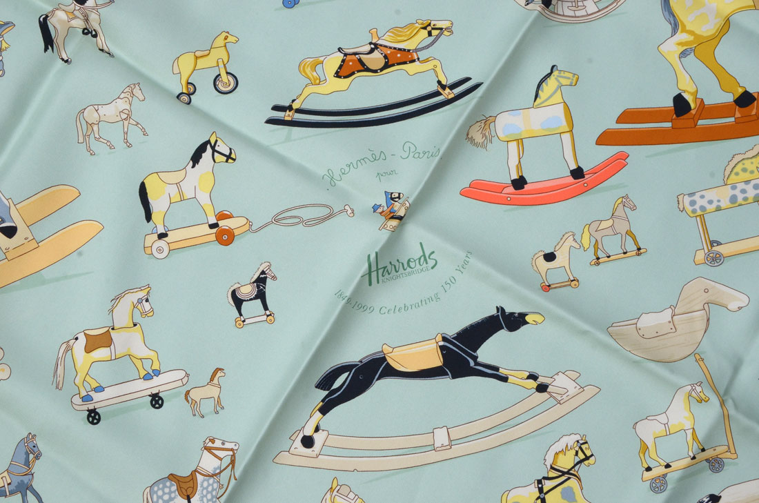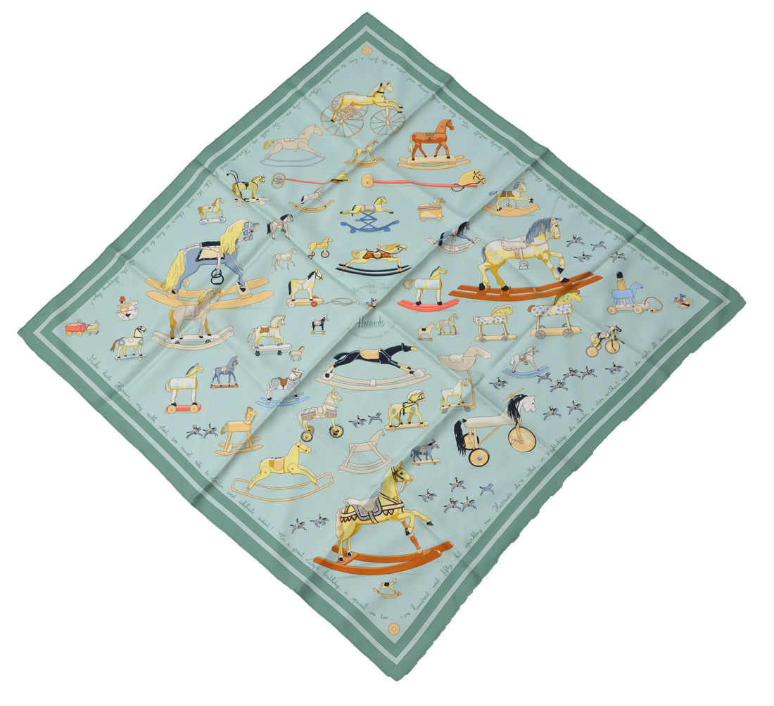 HERMES FOR HARRODS GREEN SILK ROCKING HORSE SCARF: Hermes for Harrods mint green Silk Rocking House Scarf, Paris, 1999, mint green silk scarf depicting assorted rocking horses and pull toys. Measures approx 35'' square.