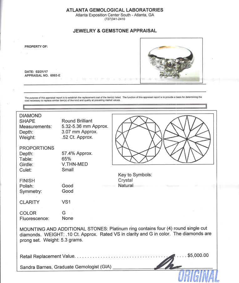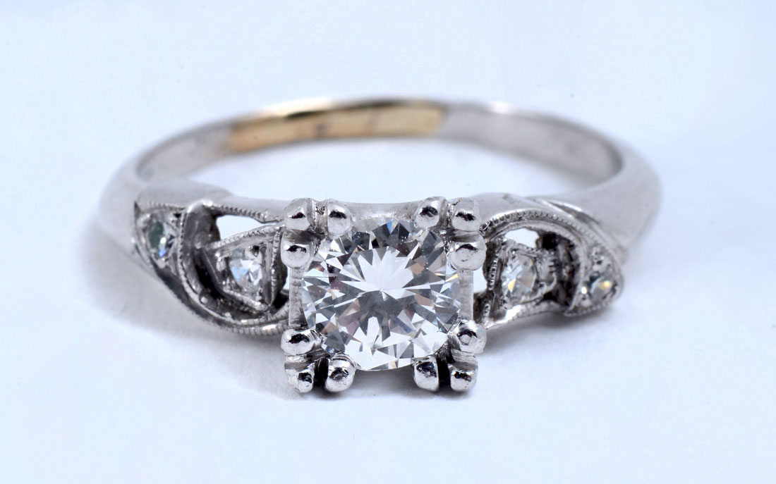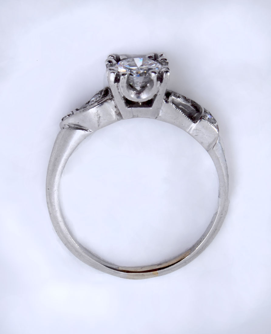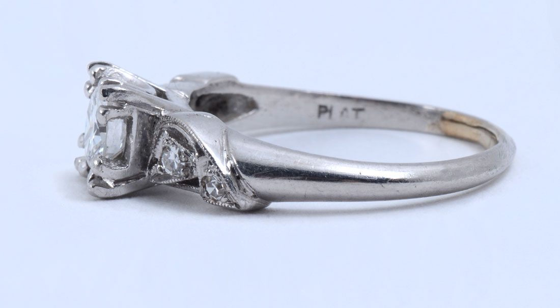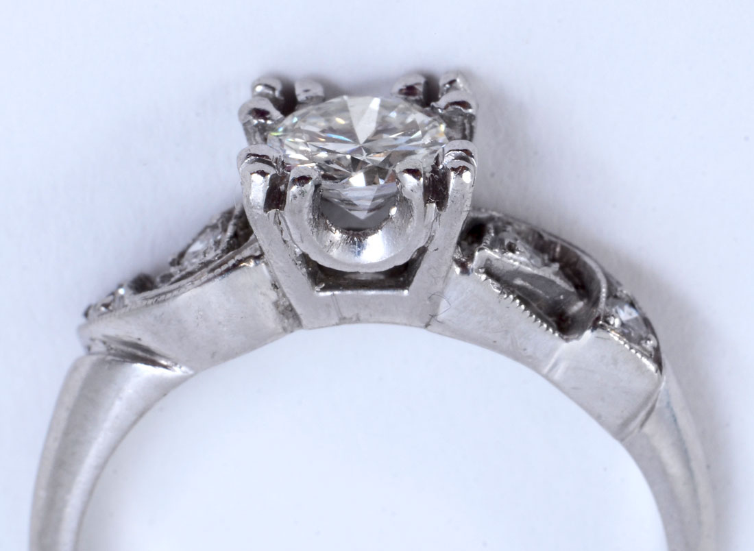 PLATINUM RETRO DECO DIAMOND RING: Ca 1950, this ring features .52CT round brilliant cut diamond with 4 round single cut diamonds on the shoulders. Featured diamond is .52CT with VS1 clarity and G in color. Size 6. Weight 5.3 grams. Sold with current Atlanta Gemological GIA graduate's appraisal for $5000.