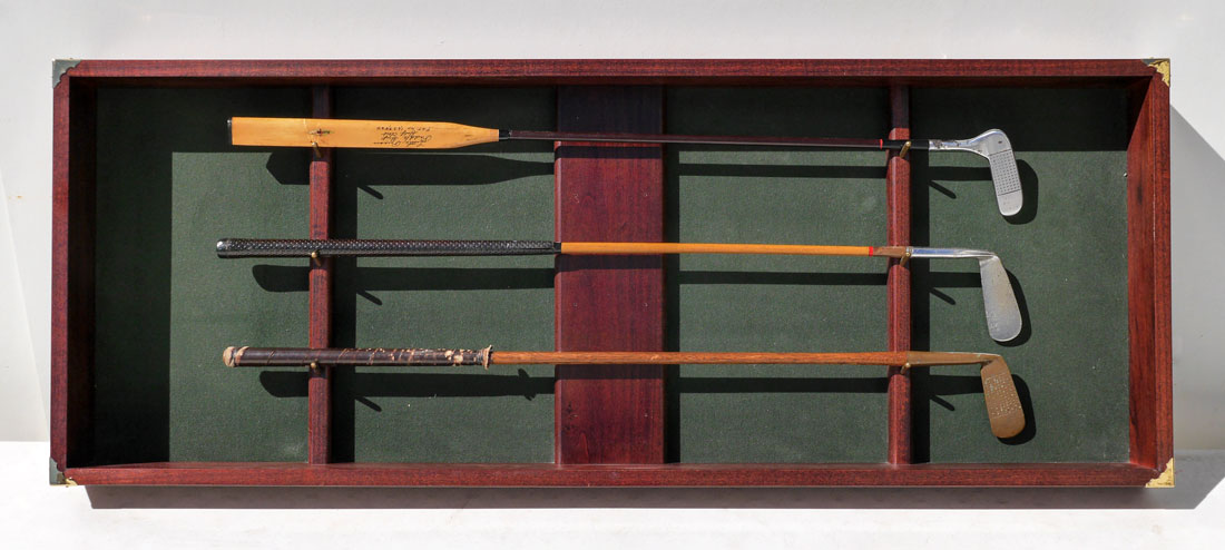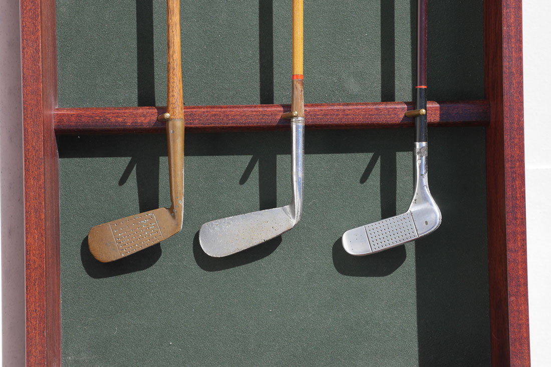 3 PIECE FRAMED VINTAGE GOLF PUTTERS: In open shadowbox frame, 3 vintage putters to include 1) Little Poison Paddle Grip, 34 1/2''. 2) Spalding Robert Jones Jr. Tournament Model, 34 1/2''. 3) V. L. & A. Special Putter, 34 1/4''. Frame measures 18 1/2'' x 47 1/2'' x 3 1/2''.