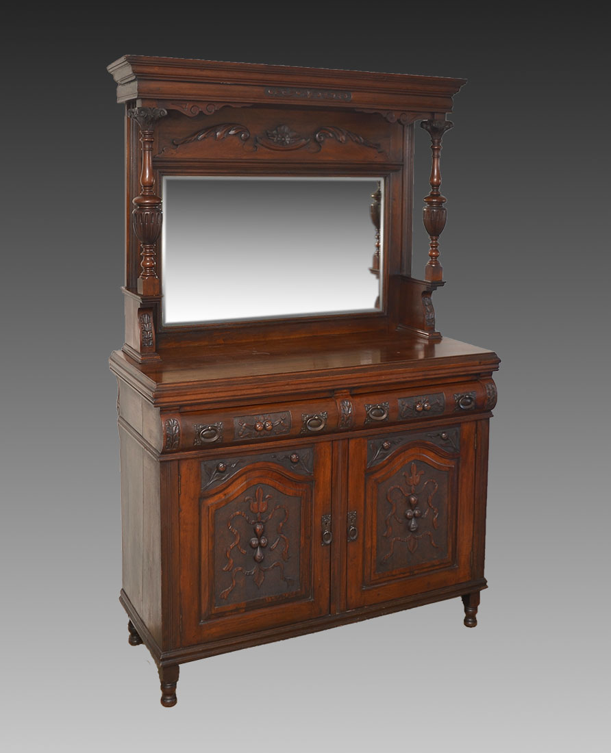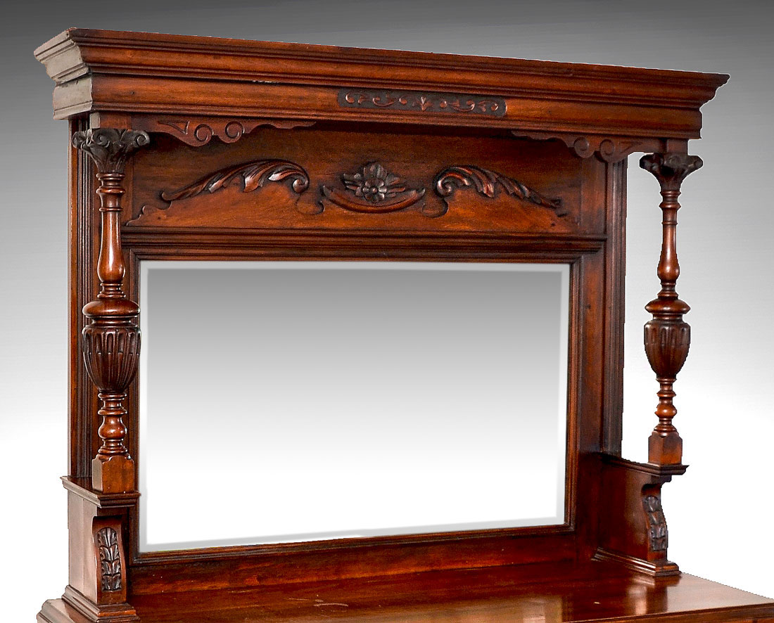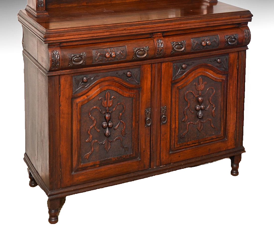 CONTINENTAL CARVED 19TH CENTURY HUTCH: Molded cornice over backsplash with applied carved decoration over beveled glass mirror, carved and turned support columns. Base with 2 shaped drawers over 2 doors with carved panels, turned finials. 75 1/2'' h. x 47'' x 20 1/2''.