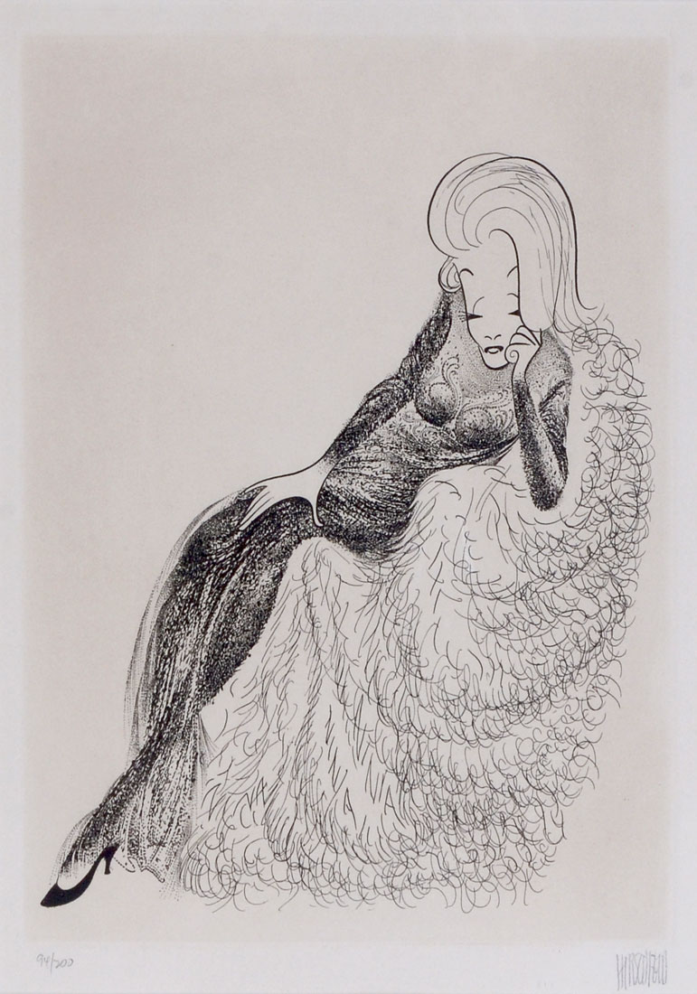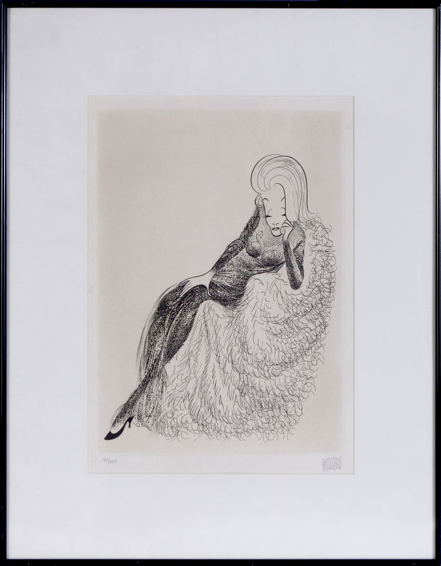 HIRSCHFELD, Albert, (American, 1903-2003): Etching, image size is 13'' x 10'', sight size is 14'' x 10.50'', overall in black metal frame: 22'' x 16'', signed in pencil lower right: ''Hirschfeld'', numbered in pencil lower left: ''94/200''.