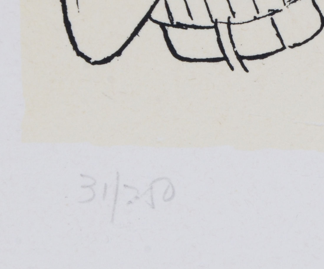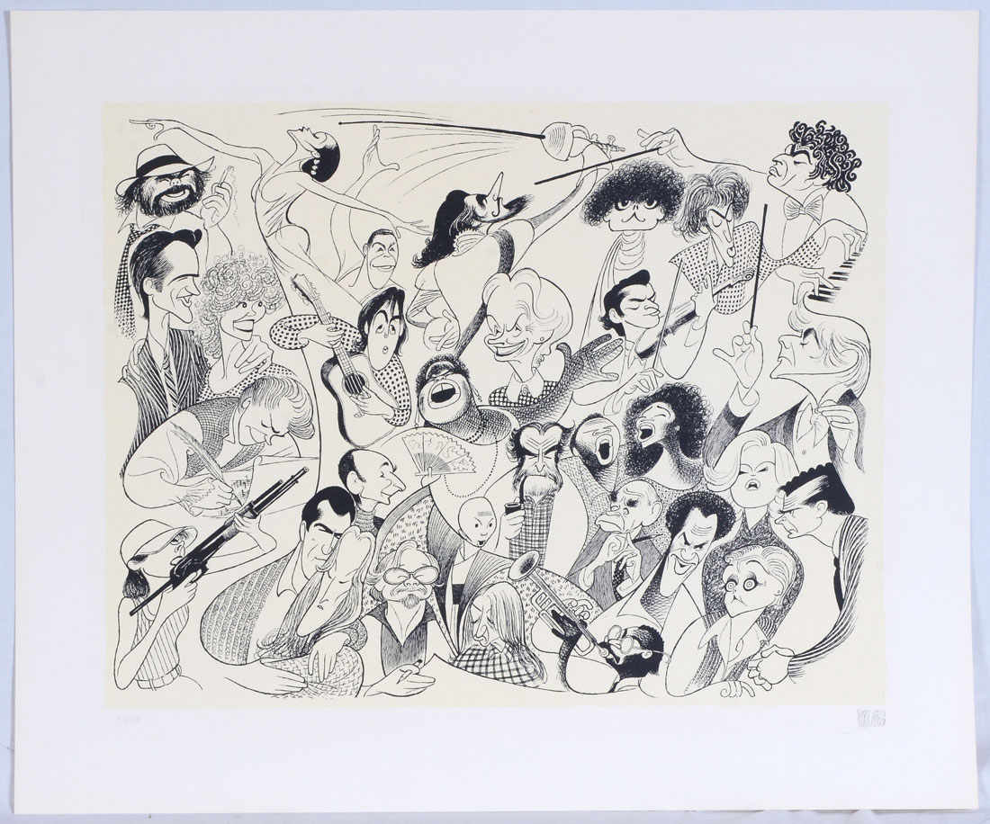 HIRSCHFELD, Albert, (American, 1903-2003): Lithograph, image: 16'' x 20.50'', sight size: 17'' x 21.50'', overall in black metal frame: 24'' x 28.25'', signed in pencil lower right: ''Hirschfeld'', numbered in pencil lower left: ''31/250''.