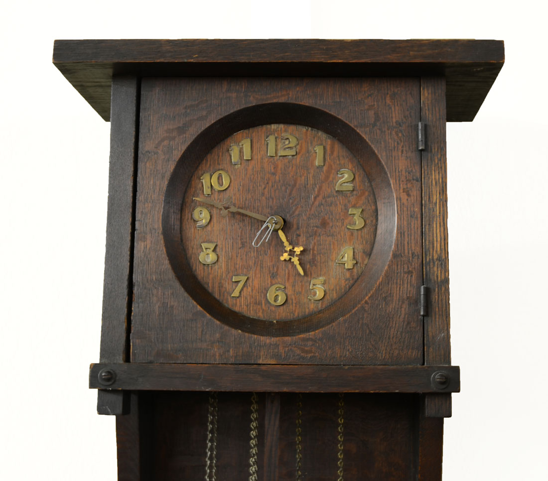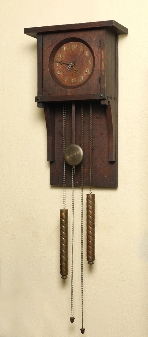 ARTS & CRAFTS MISSION OAK WALL CLOCK: Oak case, dial with applied brass Arabic numerals, heavy brass weights and pendulum time and strike movement. Overall measures 24 1/2'' h. x 15 1/4'' x 7''.