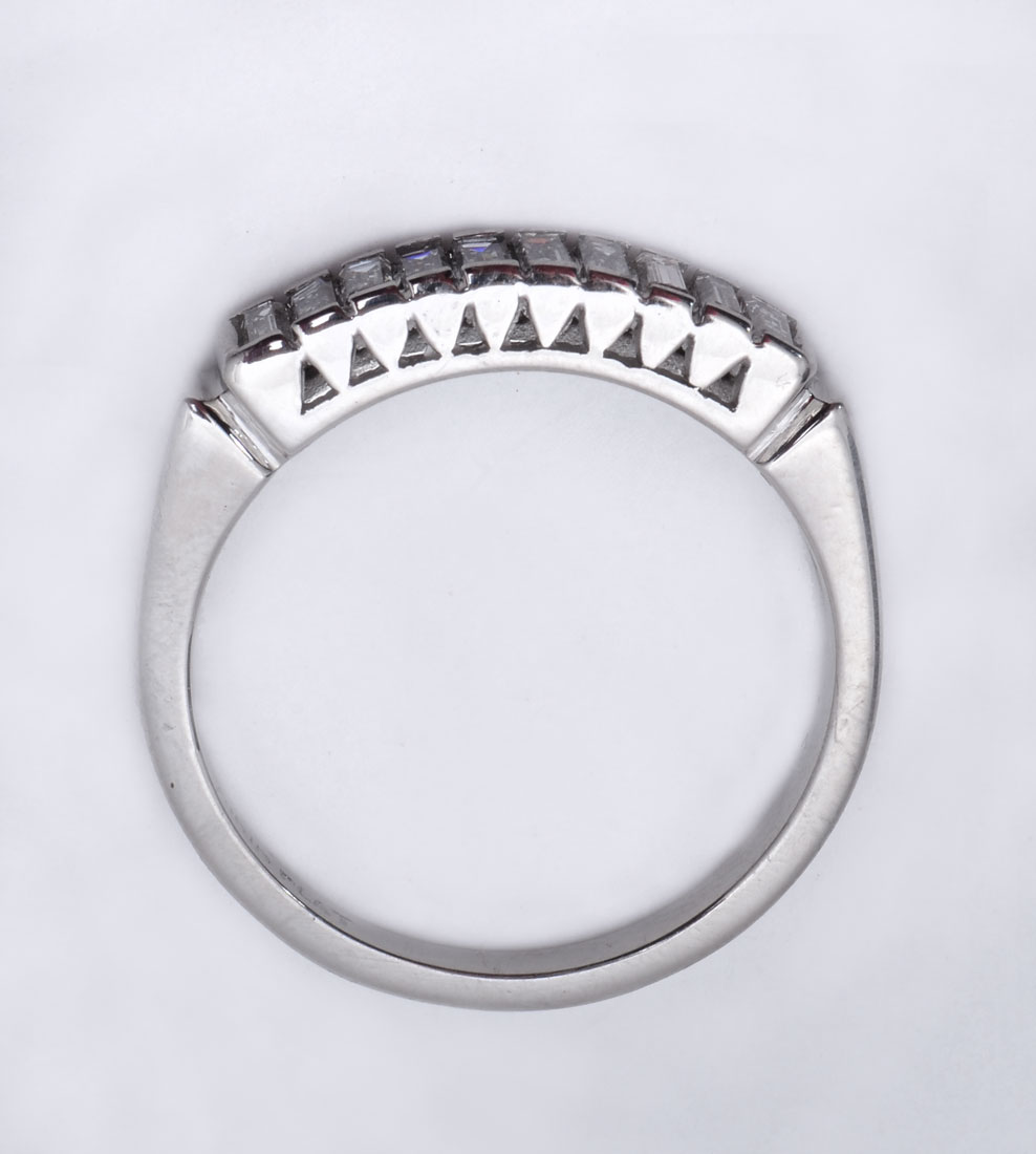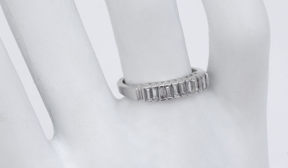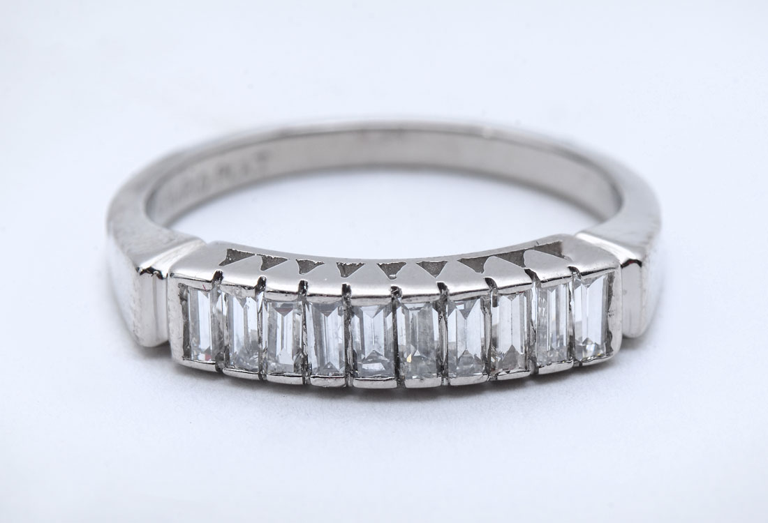 DIAMOND & PLATINUM ART DECO BAND: This ring sparkles! 10 baguette cut diamonds approx .25CTW, are VS in clarity and G in color. Weight 3.8 grams. Size 6. Sold with current Atlanta Gemological GIA graduate's appraisal for $1550.