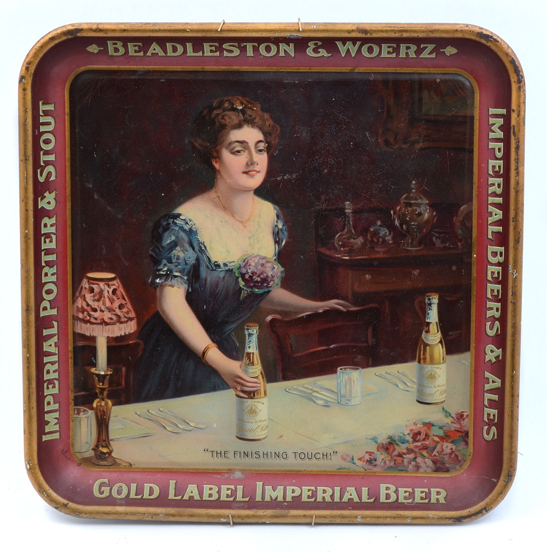 BEADLESTON & WOERZ TIN LITHO ADVERTISING TRAY: Tin lithograph image of woman placing beer bottles on table, border with ''Beadleston & Woerz, Imperial Beers & Ales, Gold Label Imperial Beer, Imperial Port & Stout''. 1 1/2'' x 13 1/2'' x 13 1/2''.