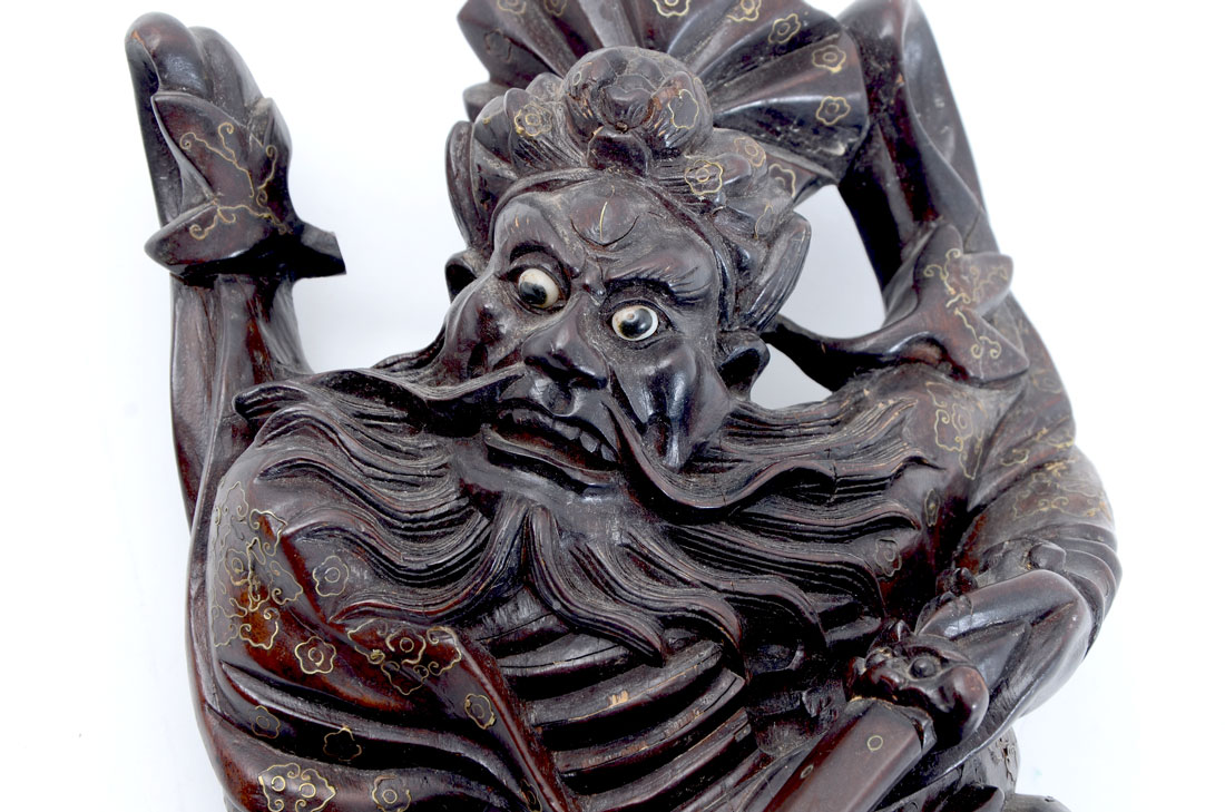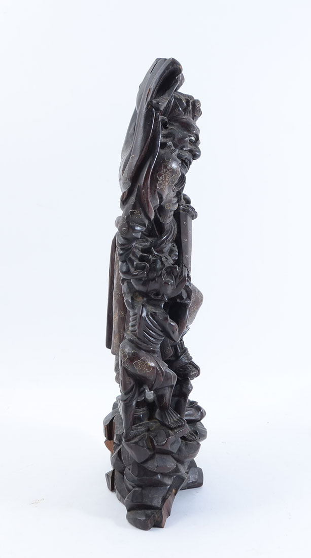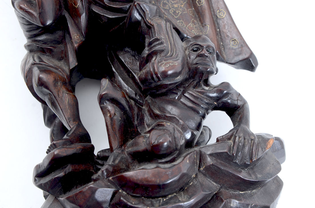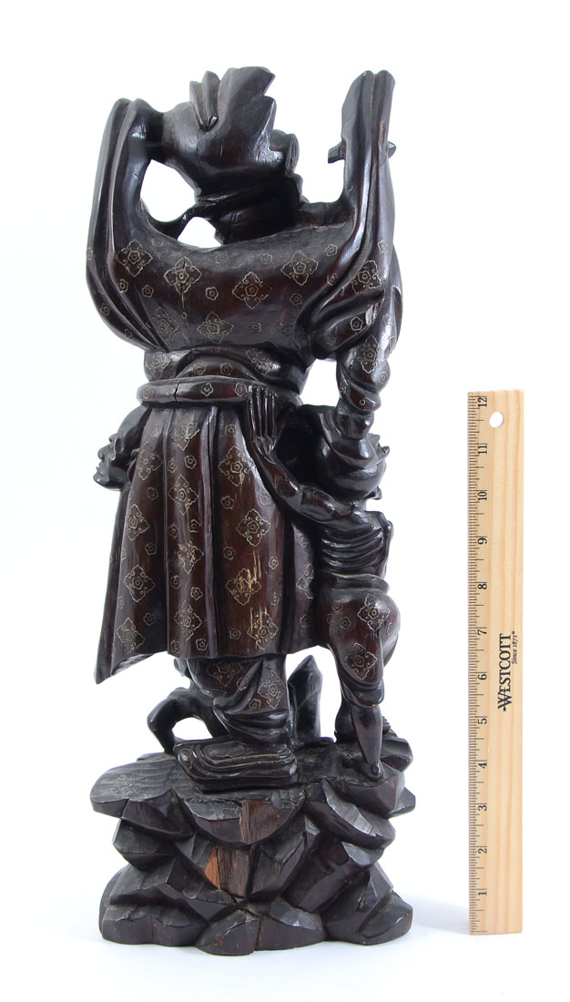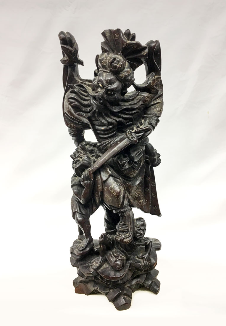 CHINESE CARVED WOOD FIGURE OF A DEITY: Nicely detailed carving with silver wire inlay of a Chinese warrior deity holding a sword to the neck of one person, standing on another, 2 other victims heads hanging off his belt. No visible signature, overall measures 19'' h. x 7 1/2'' x 5 1/2''.
