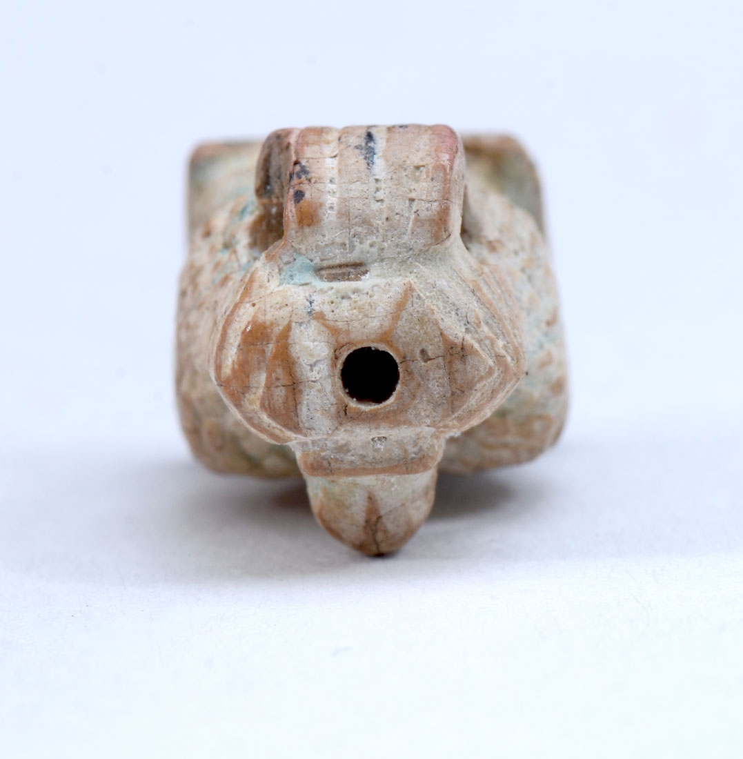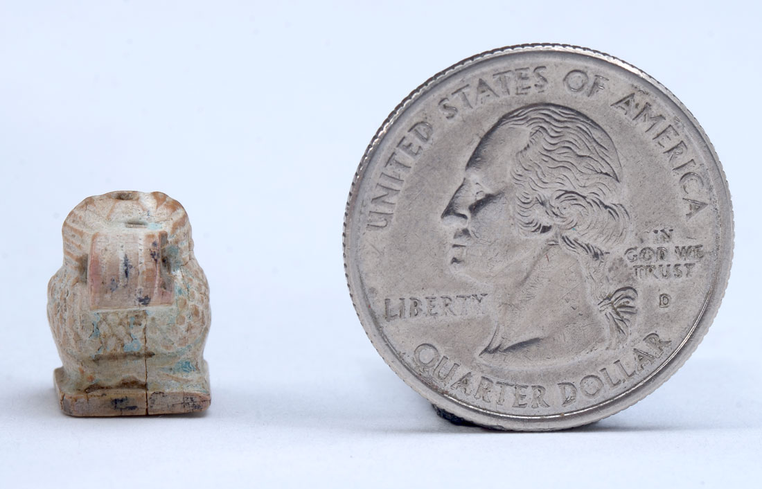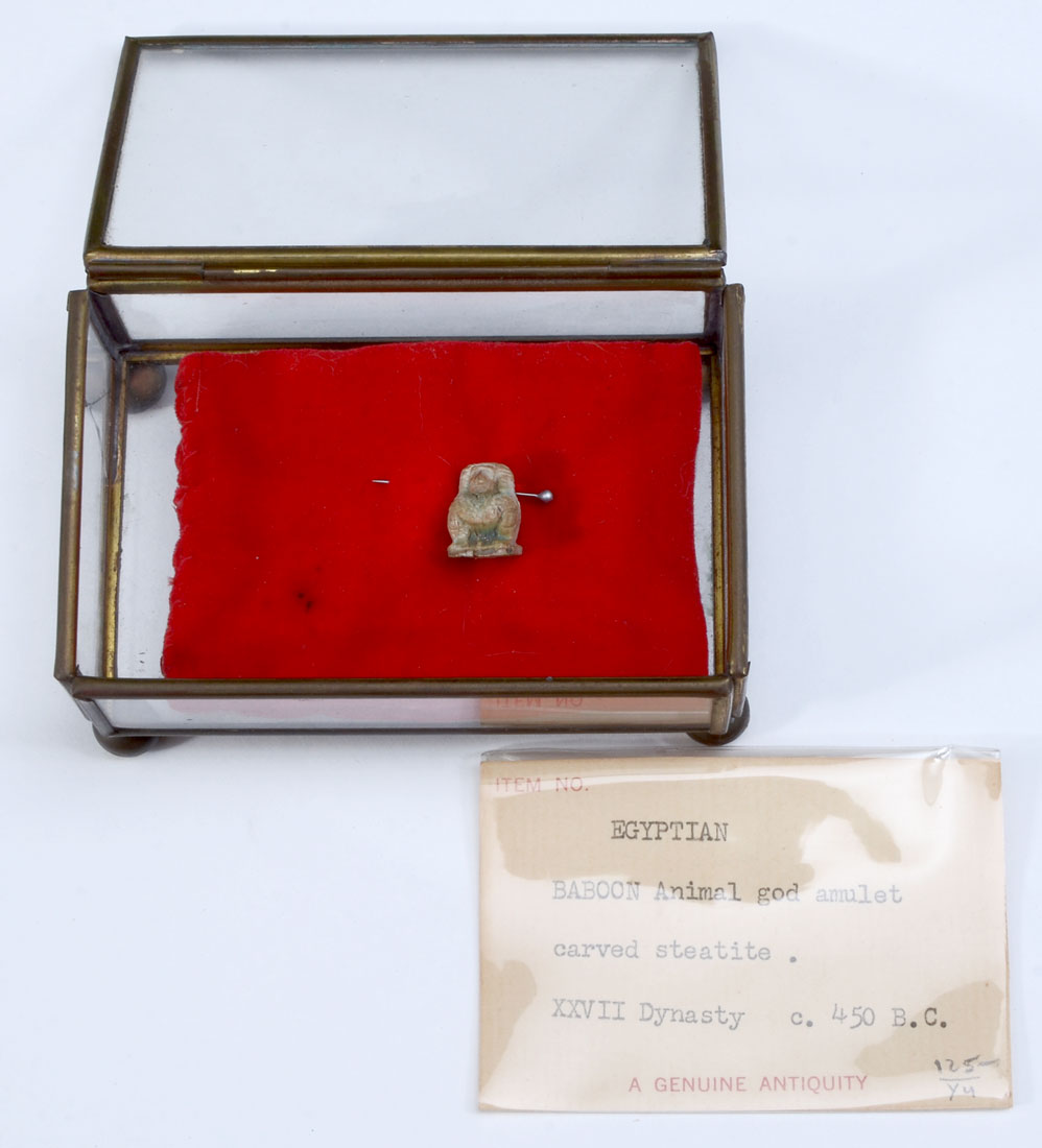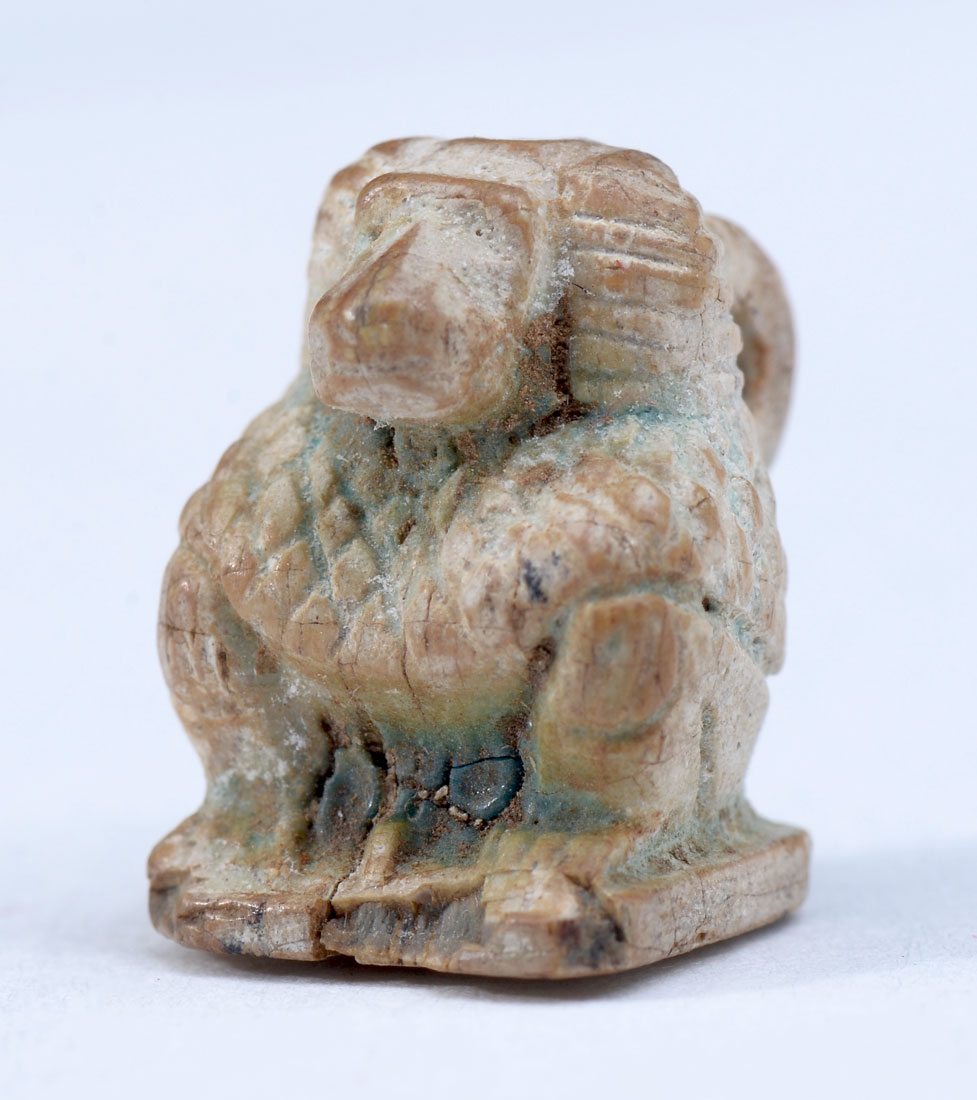 EGYPTIAN 27TH DYNASTY CARVED BABOON AMULET: Miniature carved steatite figural baboon amulet, possibly for the god Thoth, circa 450 BC, approx. 14 cm high.