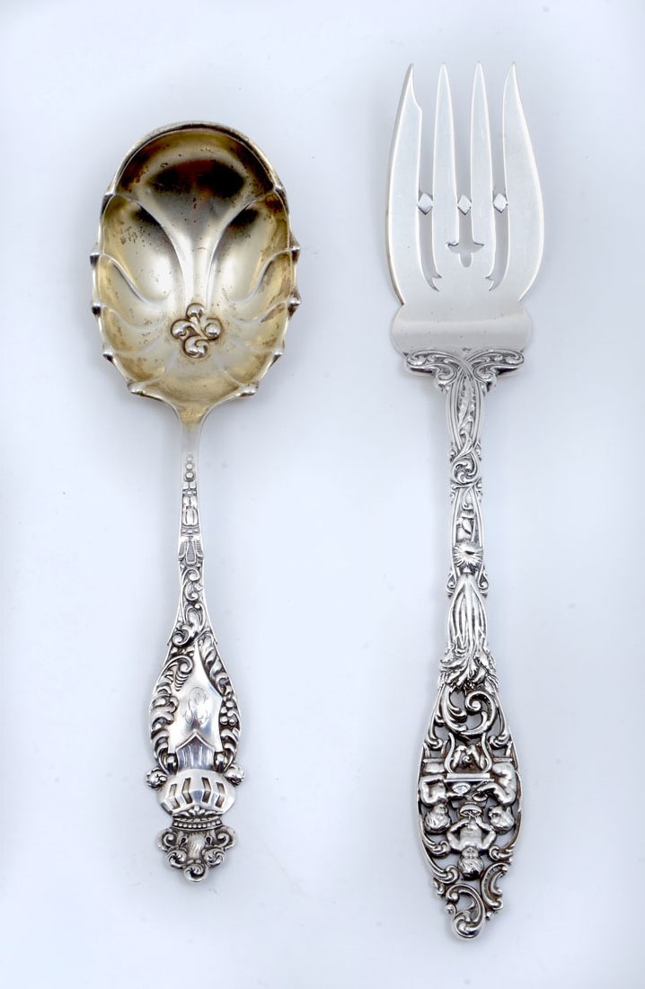 STERLING LABORS OF CUPID FORK AND MANCHESTER SPOON: 2 pieces total to include 1) Serving fork in the ''Labors of Cupid'' pattern by Dominick & Haff, 9 1/2''. 2) Embossed bowl serving spoon with crown & knights helmet finial, unknown pattern by Manchester Silver, monogrammed, 7 3/4''. Approx 4.9 troy oz. total.