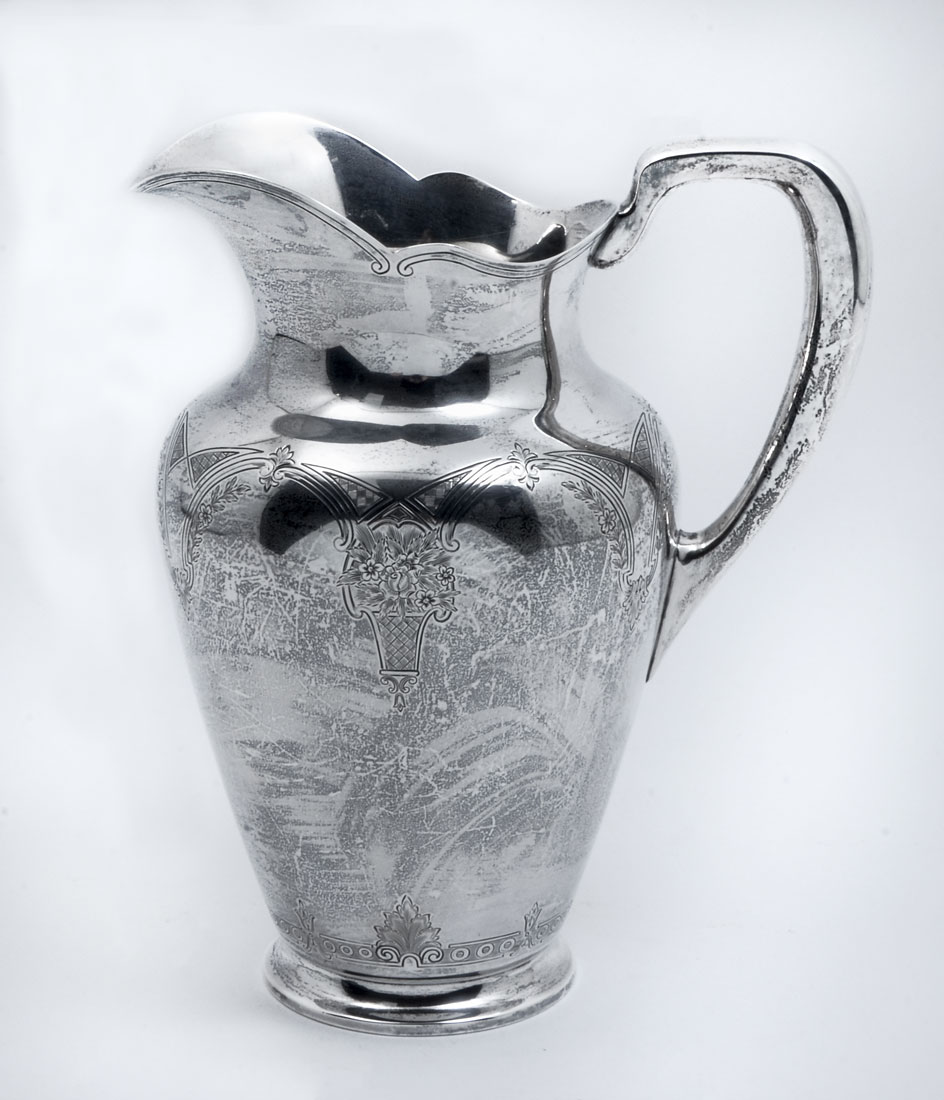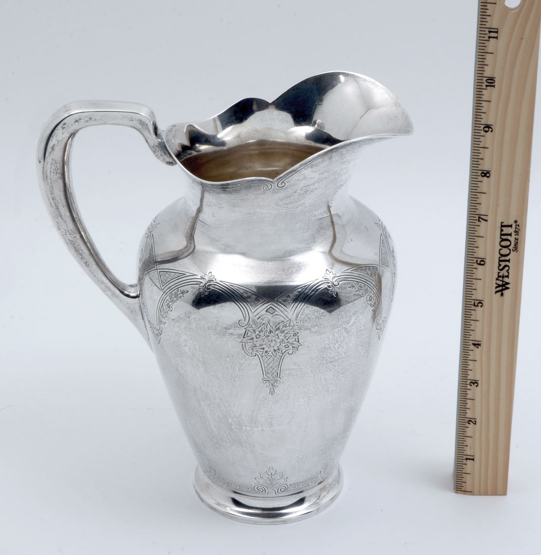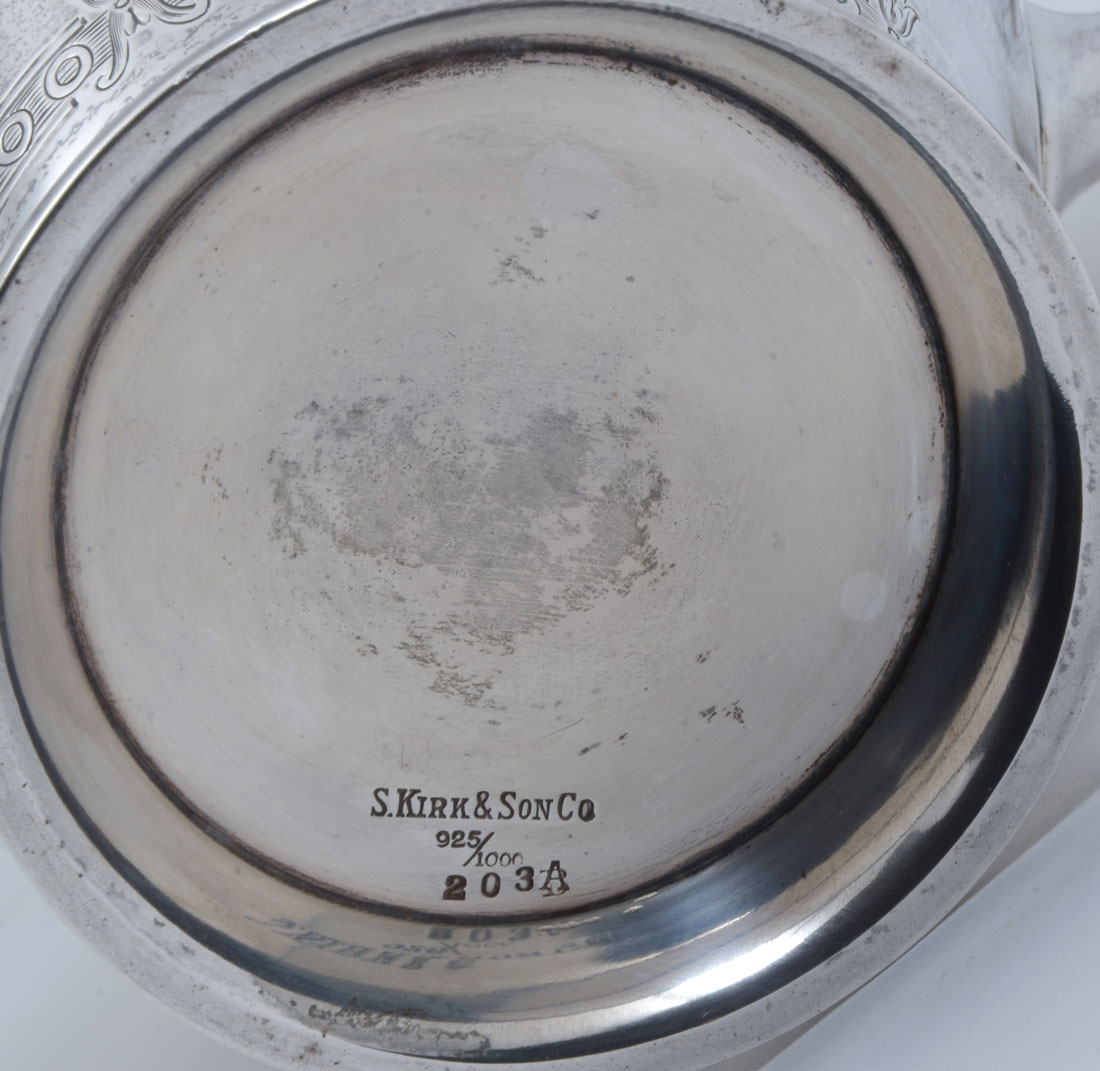 S. KIRK & SON ENGRAVED STERLING WATER PITCHER: Scalloped rim, engraved floral basket and garland motif, marked S. Kirk & Son, 925/1000, 203A. Measures 9 1/4'' h. x 7 1/2''. Approx. 24.4 troy oz.