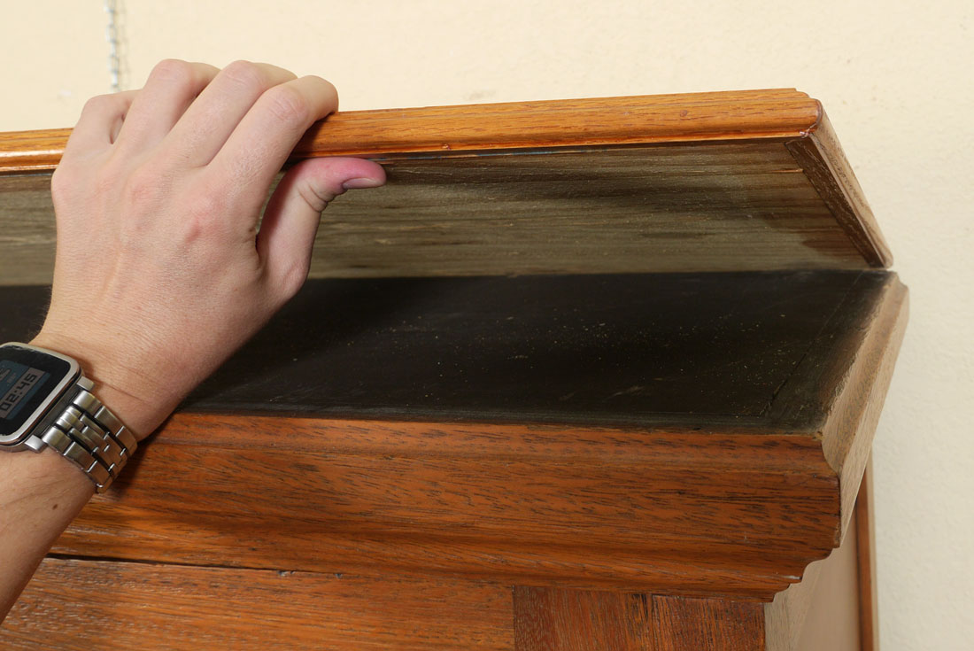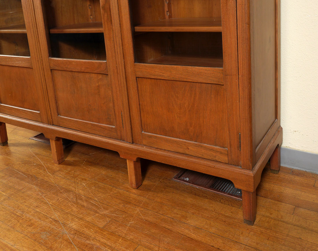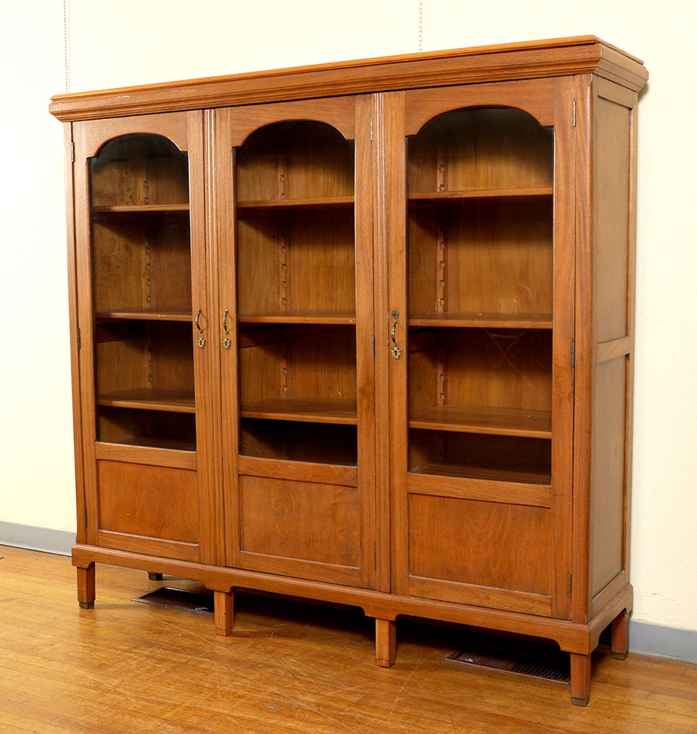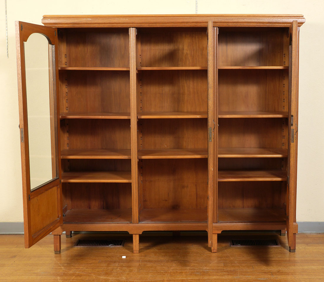 3 DOOR GOLDEN OAK BOOKCASE: Stepped cornice, each of the 3 sections with adjustable interior shelving. On later applied legs, overall 69'' x 73 1/4'' x 18''.