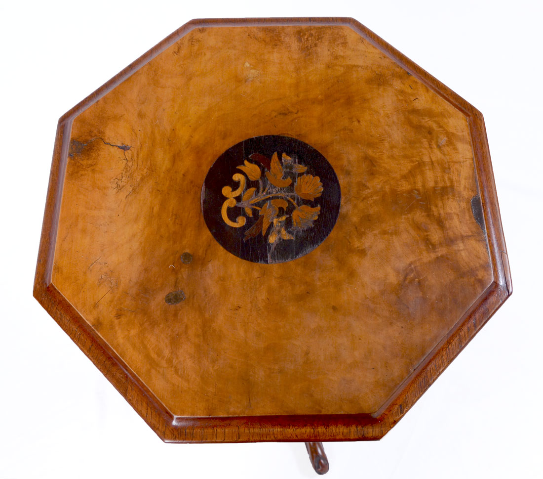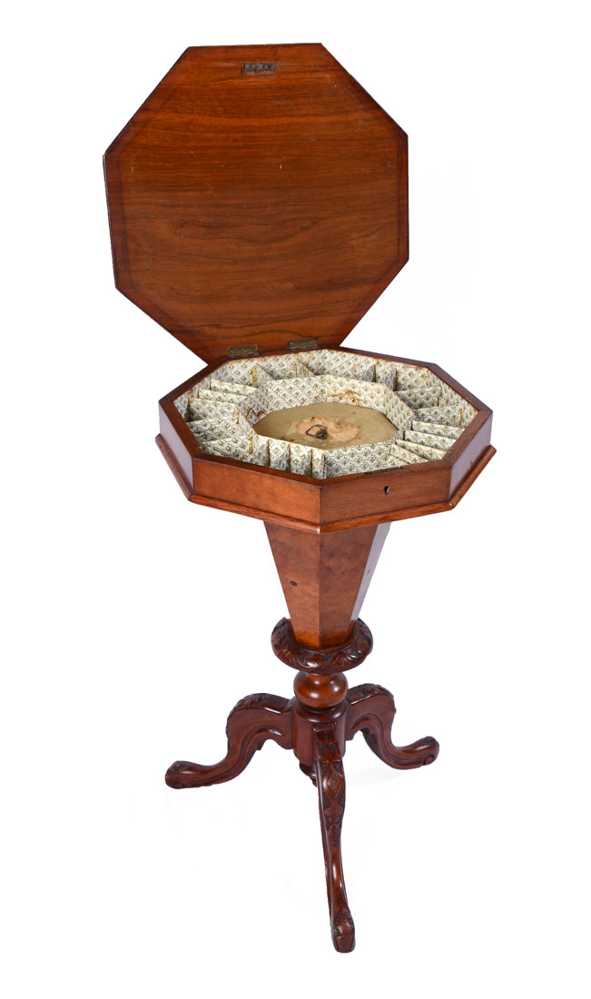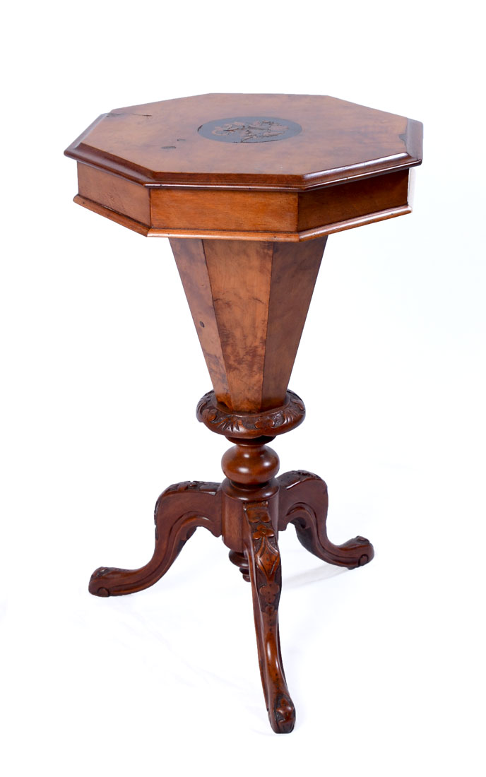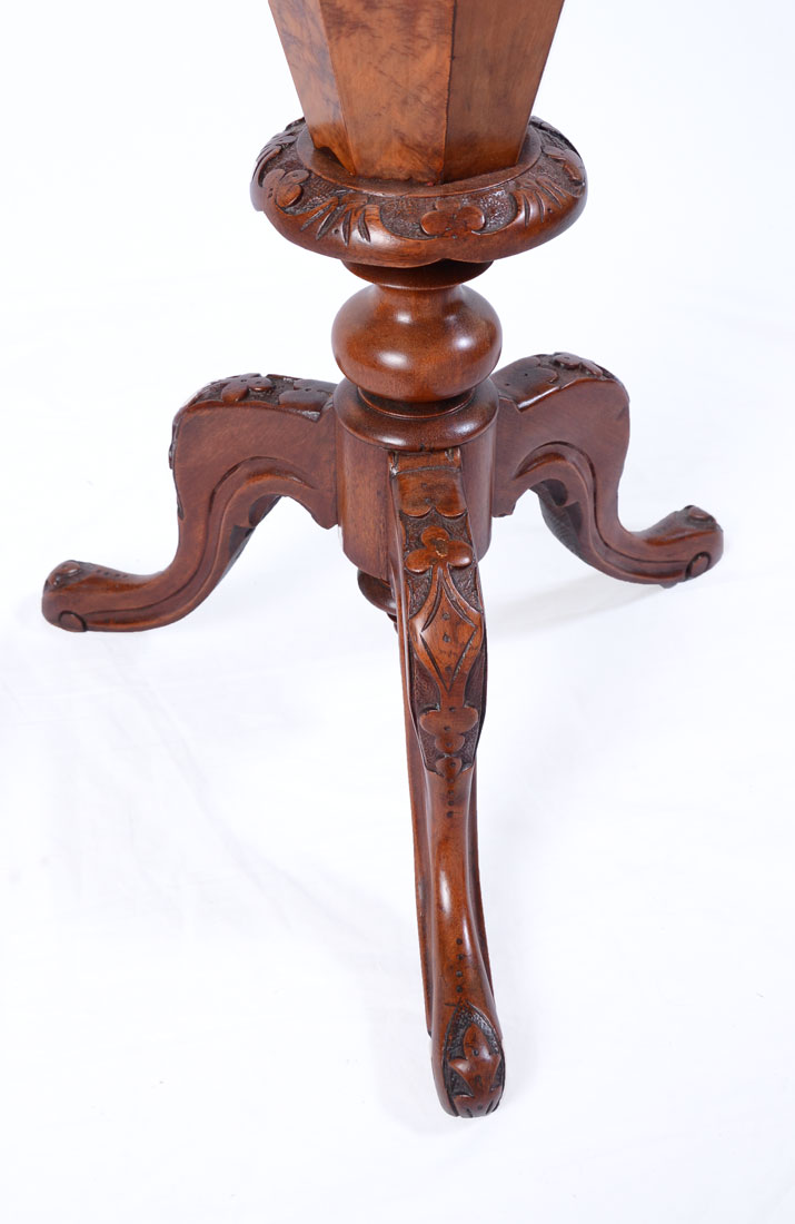 CONTINENTAL CARVED & INLAID SEWING TABLE: Octagonal hinged lid top with center marquetry inlaid floral medallion. Fitted interior, tapered hollow shaft. Carved base with foliated motifs, on 3 shaped legs, overall 29 1/2'' h. x 17 1/2''.