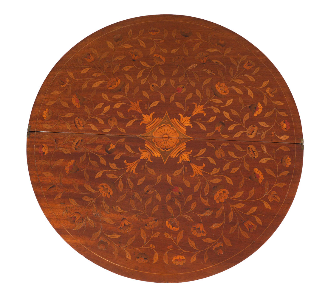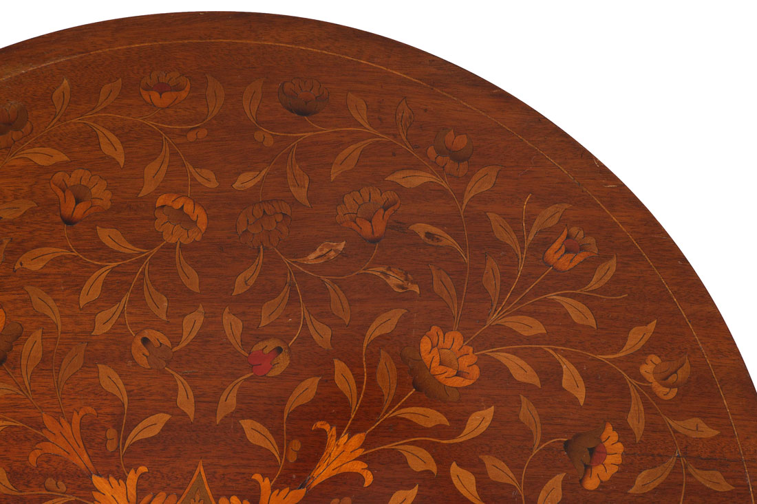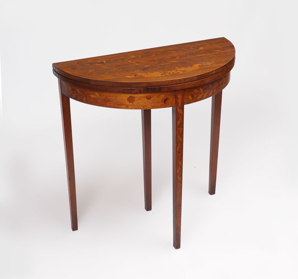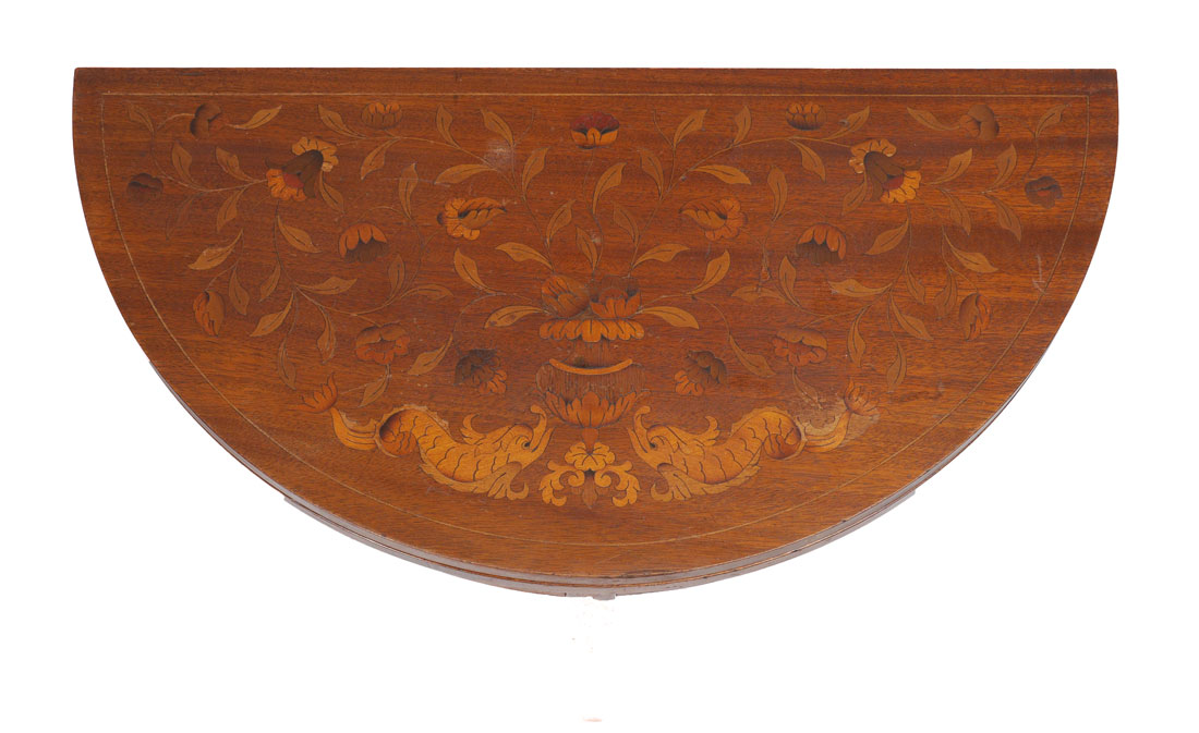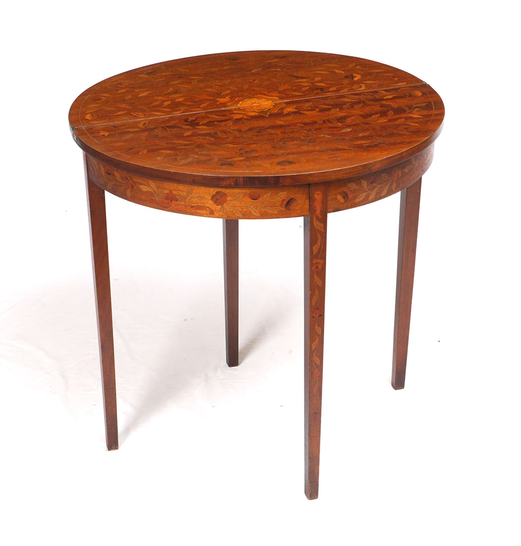 19TH CENTURY DUTCH MARQUETRY FLIP TOP TABLE: Flip top occasional table, marquetry inlaid top, skirt, and tapered legs with floral and stylized motifs. Overall 30'' h. x 30'' x 15'' with top closed.