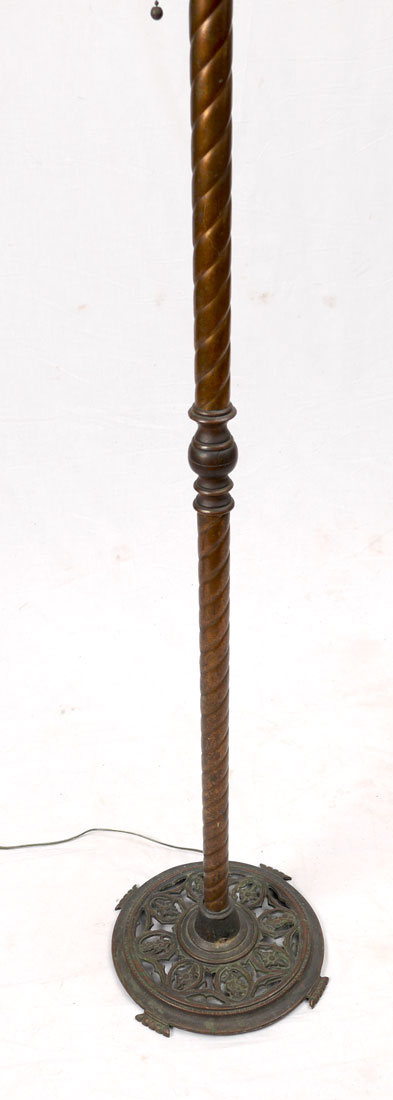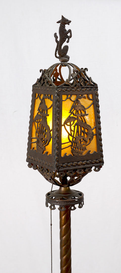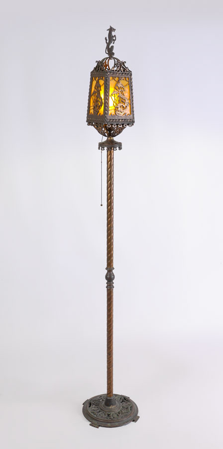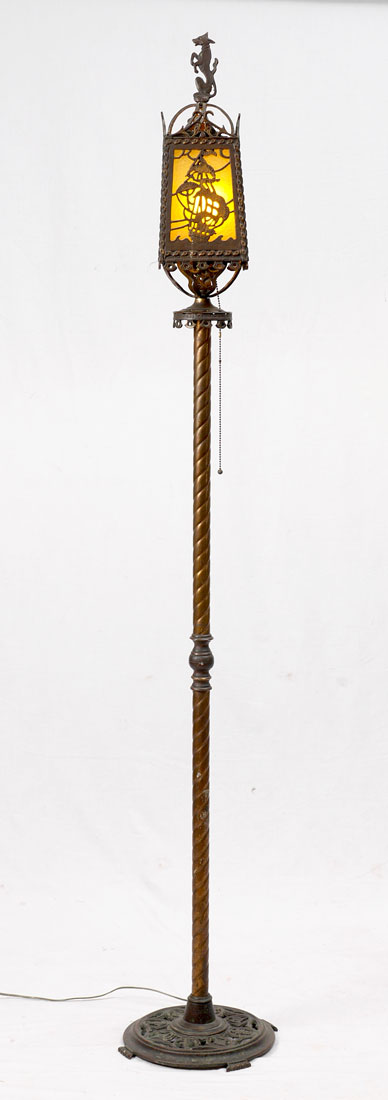 ARTS & CRAFTS SHIP MOTIF FLOOR LAMP: Mixed metal floor lamps, cast 4-sided shade with openwork ship motif backed with glass panels, begging dog finial, twist brass shaft, cast pierced base. Overall measures 71 1/2'' h. x 12 1/2'' base dia.