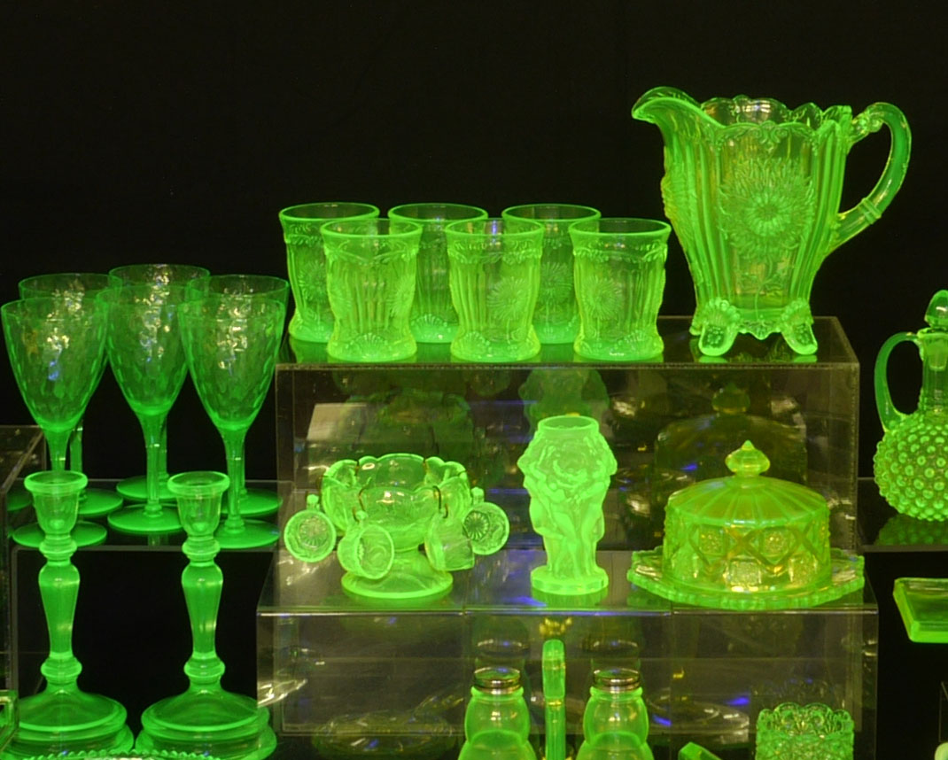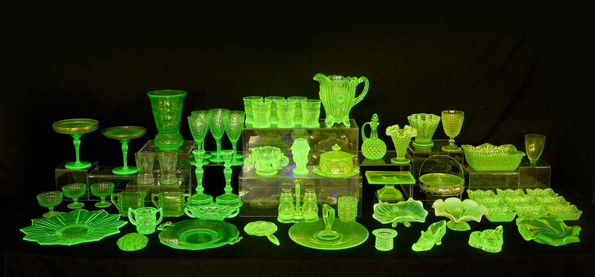 LARGE LOT OF YELLOW AND GREEN VASELINE GLASS: Estate collection of approximately 60 pieces of Vaseline Glass both yellow and green. All pieces have been viewed under black light and offer that warming florescent green glow. Sold as a lot complete with 2 ultraviolet black lights.