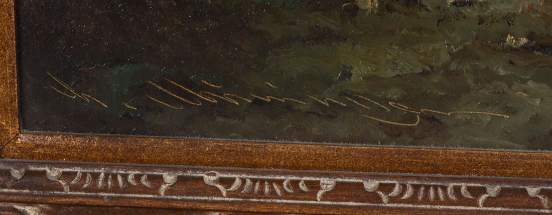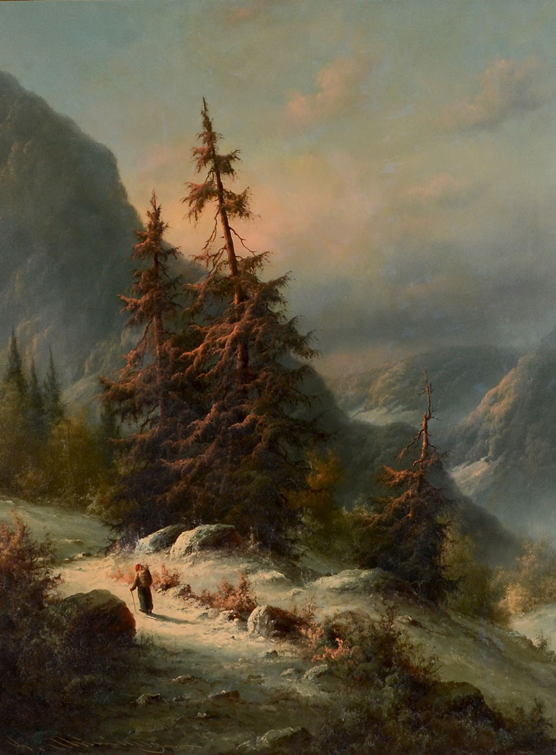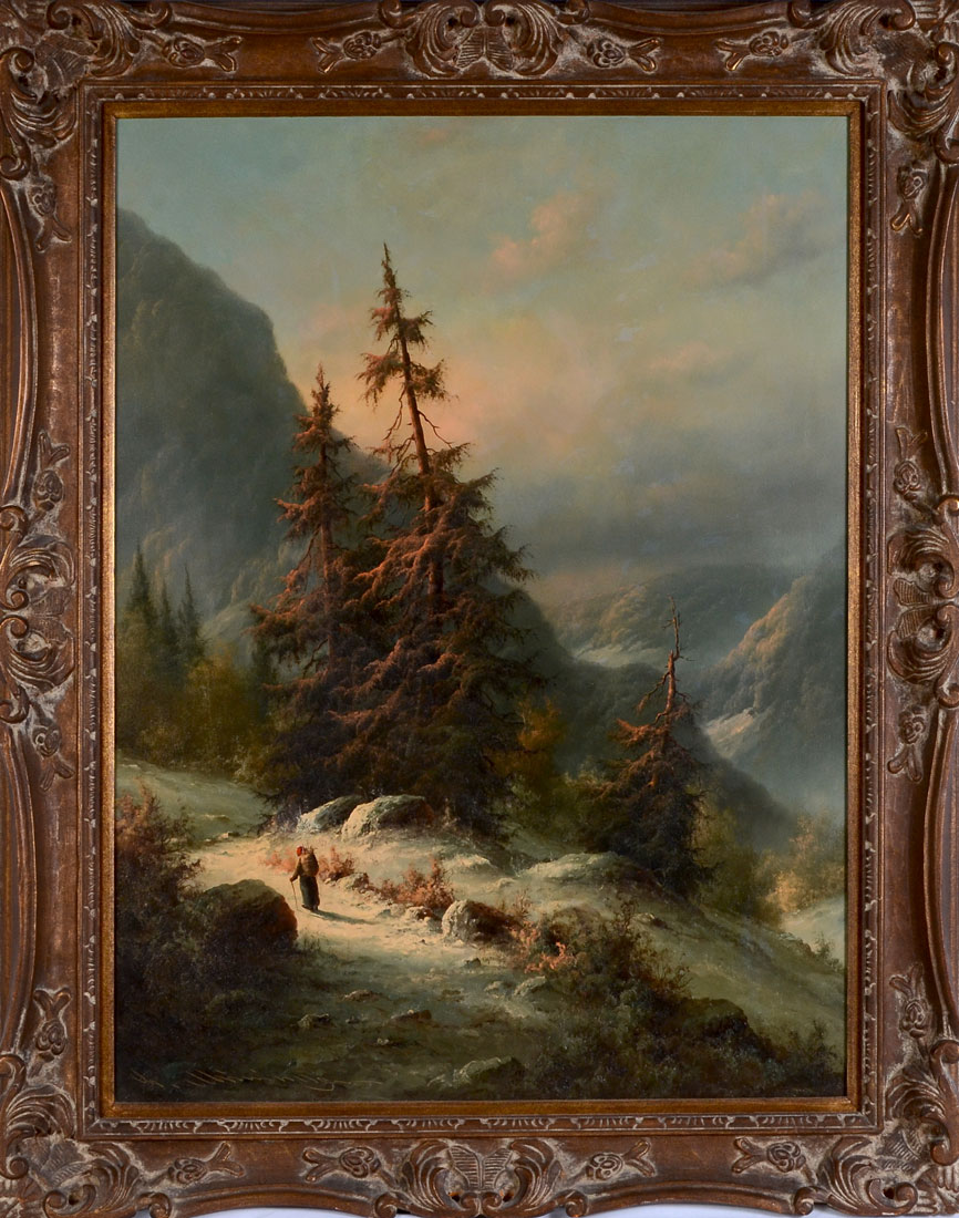 MUNNINGER, Ludwig, (German 20th Century): ''Lone Figure Traveling Along a Snowy Alpine Trail'', Oil/Canvas, sight size is 40'' x 30'', signed lower left, carved wood frame is 49'' a 39''.