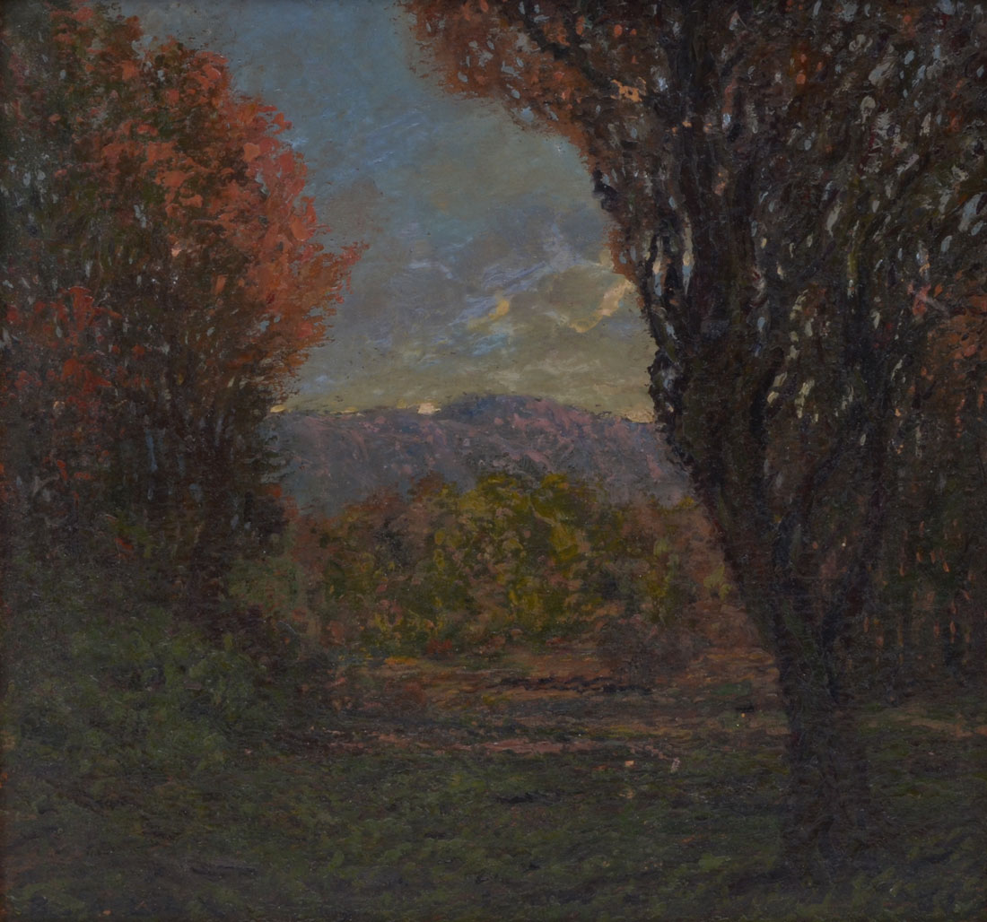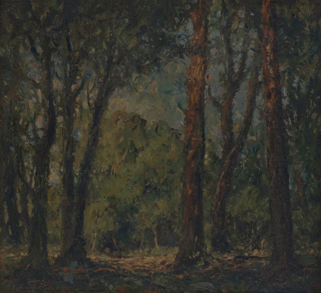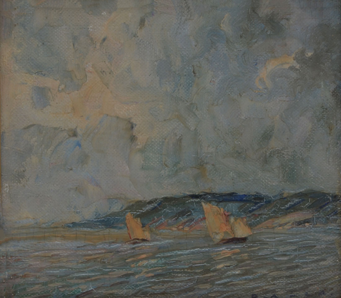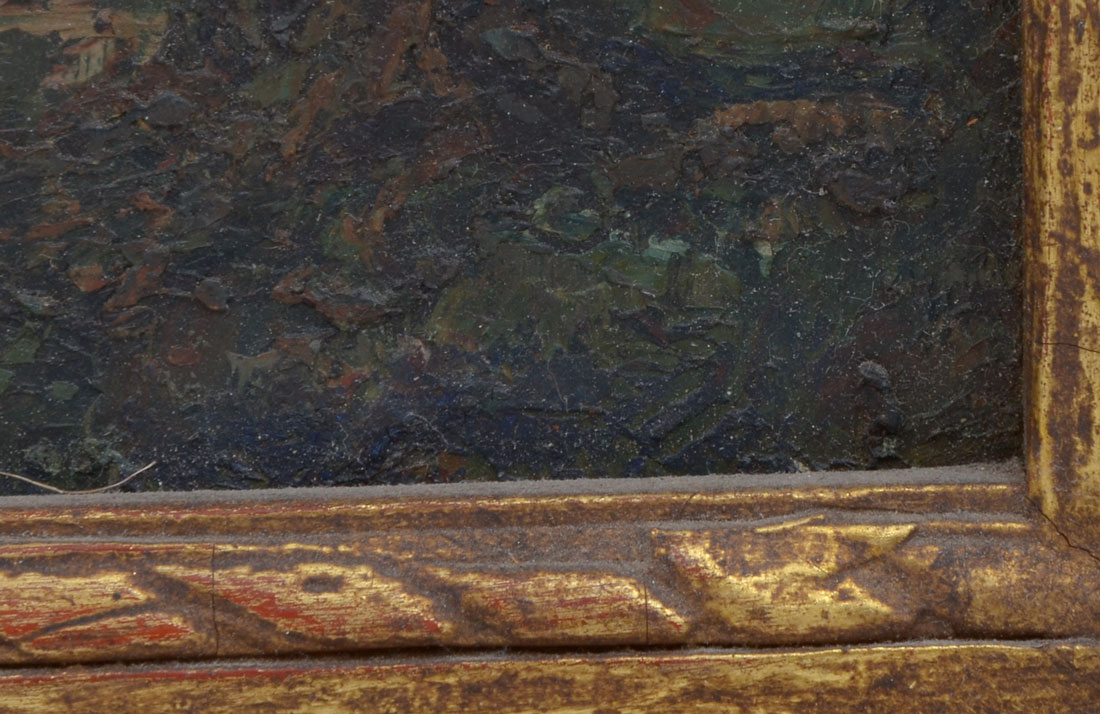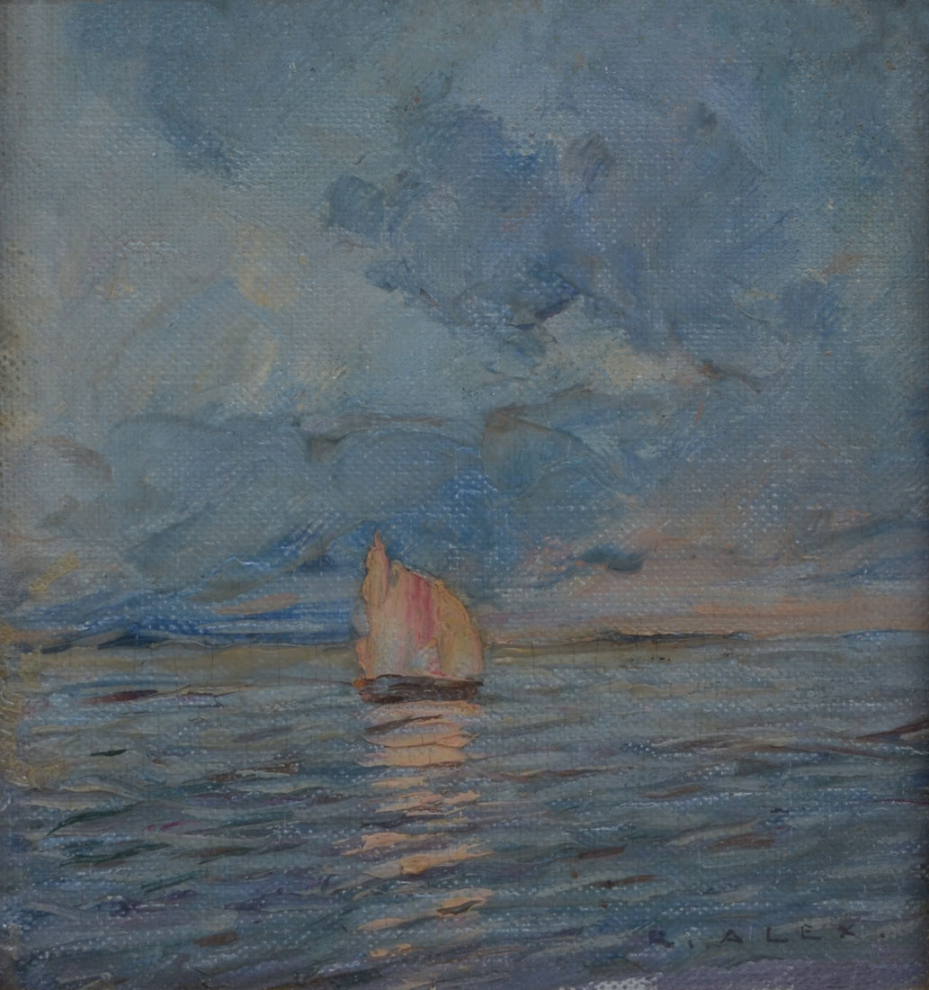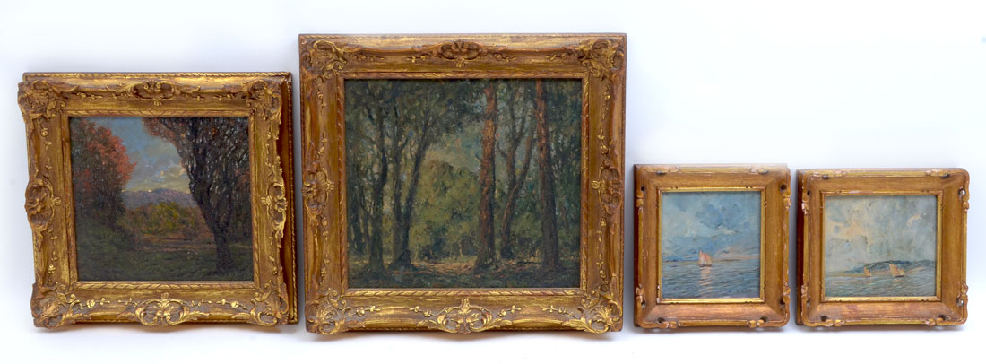 4 RUDOLF ALEX OIL PAINTINGS: 1) Dark Forest Scene, Oil/Board, 10'' x 11.25'', gilded frame, 14'' x 15''; 2) ''Landscape'', Oil/Board, 8'' x 8.5'', signed lower left, gilded frame, 12'' x 12''; 3) ''Sunny Sail'', Oil/Canvasboard, 5.5'' x 5'', signed lower right, labeled verso, carved and gilded frame, 7.5'' x 7''; 4) ''Near the Coast'', Oil/Canvasboard, 5'' x 5.75'', signed lower right, labeled verso, carved and gilded frame, 7'' x 7.5''. 3 of the pictures have a D.J. Healy framing label affixed verso.