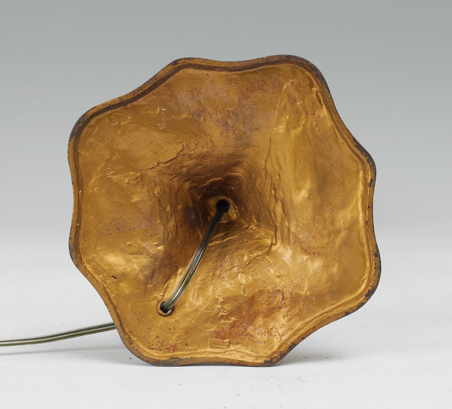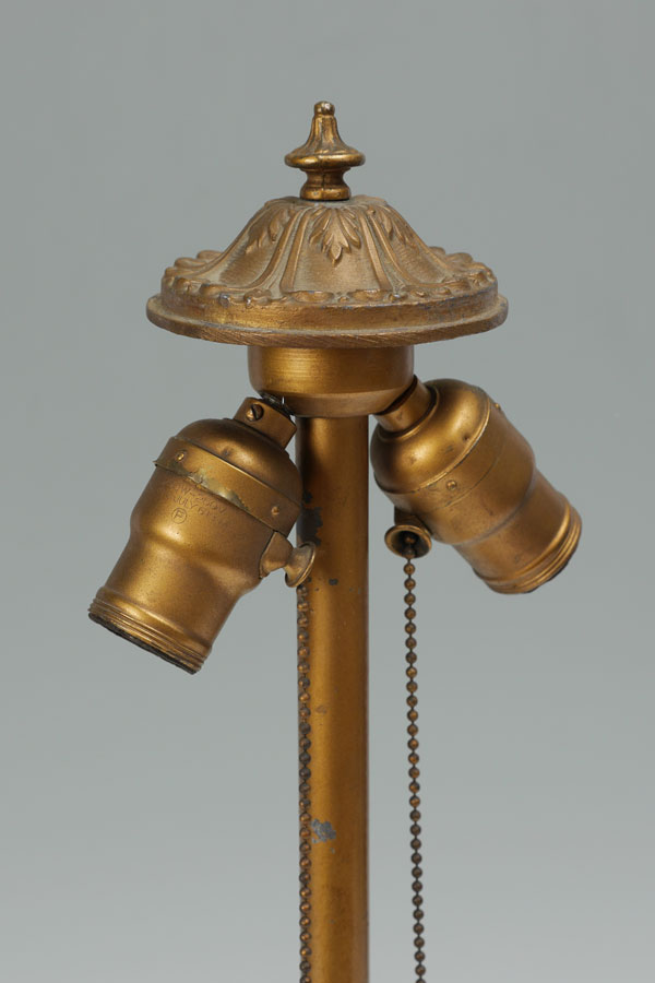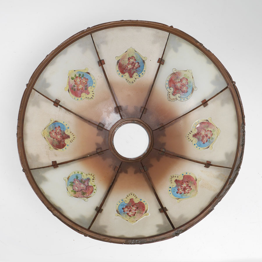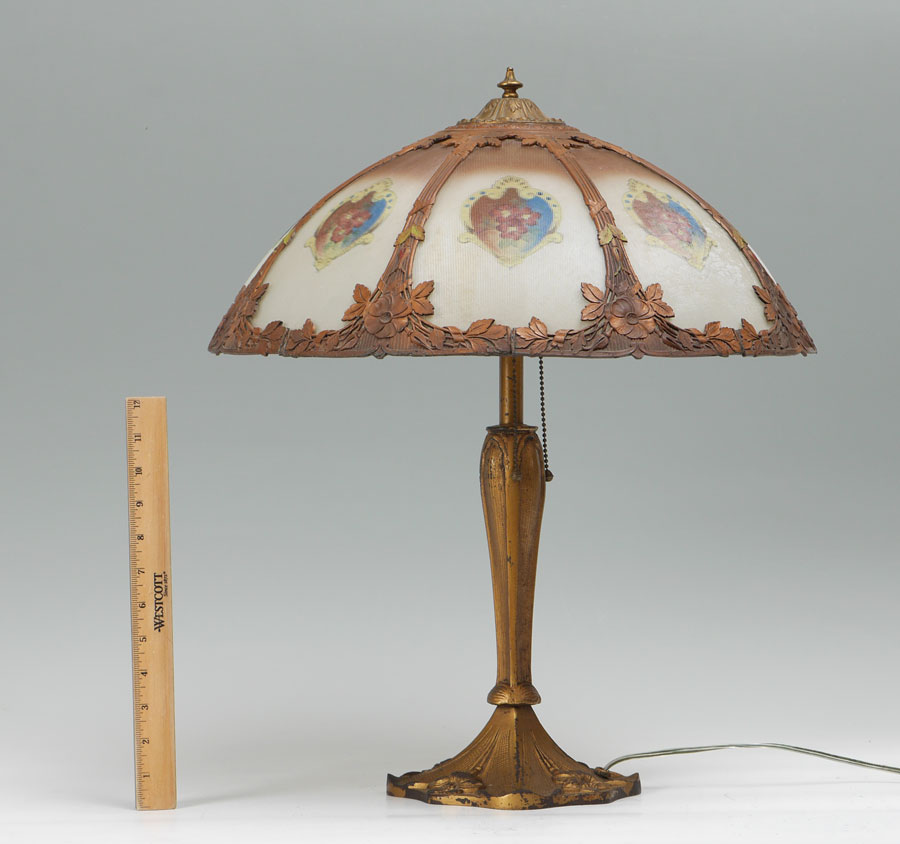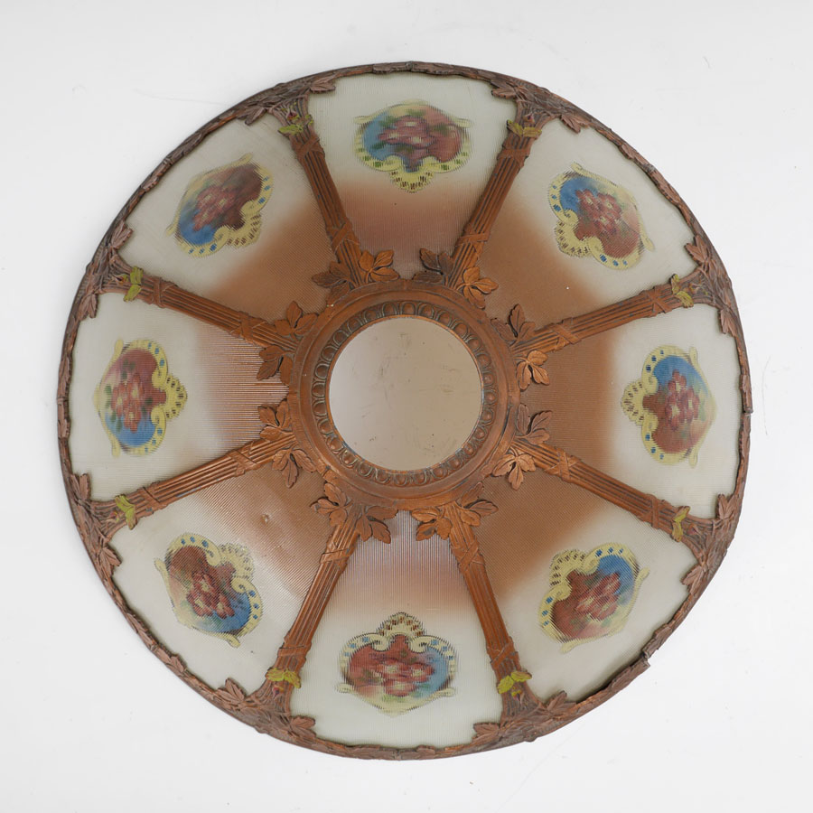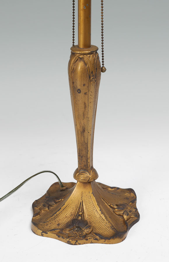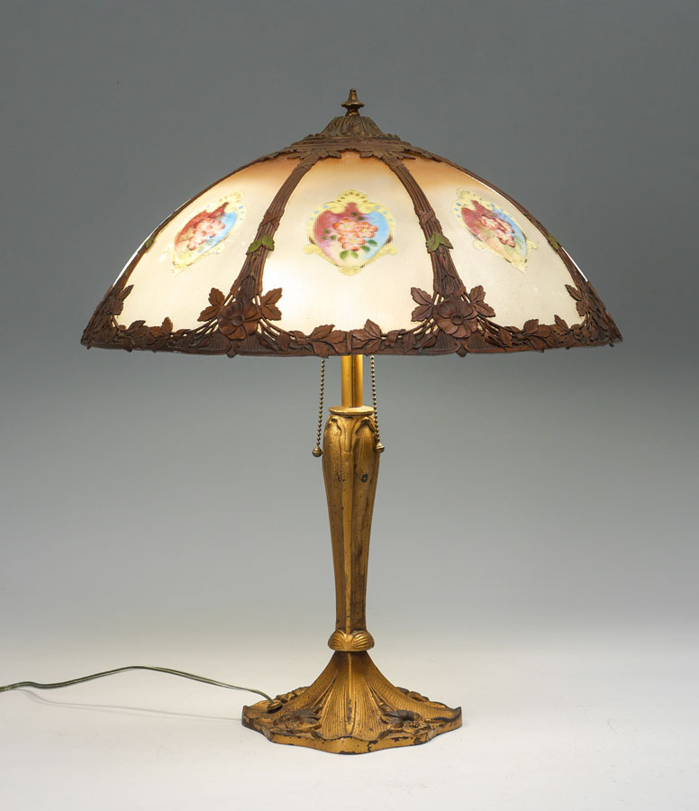 8 PANEL RIBBED REVERSE PAINTED LAMP: Gold painted cast iron base with floral motif on foot, double socket fixture, overall measures 22 1/2'' x 7''. 8 panel revers painted shade with ribbed exterior texture, metal foliate motif frame, 7 1/4'' h. x 18 1/2'' dia.