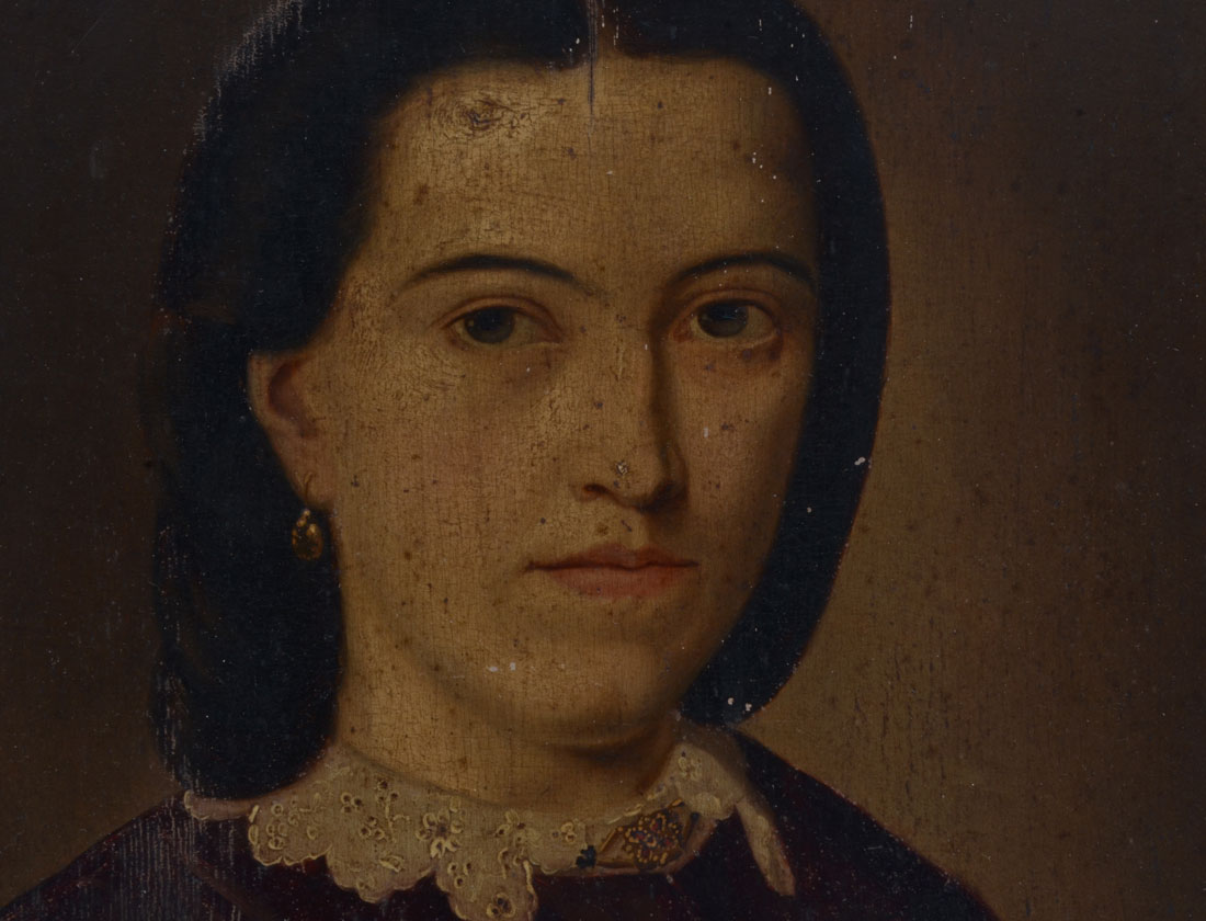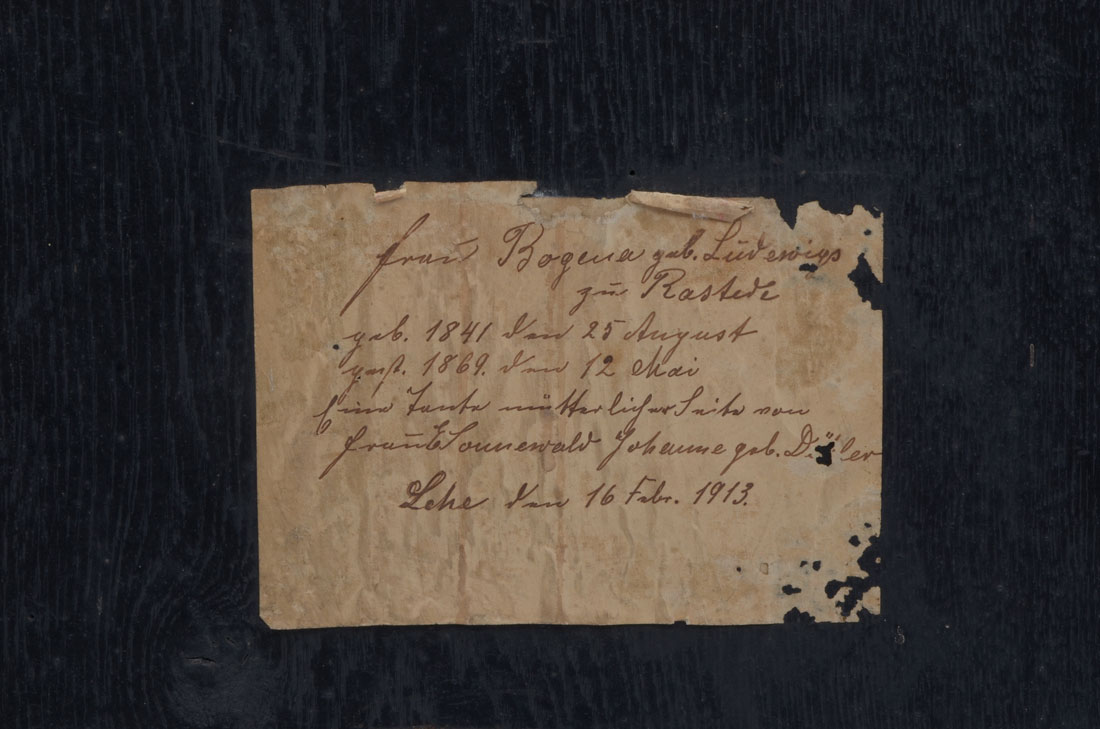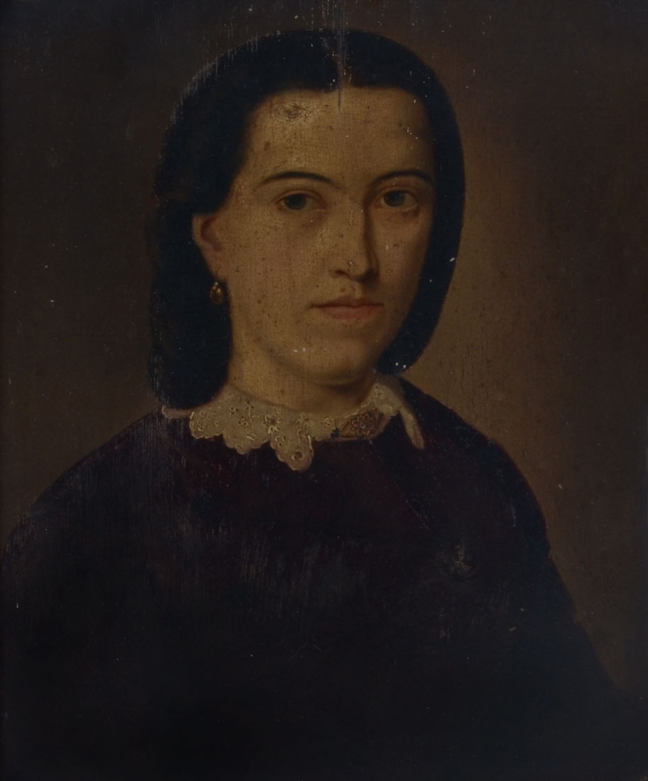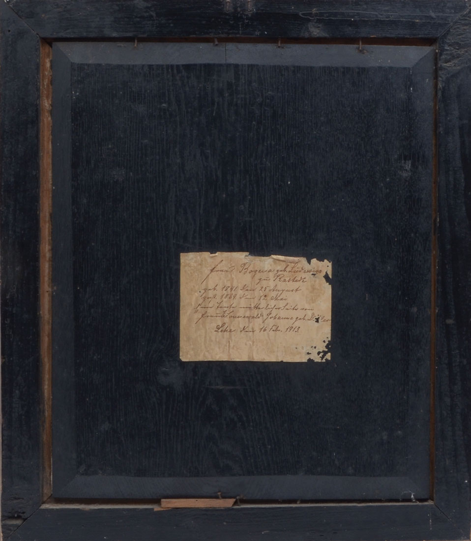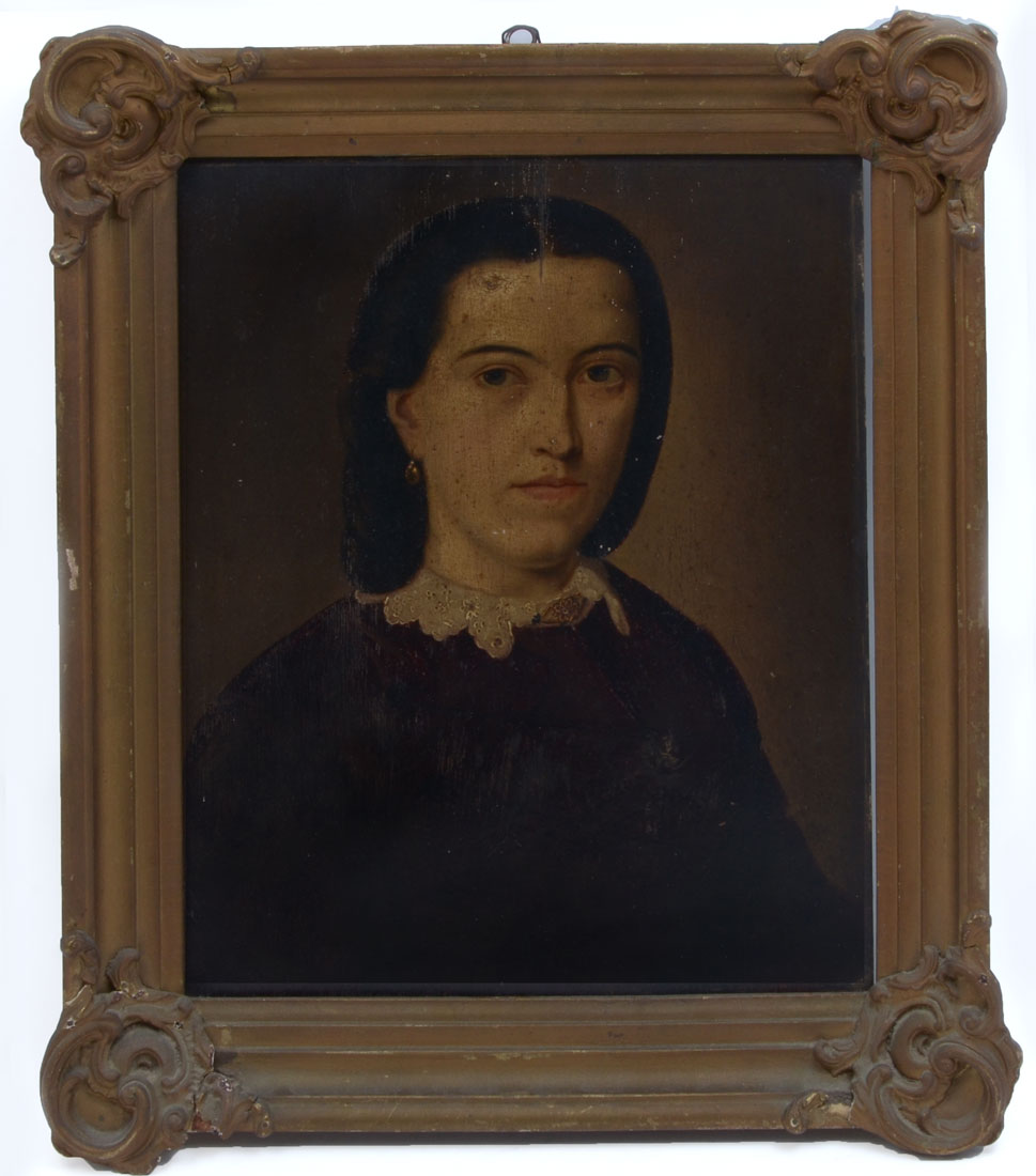 ANTIQUE GERMAN PORTRAIT PAINTING: Young woman sitting for artist, illegible inscription verso, Oil/Wood Panel, 17.25'' x 14.5'', gilded gesso frame, 22'' x 18.5''.