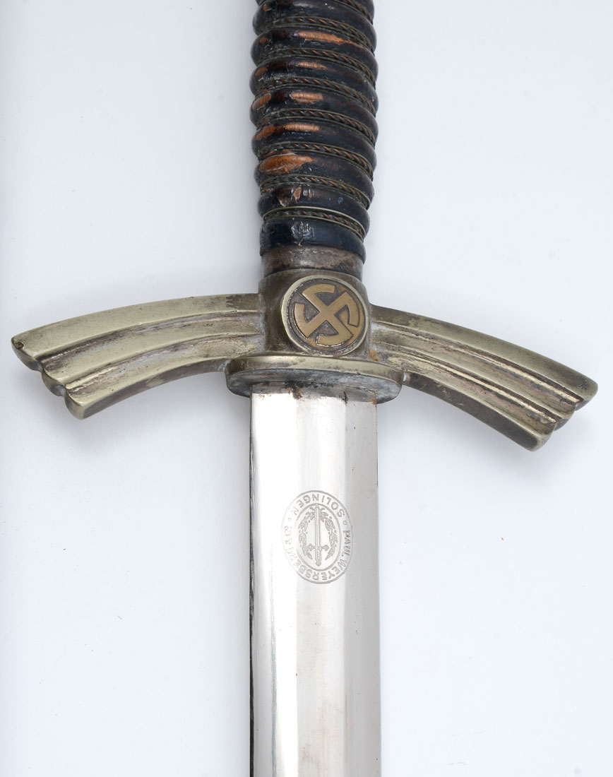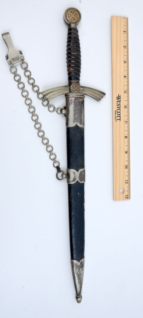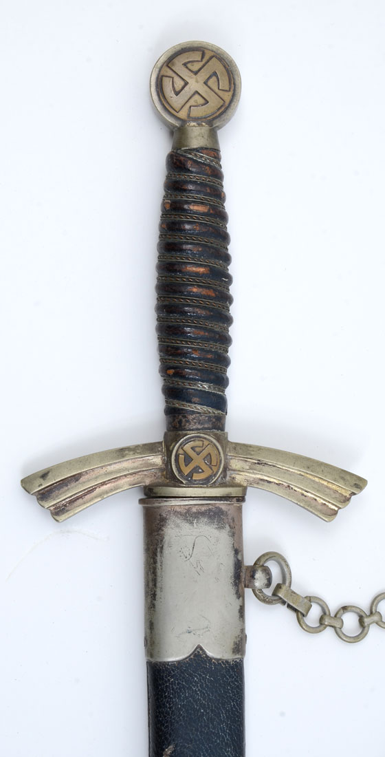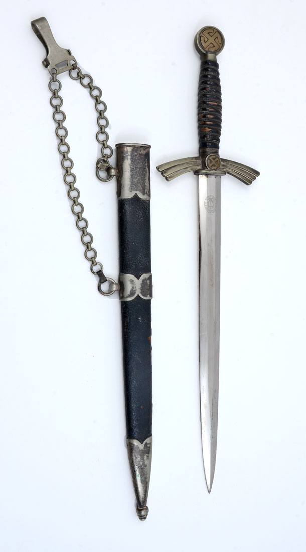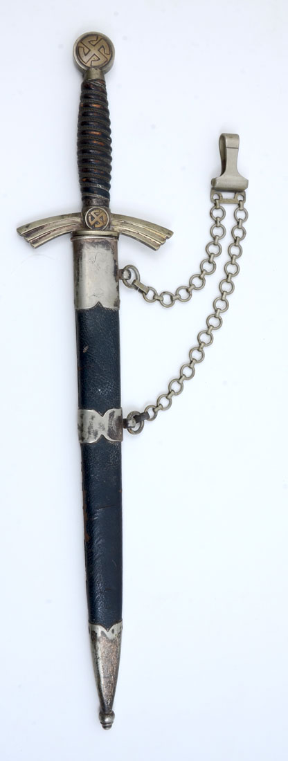 WEYERSBERG 1ST MODEL GERMAN WWII LUFTWAFFE DAGGER: First model, finial and cross guard with typical German symbols, leather wrapped grip, 11 3/4'' bright blade marked ''Paul Weyersberg, Solingen''. Leather wrapped metal scabbard with original hanger, overall 19'' long.