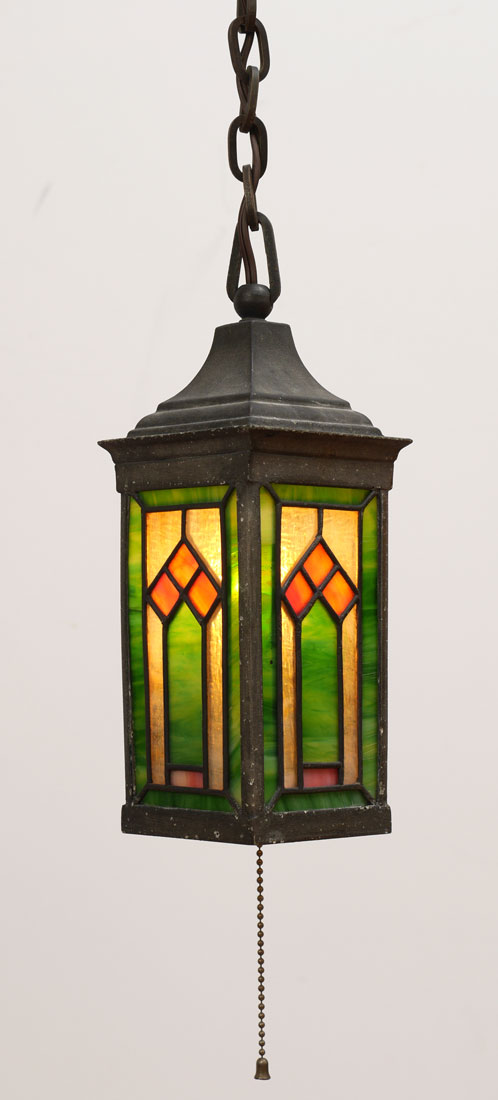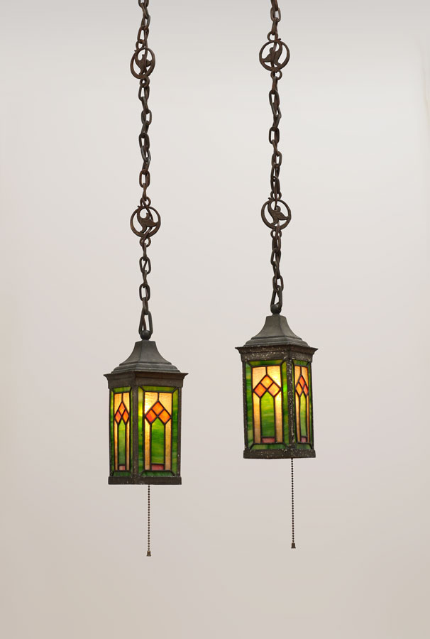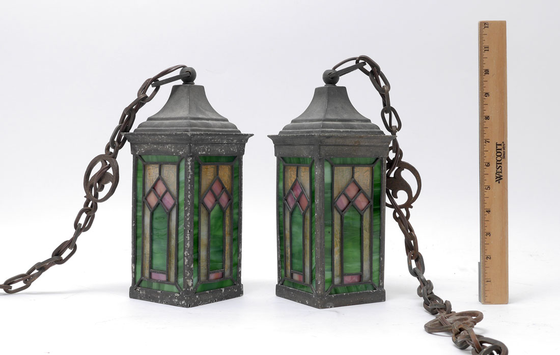 PAIR OF ARTS AND CRAFTS HANGING LEADED FIXTURES: 4-sided hanging light fixtures with polychrome leaded glass panels, metal frame, cast iron chains. 10 1/4'' h. x 3 1/4'' x 3 1/4''.