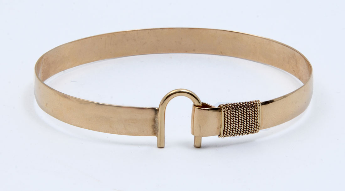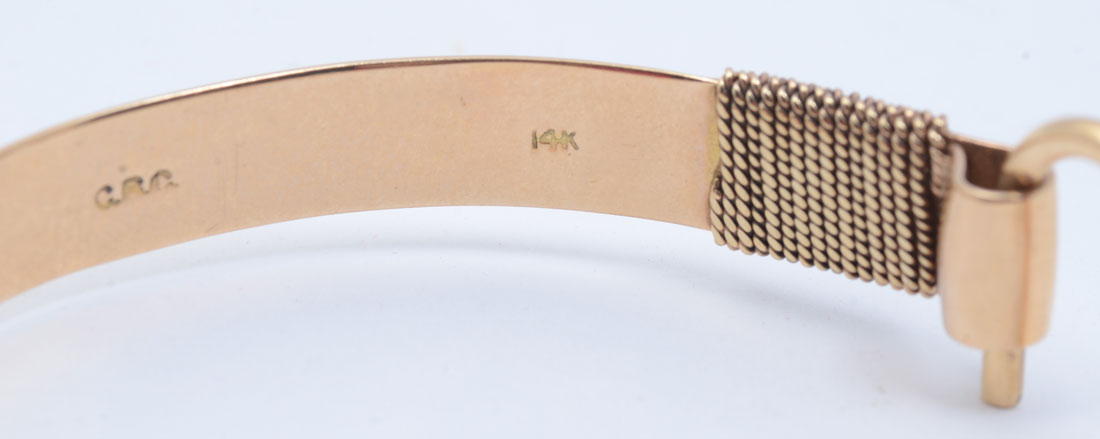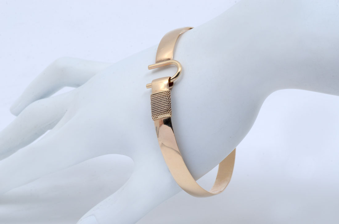 14K BANGLE WITH CARIBBEAN HOOK: 21.6 gram yellow gold bangle is modern and elegant. Inside measures approx 8.5''