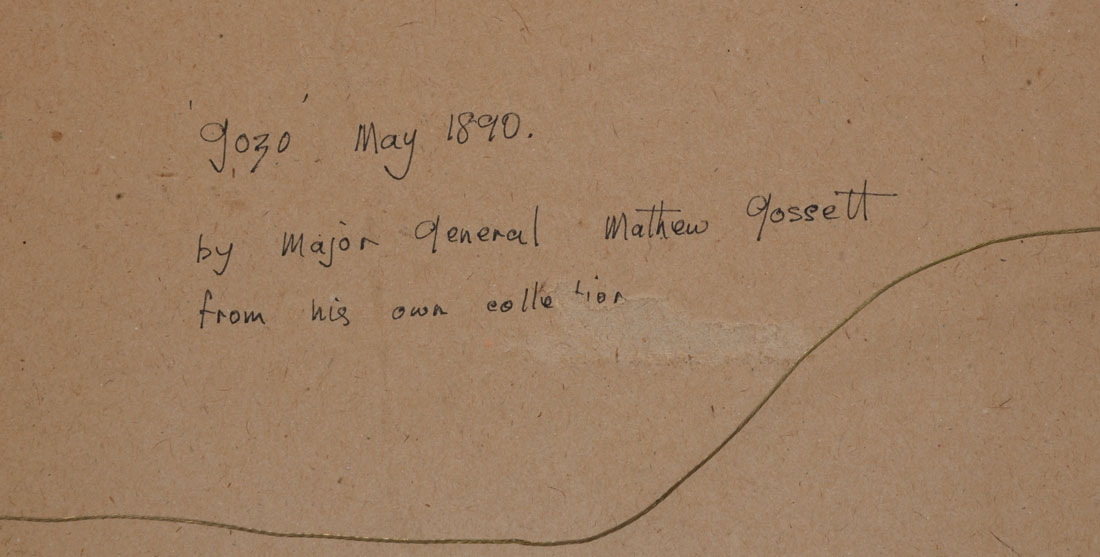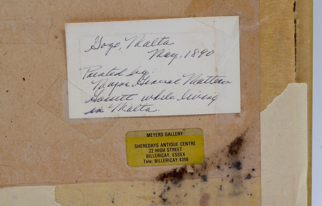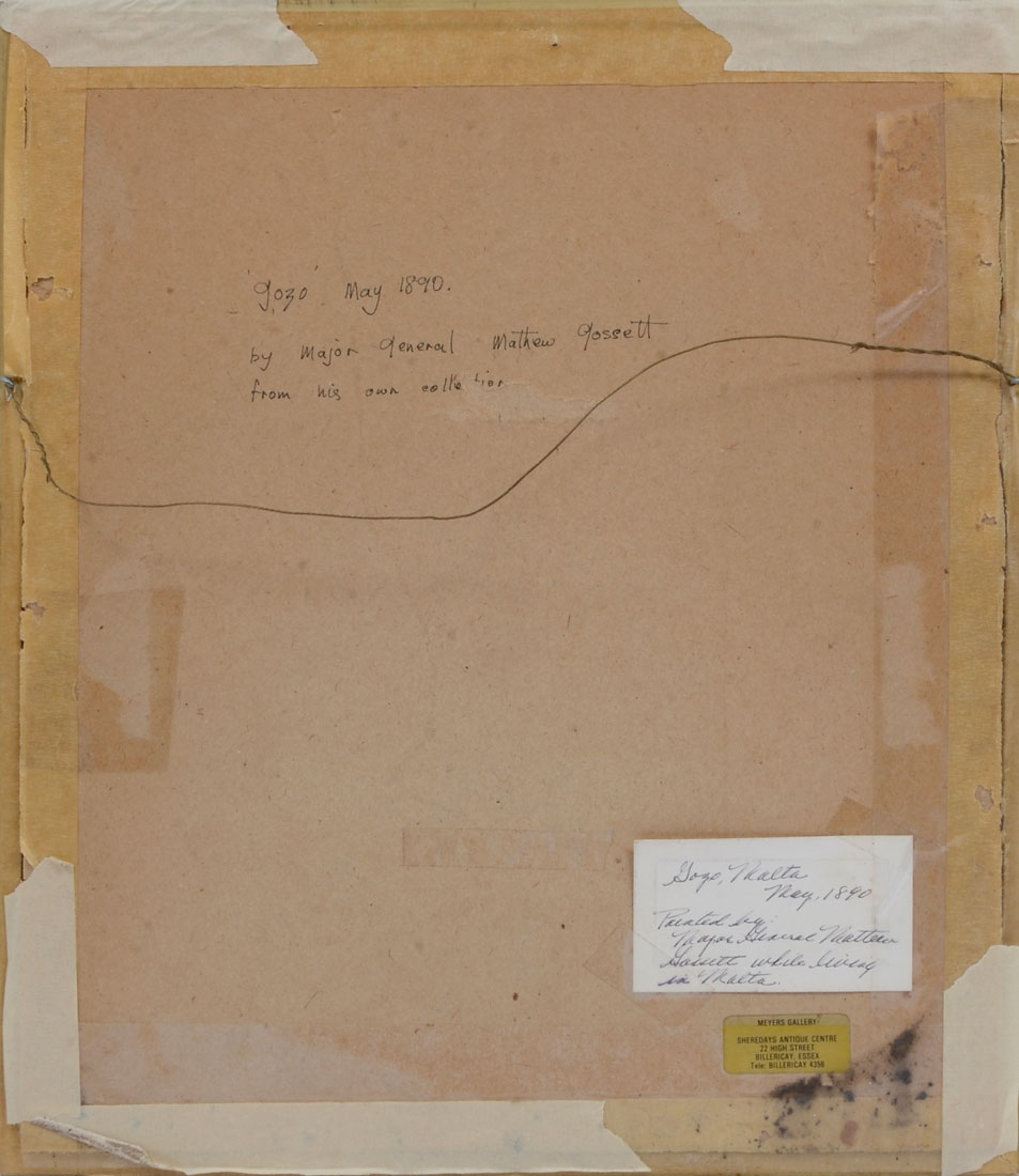 MALTA PAINTING BY MAJOR GENERAL MATTHEW GOSSETT: ''Malta Landscape'', Watercolor, sight size is 9.25'' x 7.25'', inscribed label verso ''Gozo, Malta May 1890'', painted by the Major General while he lived there, framed 15.50'' x 13''.