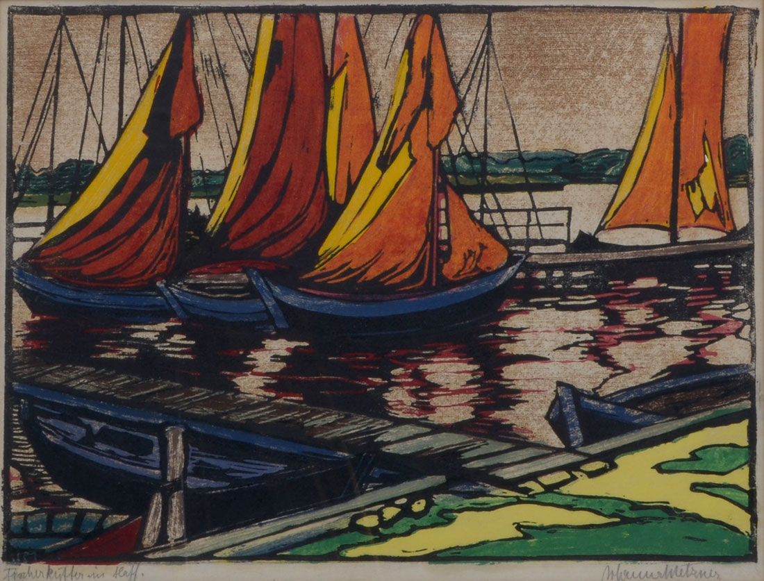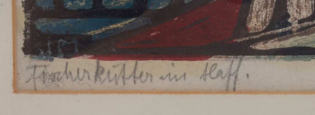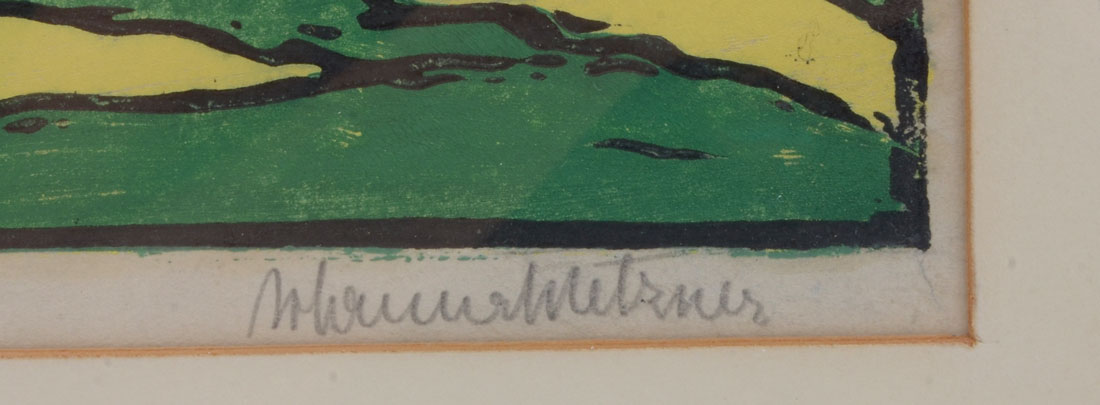 METZNER, Johanna, (German, 20th C): Harbor Scene, Woodcut, sight size 12'' x 16'', pencil signed lower right, titled in German lower left, framed, 20'' x 23''.