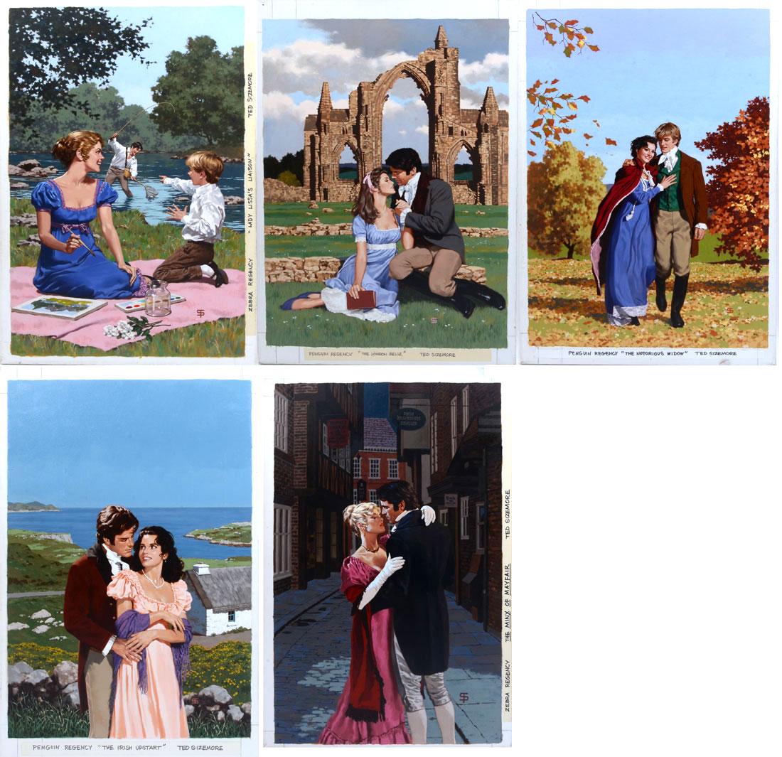 SIZEMORE, Ted, (American 20th Century): 5 Piece Lot to Include: 1) * ''The Minx of Mayfair''; 2) * ''Lady Lissa's Liason''; 3) * ''The London Belle''; 4) * ''The Notorious Widow''; 5) ''The Irish Upstart'', each painting is an Oil Stretched Over Canvas and measures 30'' x 20''. All have the artist monogram as well as the title and company for which the illustrations were created.