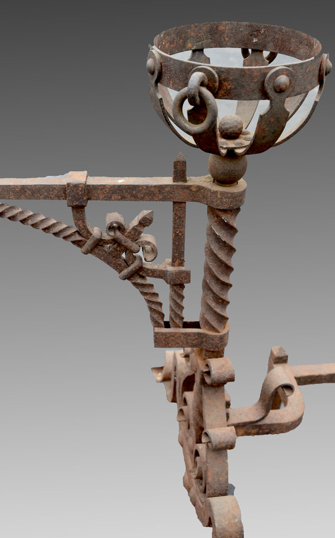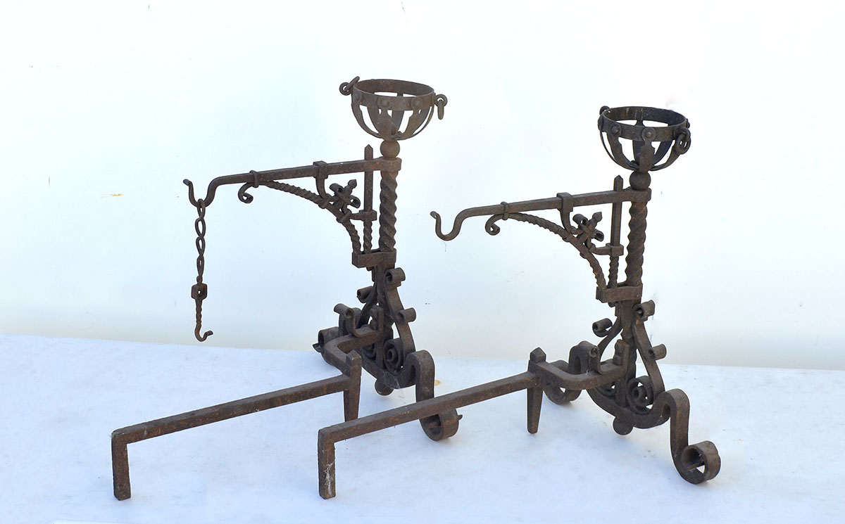PAIR GOTHIC REVIVAL WROUGHT IRON ANDIRONS: Basket form finials, twist shafts, scroll base and feet. Each with pot holder.