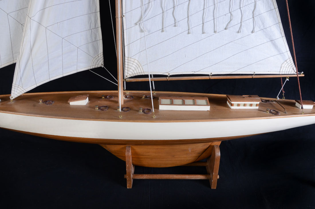 LARGE PAINTED WOOD MODEL SAIL POND BOAT: 20th century, top half of hull painted white, single mast, 3 cloth sails, approx. 71 1/2'' h. x 50'' x 9 1/4''.