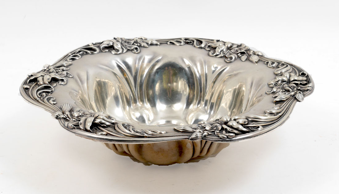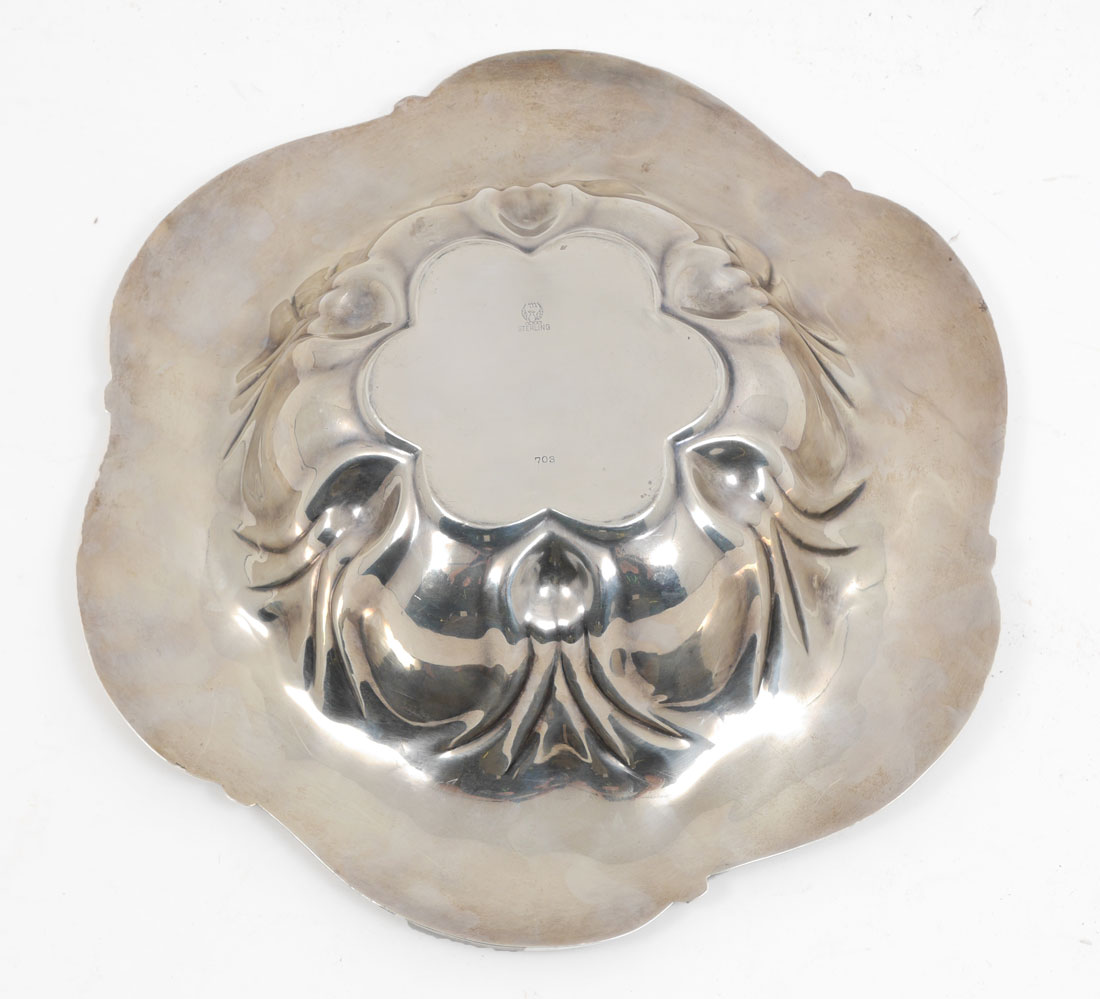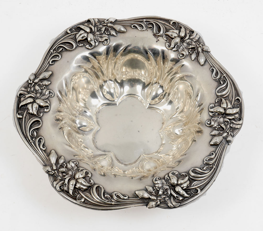 MERIDEN EMBOSSED STERLING FLORAL BOWL: Scalloped rim with embossed lilies motif, marked with Meriden hallmark, Sterling, 703. 2 3/4'' h. x 11''. Approx. 12.6 troy oz.