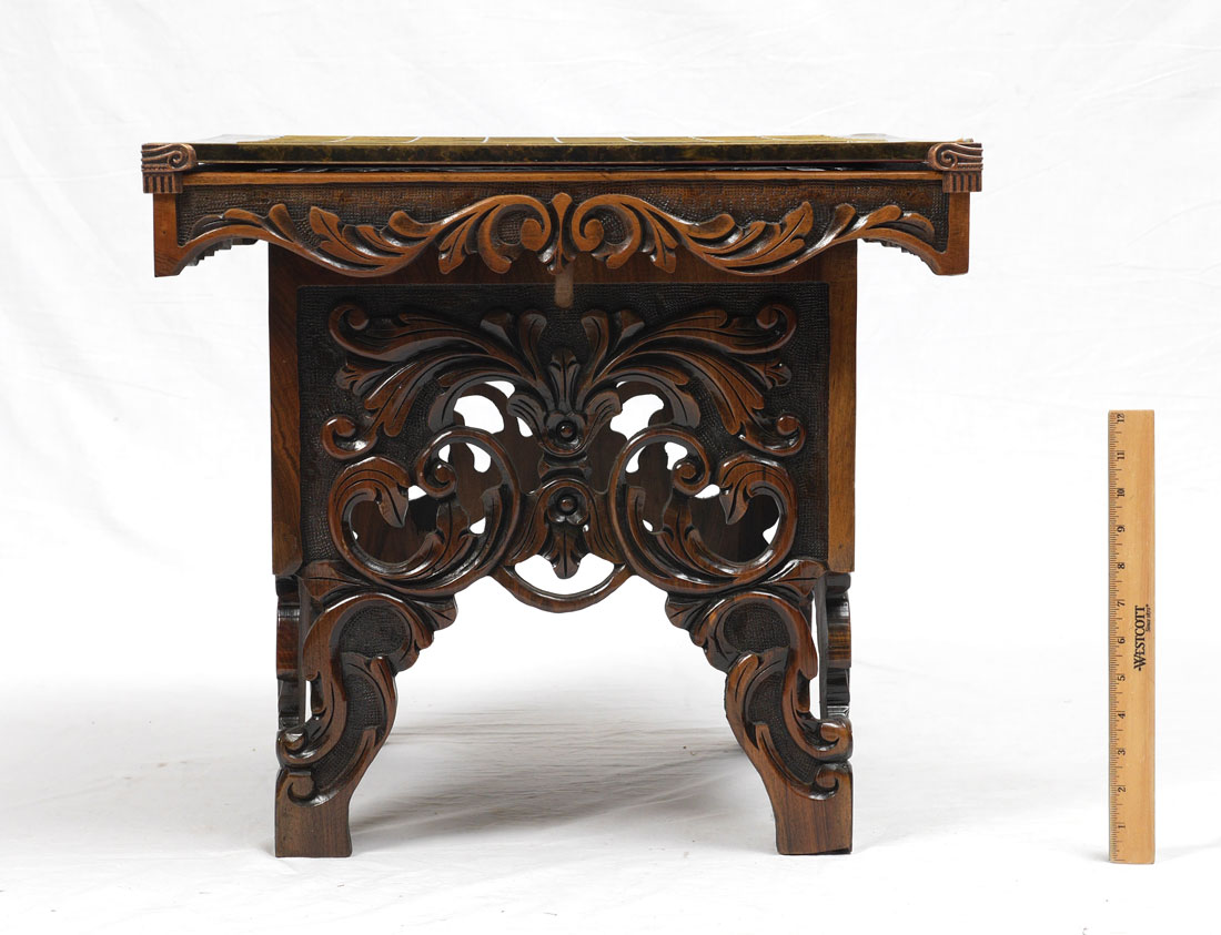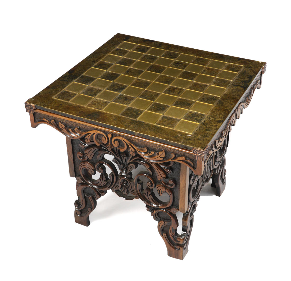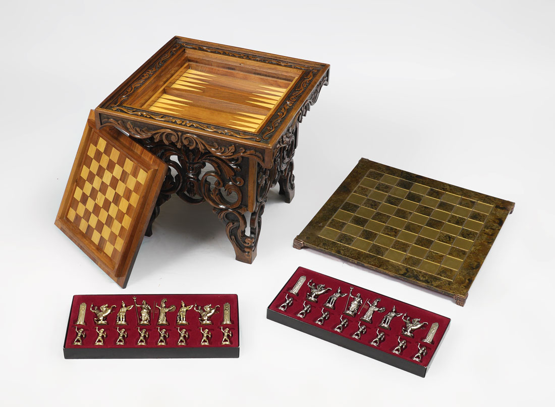 ROMAN ARMY CAST METAL CHESS SET AND TABLE: Cast metal pieces, footed board fits atop a carved wood table base. Table can be used as just a table as well. King holding trident (Poseidon?) measures 4 1/2'', table with board measures 19 1/2'' x 25'' square.