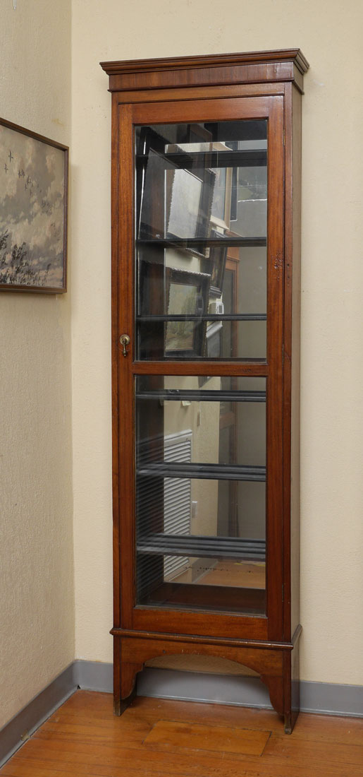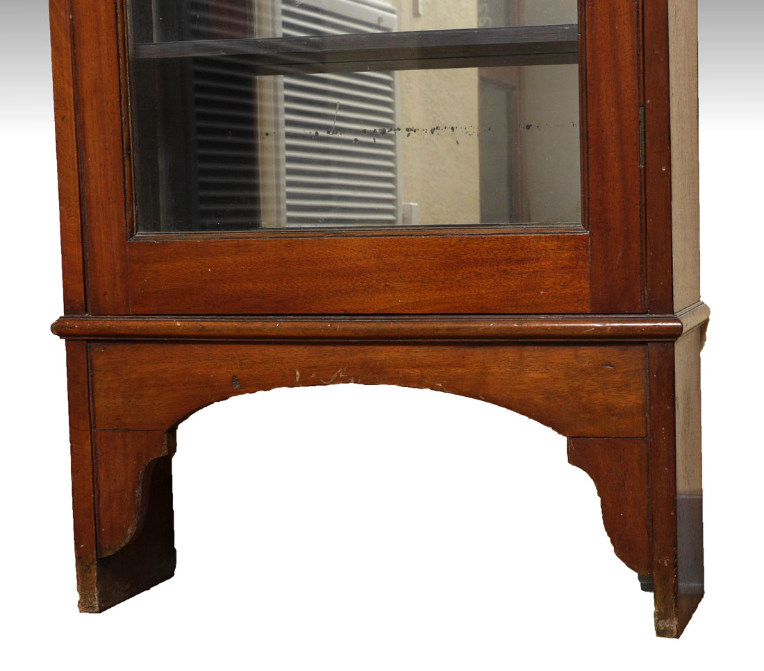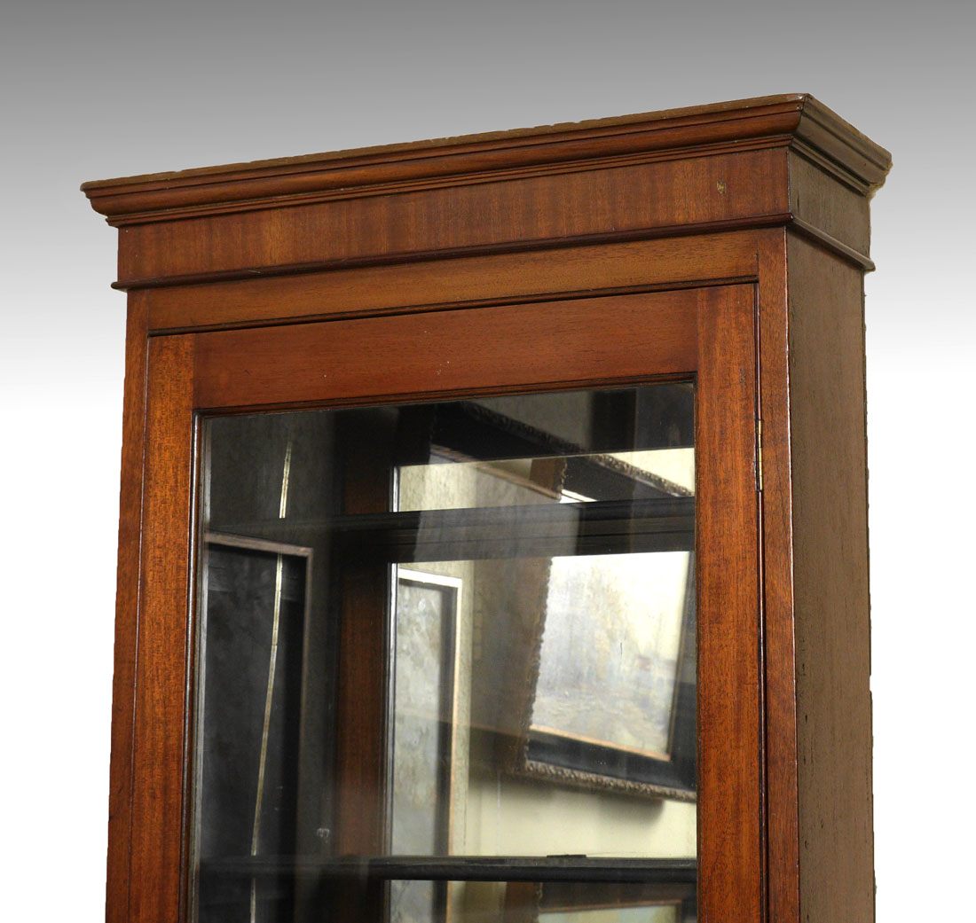 ANTIQUE BARBERSHOP SHAVING MUG CABINET: Molded pediment, mirror back, adjustable shelving, arched skirt, overall 82 1/2'' h. x 25'' x 8 1/4''.